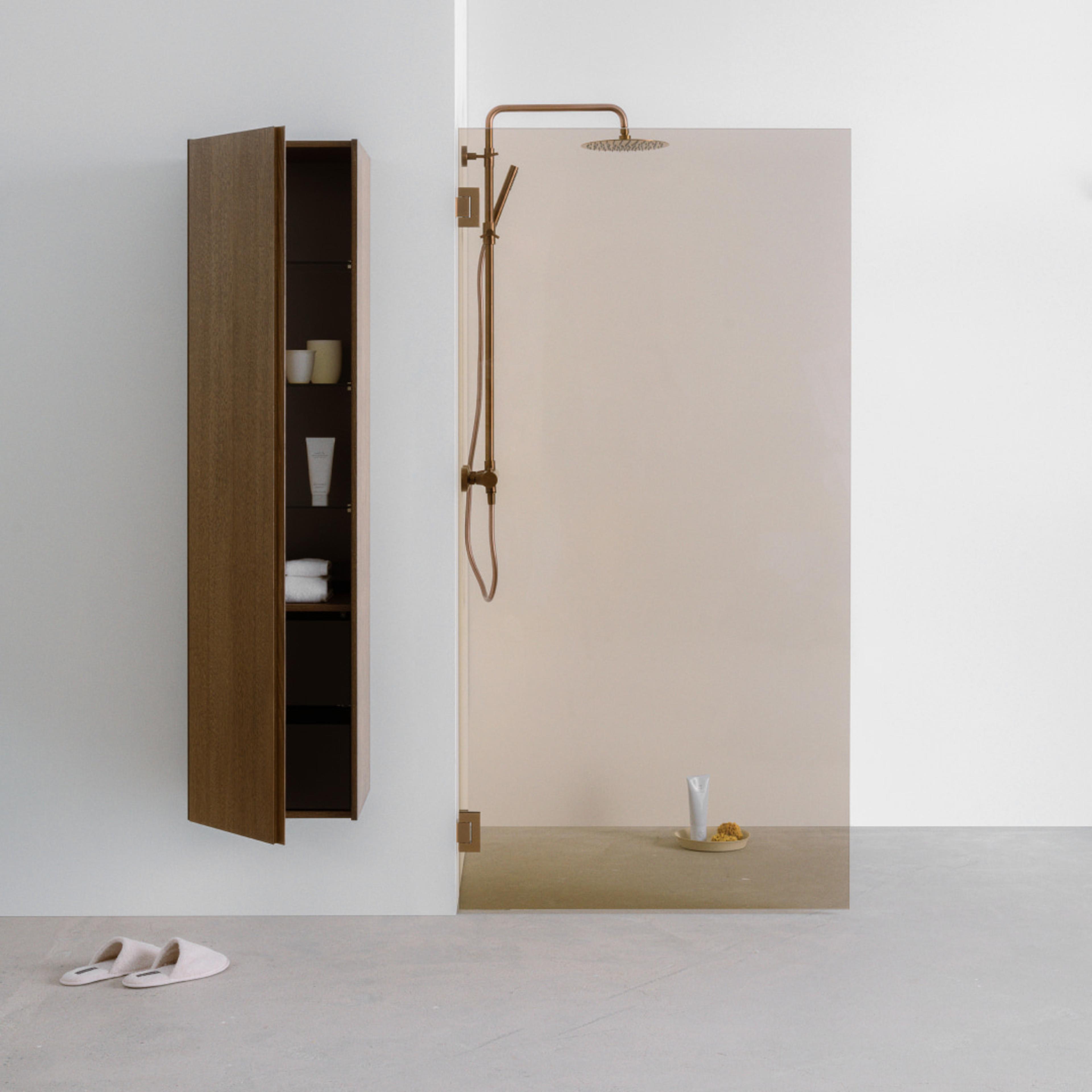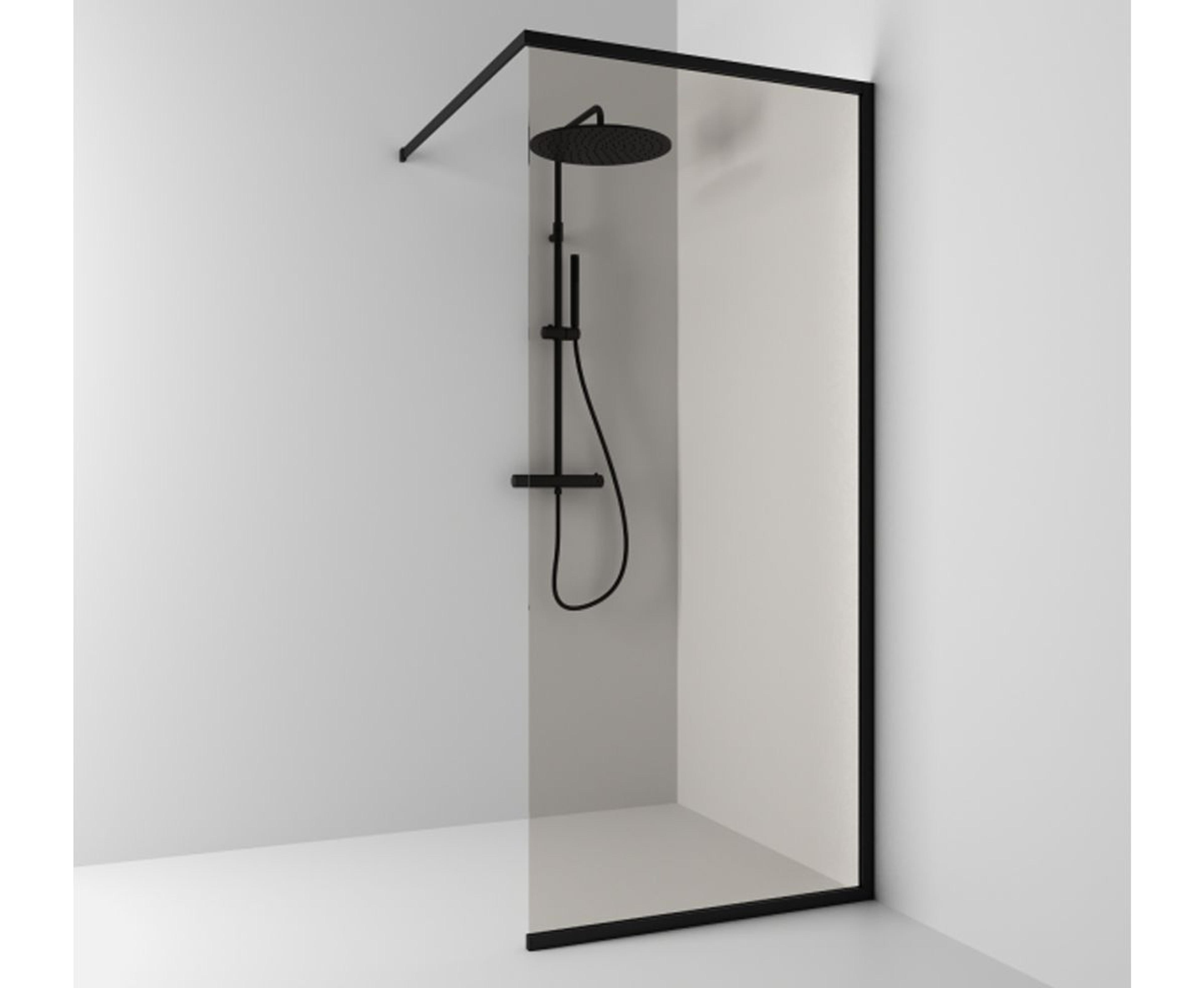 Langfoss skjermvegg fast 80 i bronsefarget glass med eloksert svart matt. Leveres komplett med draperingsstang (max 105 cm), vegg- og gulvprofil. Herdet sikkerhetsglass 6 mm. Mål: B: 80 H: 200 D: 3