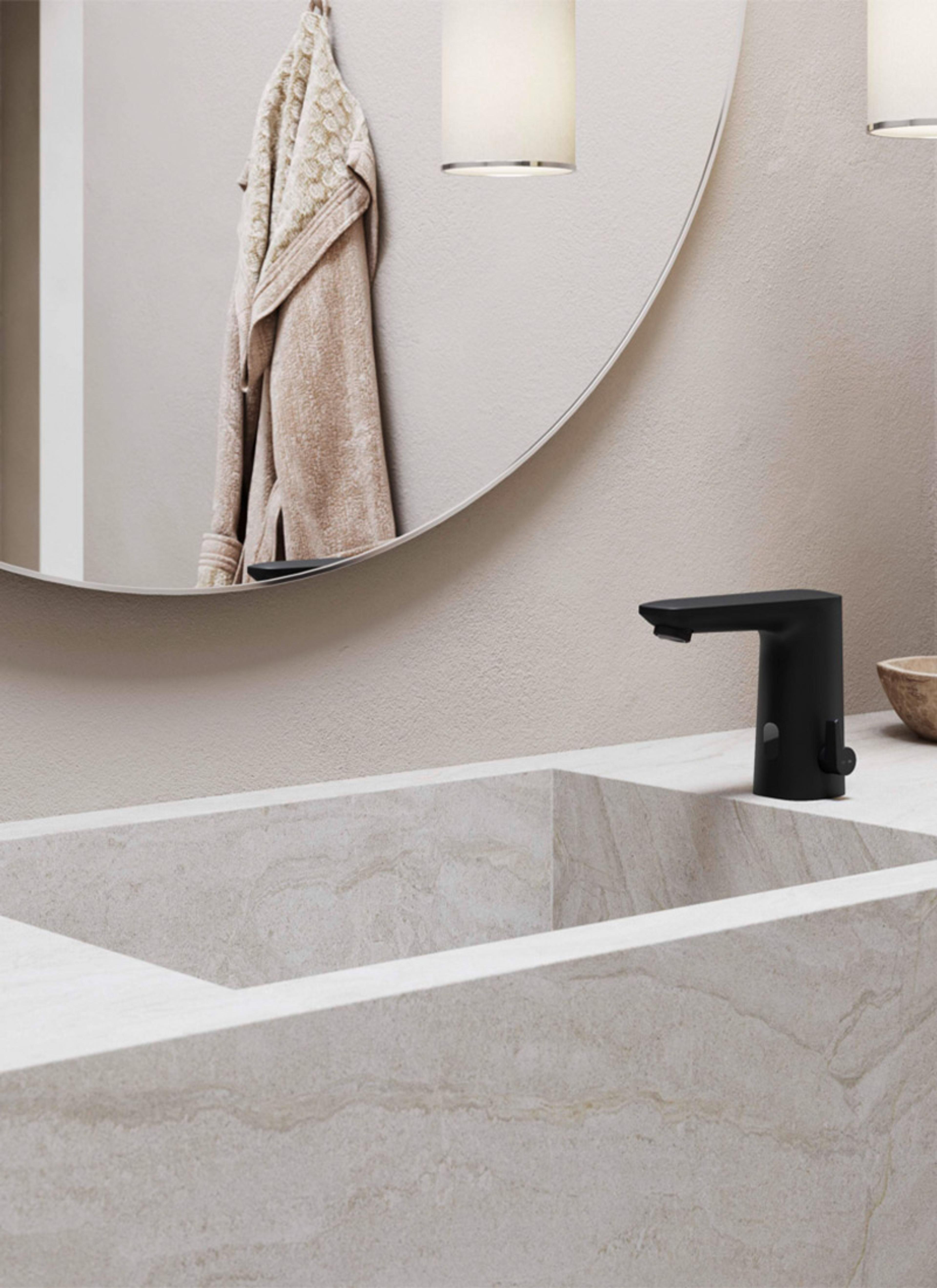 ALLSIDIG KRANSERIE: Avansert teknologi møter lekkert design i Oras sine Electra-modeller. Med det lekre designet kommer de til sin rett selv i de mest kresne hjem. Her ser du Oras Electra 92-Edge berøringsfri servantbatteri i sort matt. Den matte overflaten har en Nano-keramisk overflate som gjør den ekstra slitesterk og motstandsdyktig.