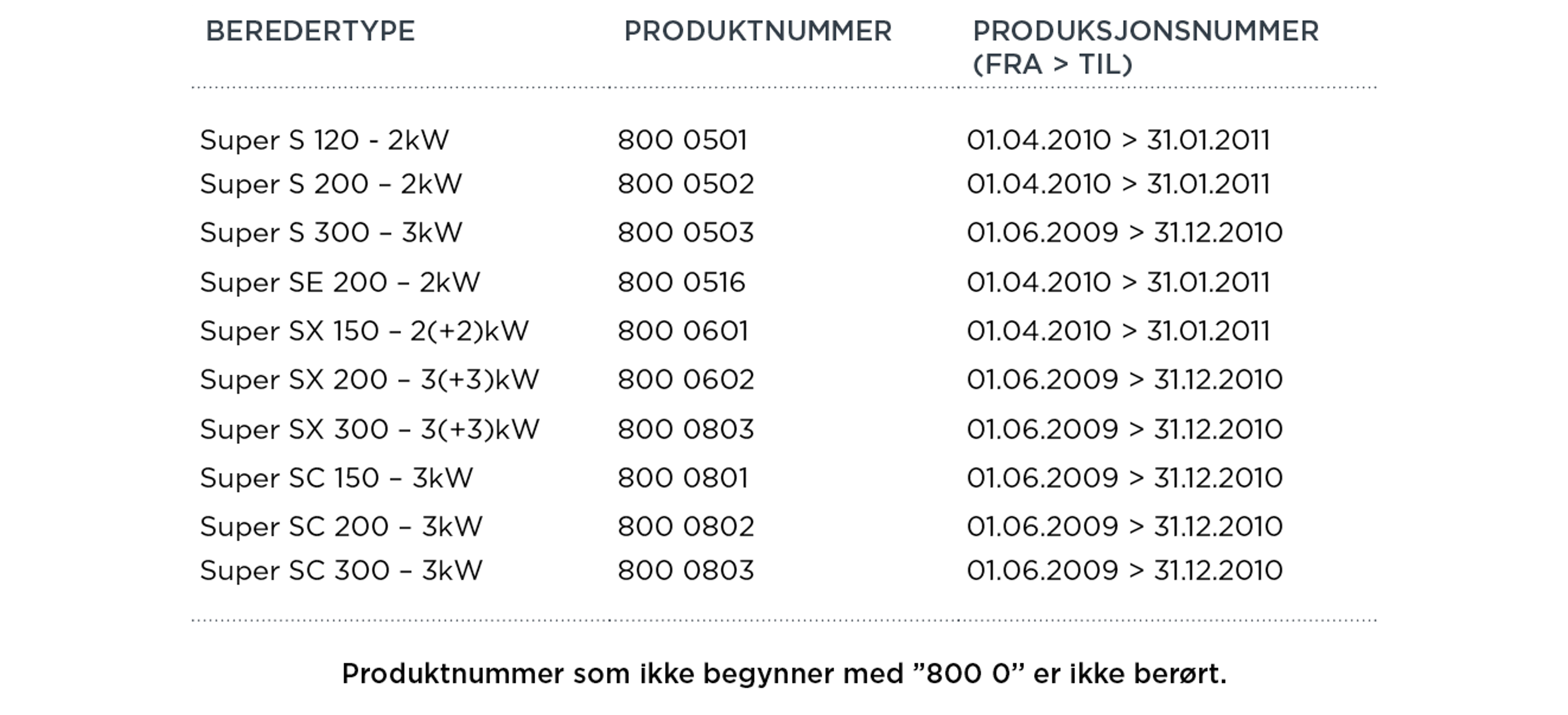 Om merkelappen på din OSO varmtvannsbereder stemmer overens med en av berederne på listen betyr det at varmtvannsberederen din har risiko for brannfarlig overoppheting. Dersom din varmtvannsbereder hjemme befinner seg på listen bør du kontakte OSO direkte. Da sender du produktnummer, produksjonsnummer, navn, adresse og telefonnummer på e-post til ledning@oso.no.