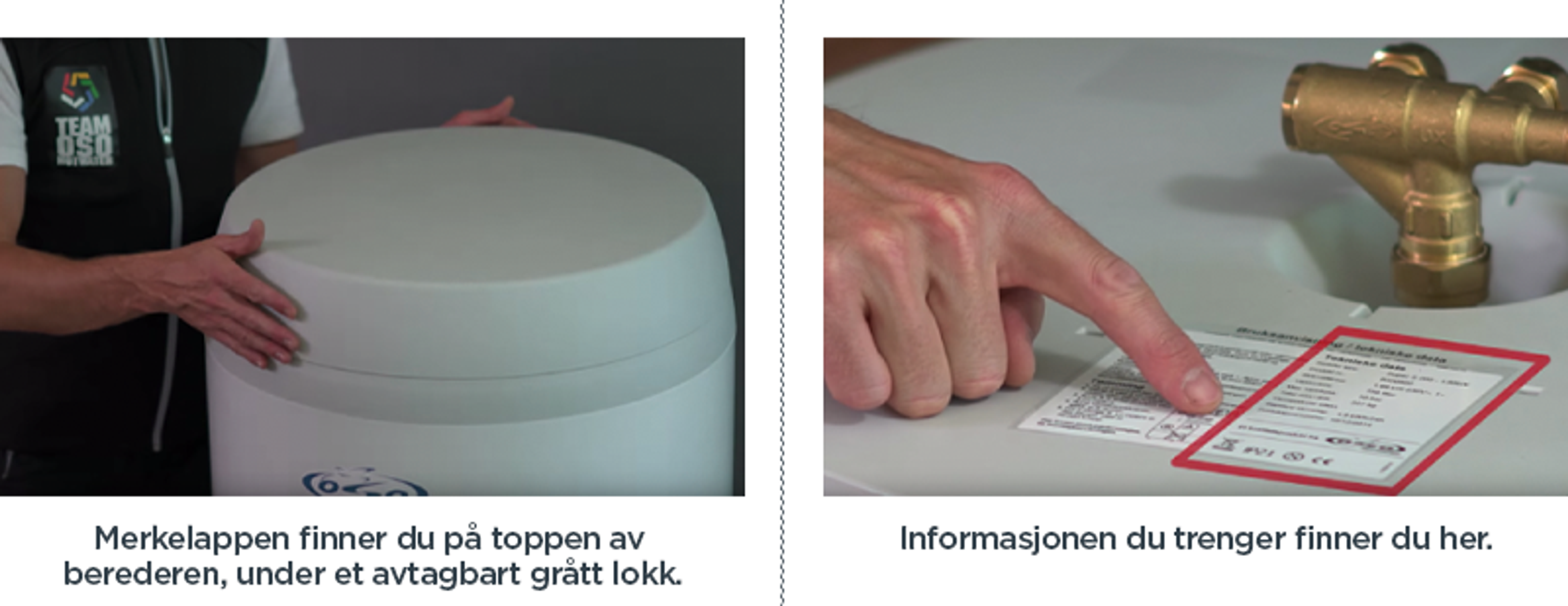 For å kontrollere om dette gjelder din varmtvannsbereder, bør du finne merkelappen på toppen av et avtagbar grått lokk på selve berederen. Sammenlign merkelappen med denne listen eller se bildet under.