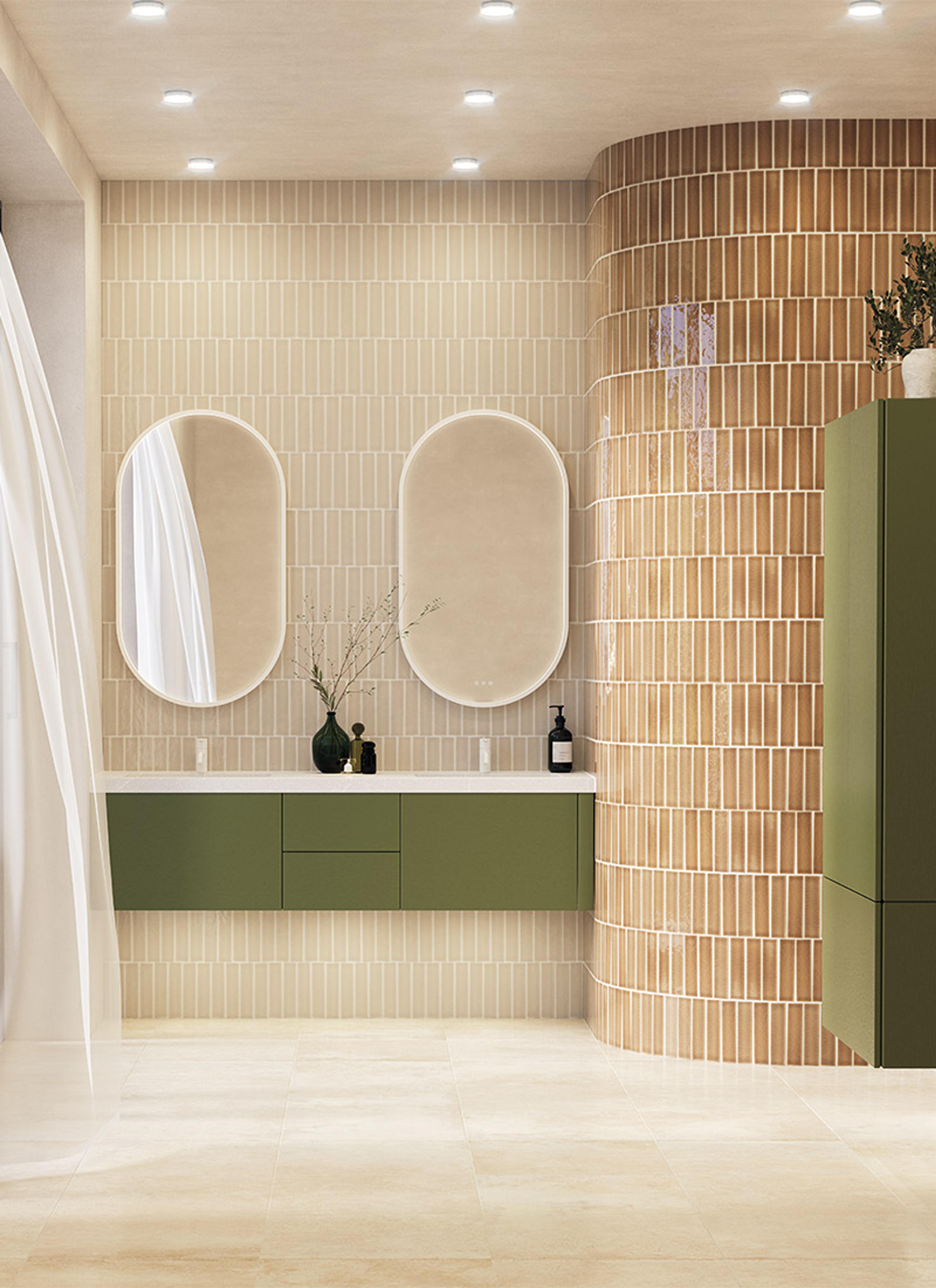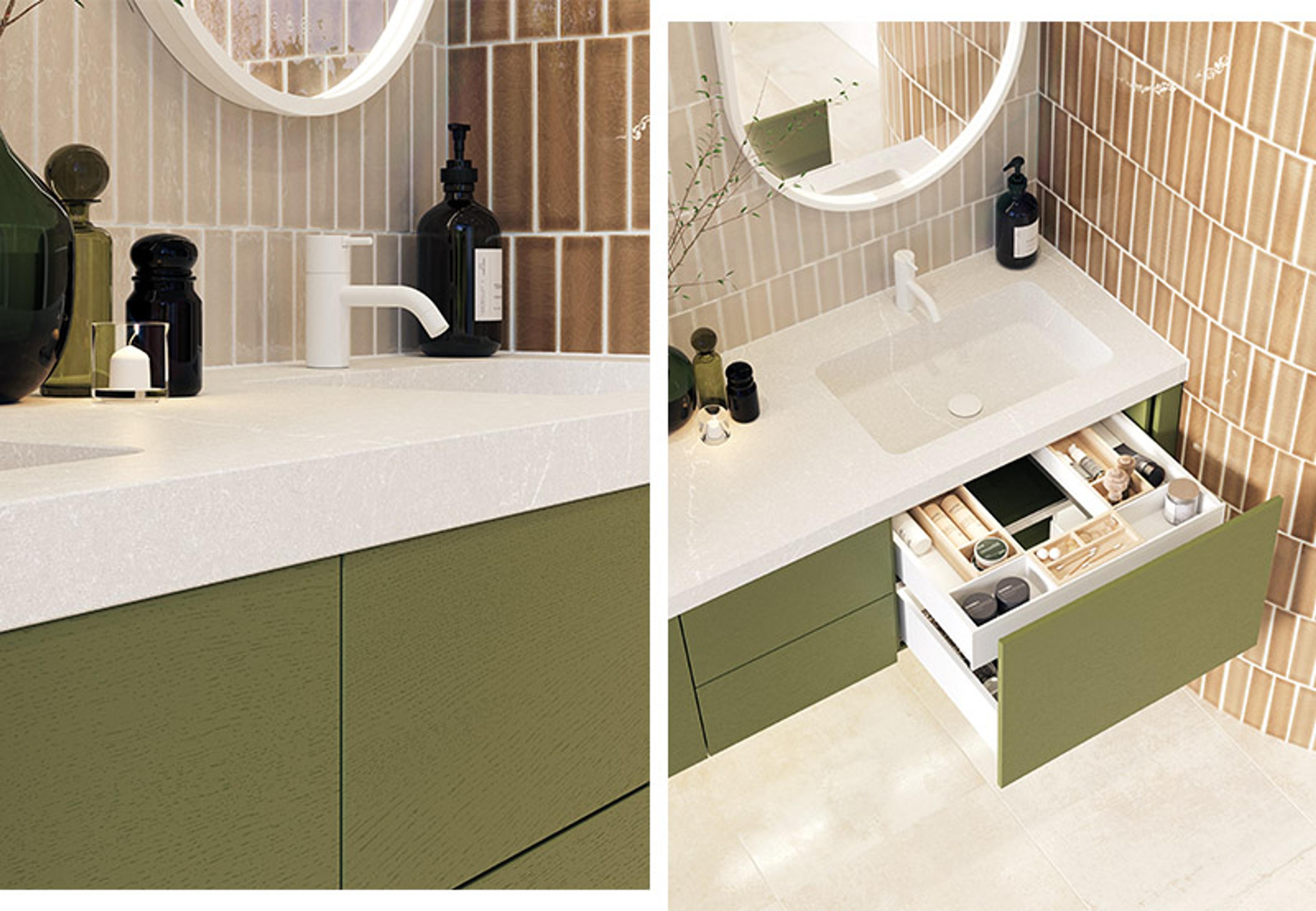 KJÆRLIGHET TIL TRE: Det er noe med å gli fingrene over treverk og kjenne treets liv og unike årestruktur. | Calidris baderomsinnredning 176 cm gjennomfarget finér i fargen Olive Green (NCS S 6020-G50Y) og Unique servant Silestone® bestilt etter mål | Ovalt Moon-speil med hvit matt ramme og lysstyring.