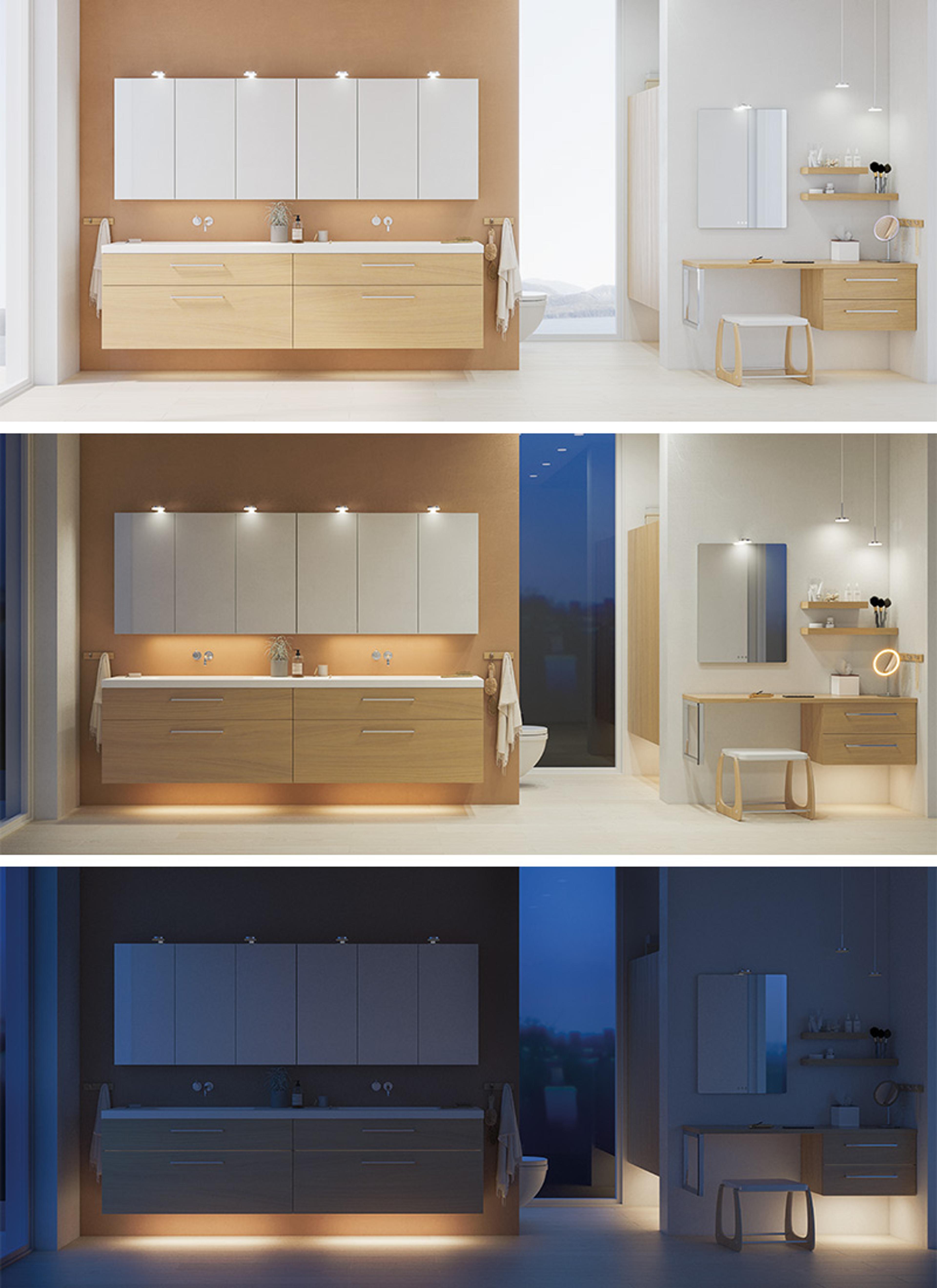 Dansani sine lysløsninger har selvfølgelig tenkt på dette. Lek med ulike lyskilder og tilpass belysningen til enhver anledning på baderommet. Lys i skuffer og skap samt i speil er med på å skape harmoni, og helhet, på badet.