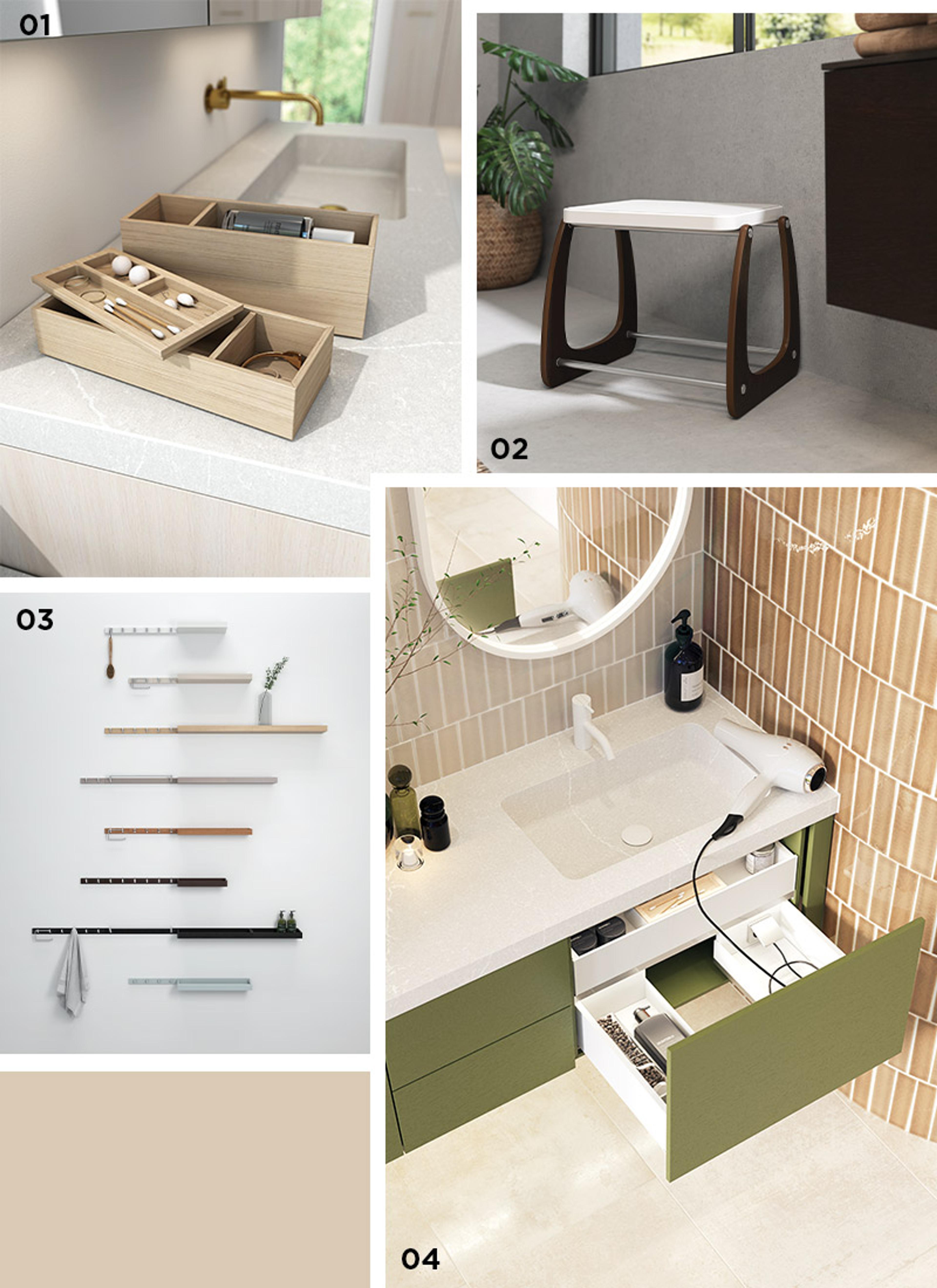 01 Trebrett med lokk i eik | 02 Krakk i mørk eik – kommer i hvit, ulike trenyanser og i valgfri farge | 03 Hylle og knaggrekke, finnes i forskjellige størrelser | 04 Praktisk skuffeinnredning med lys og stikkontakt.