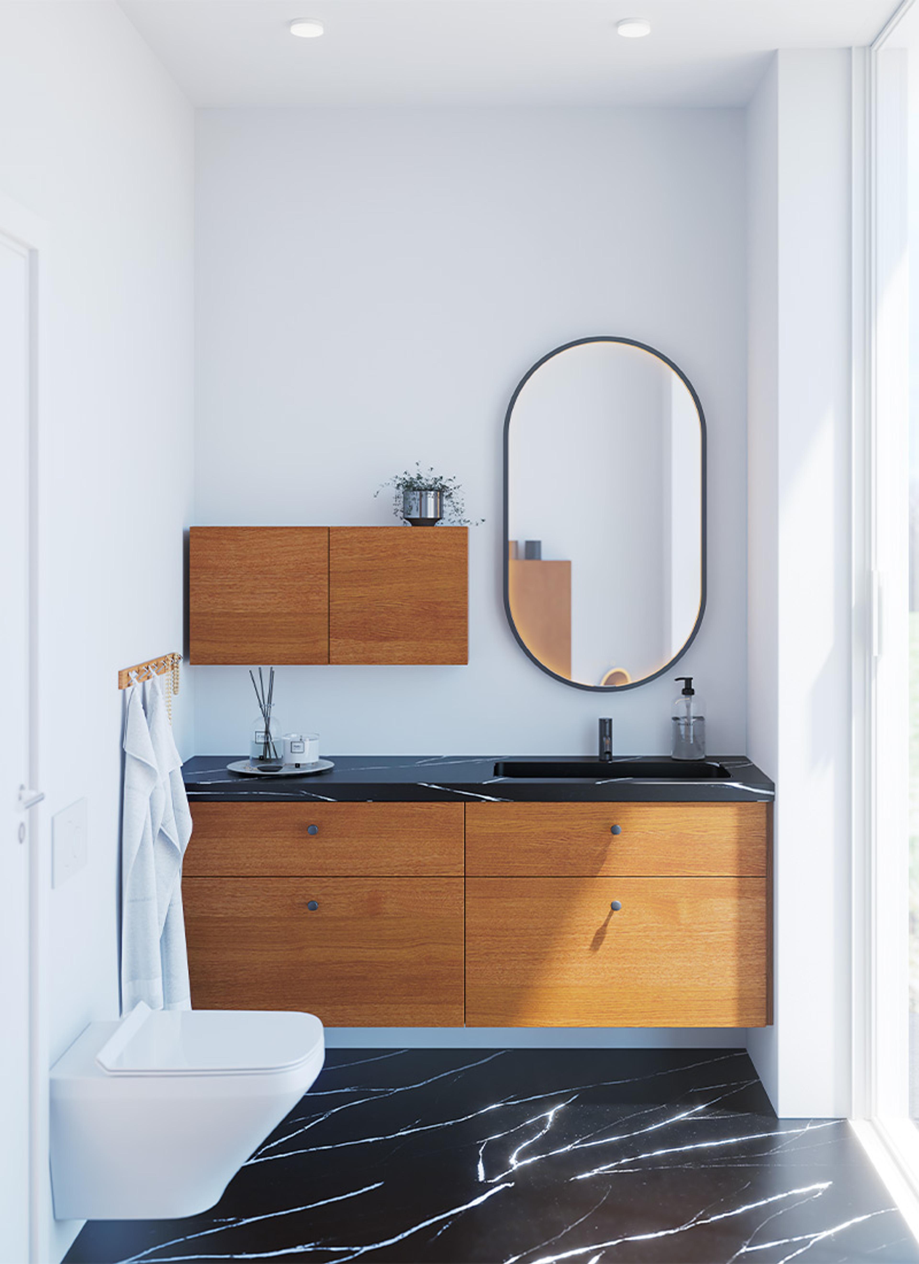 VAKKER OPPBEVARING: Oppbevaring trenger ikke å være kjedelig. Idé! Sett sammen skap i forskjellige høyder og skap en vakker og visuell oppbevaring. | Dansani Calidris 160 cm baderomsinnredning i rødbrun eik med Unique servant i Silestone® | Ovalt Moon-speil med hvit matt ramme og lysstyring | Ulike sideskap i rødbrun eik | Knaggrekke i lys eik.