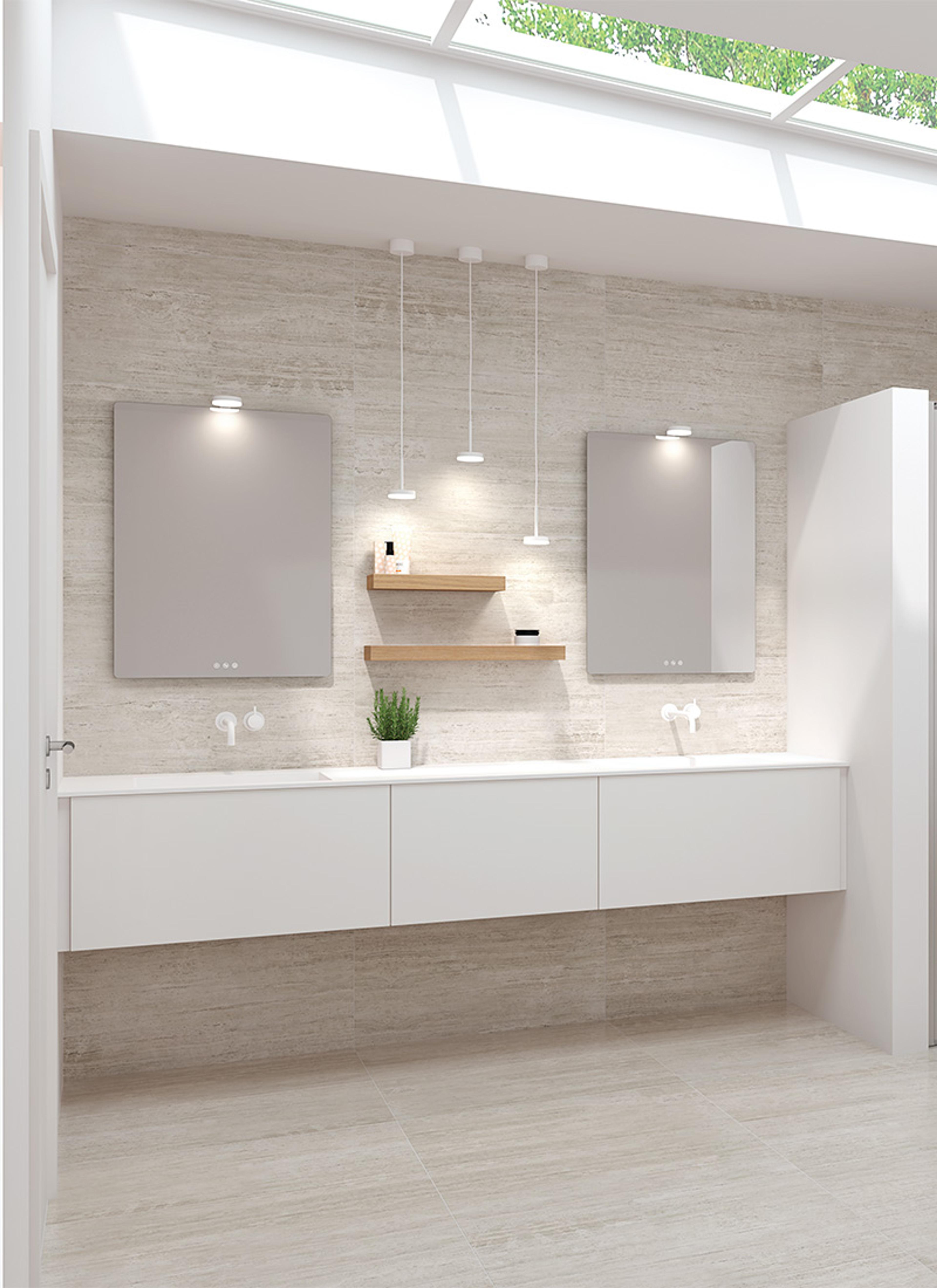 NATURLIG OG TIDLØST: Vi elsker når møbelet tilpasser seg rommet – og ikke omvendt. Hvis du velger servanten Shape i kompositt-materiale, kan denne bestilles etter mål. Tykkelsen er bare 12 mm, og gir et fløyelsmykt og minimalistisk uttrykk | Dansani Calidris baderomsinnredning 230 cm i hvit matt med Shape dobbel servant | Soft speil med Jupiter-lampe og pendelbelysning.