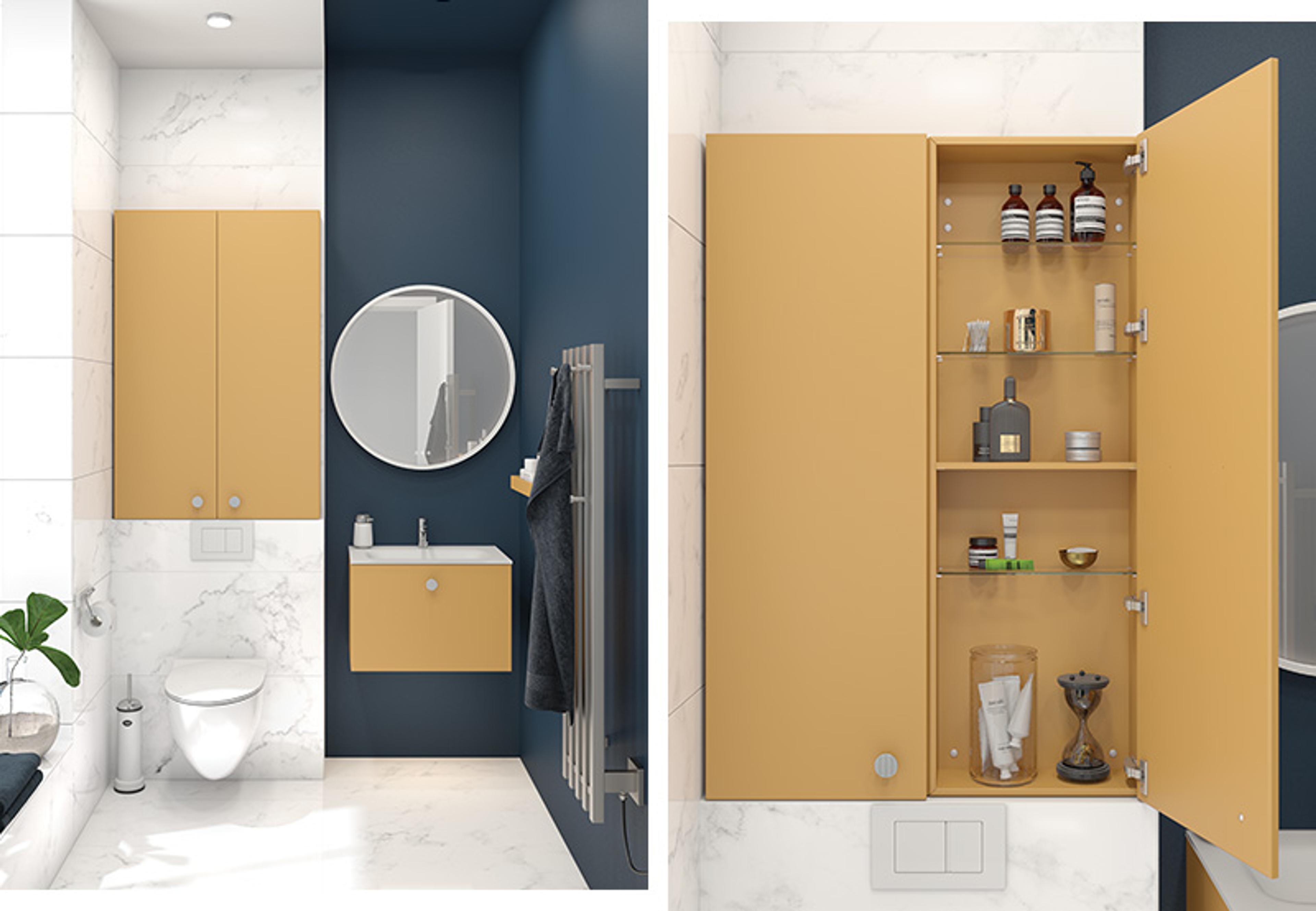 LUKSUS KOMMER I ALLE STØRRELSER: Har du et lite bad er det lurt å utnytte veggplassen. Et godt tips er å bruke plassen over toalettet til oppbevaringen. | Dansani Calidris 60 cm baderomsinnredning med Form servant i glass og i fargen Rich Yellow (NCS S 3030-Y20R) | Rundt Moon-speil med hvit matt ramme og lysstyring.