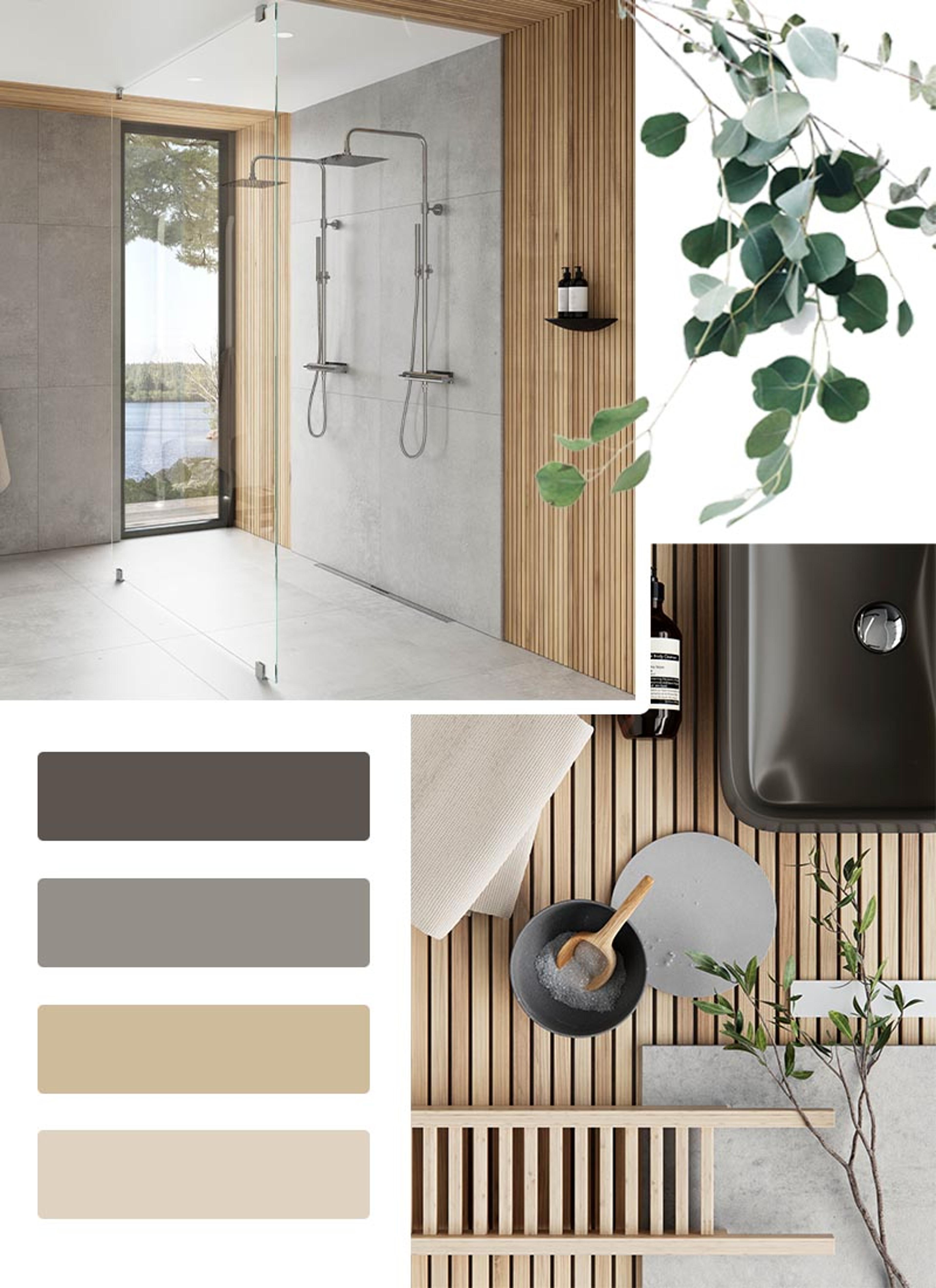 FINN DIN STIL: et godt tips når du skal pusse opp er å lage deg et inspirasjonskart eller moodboard med farger, materialer, og farger du liker godt - på den måten er det lettere å få ønsket uttrykk. | Øverst til høyre ser du dusjløsningen ARC 43 fra INR