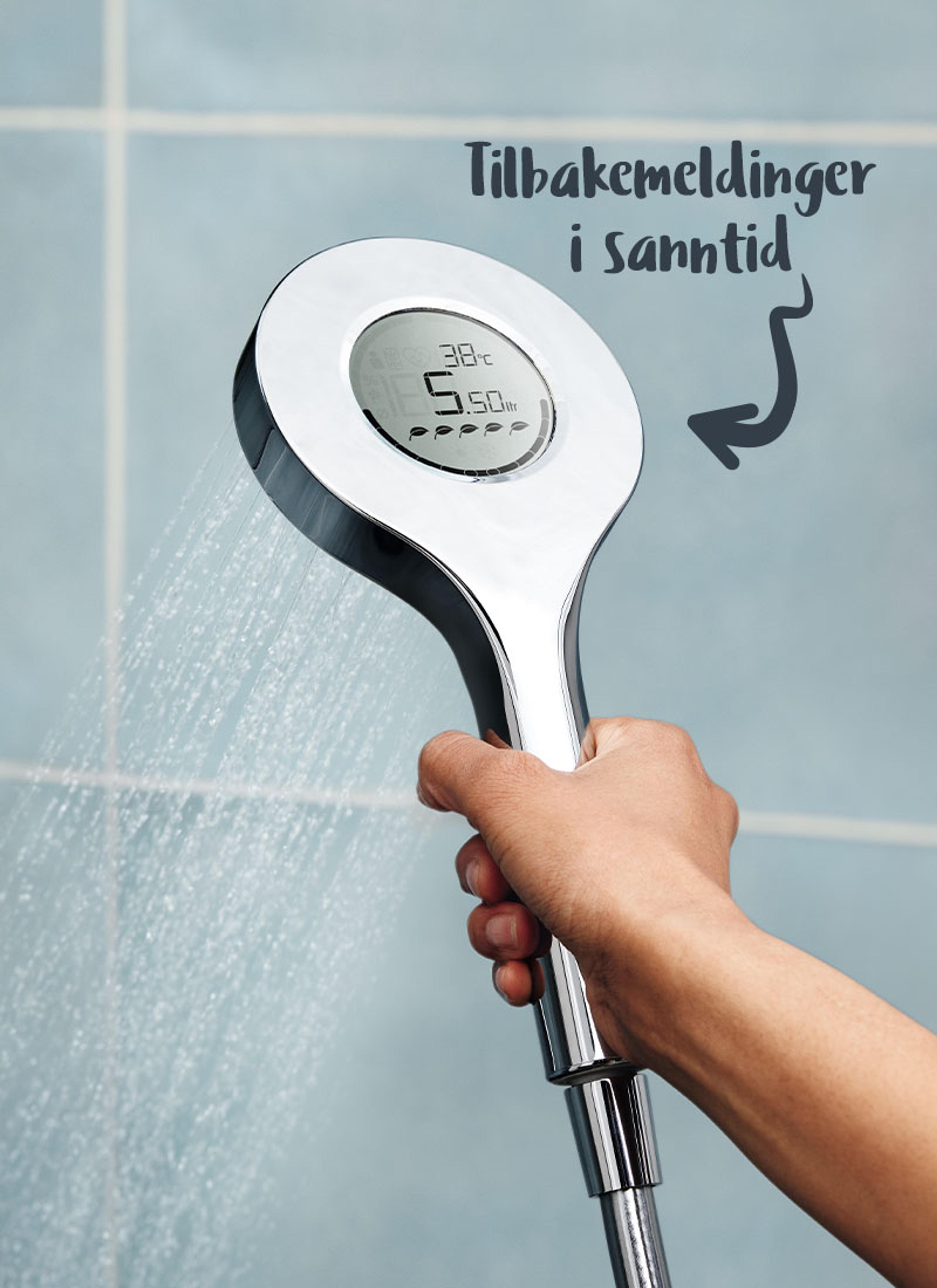 Oras Hydractiva digital hånddusj er designet for å hjelpe deg med, nettopp det, å spare vann med minimal innsats. Den integrerte skjermen gir deg nemlig tilbakemelding i sanntid om vann- energiforbruket ditt.