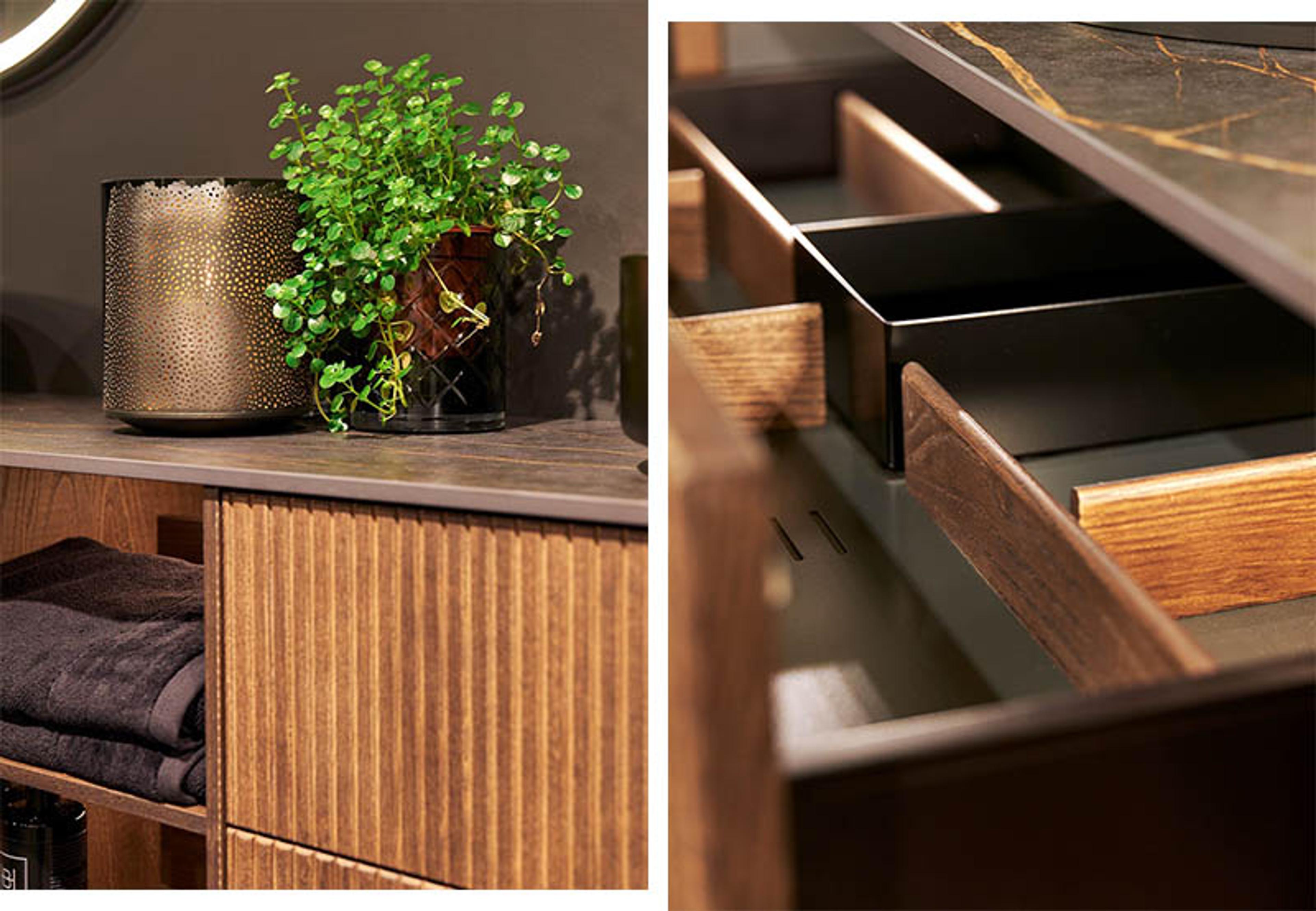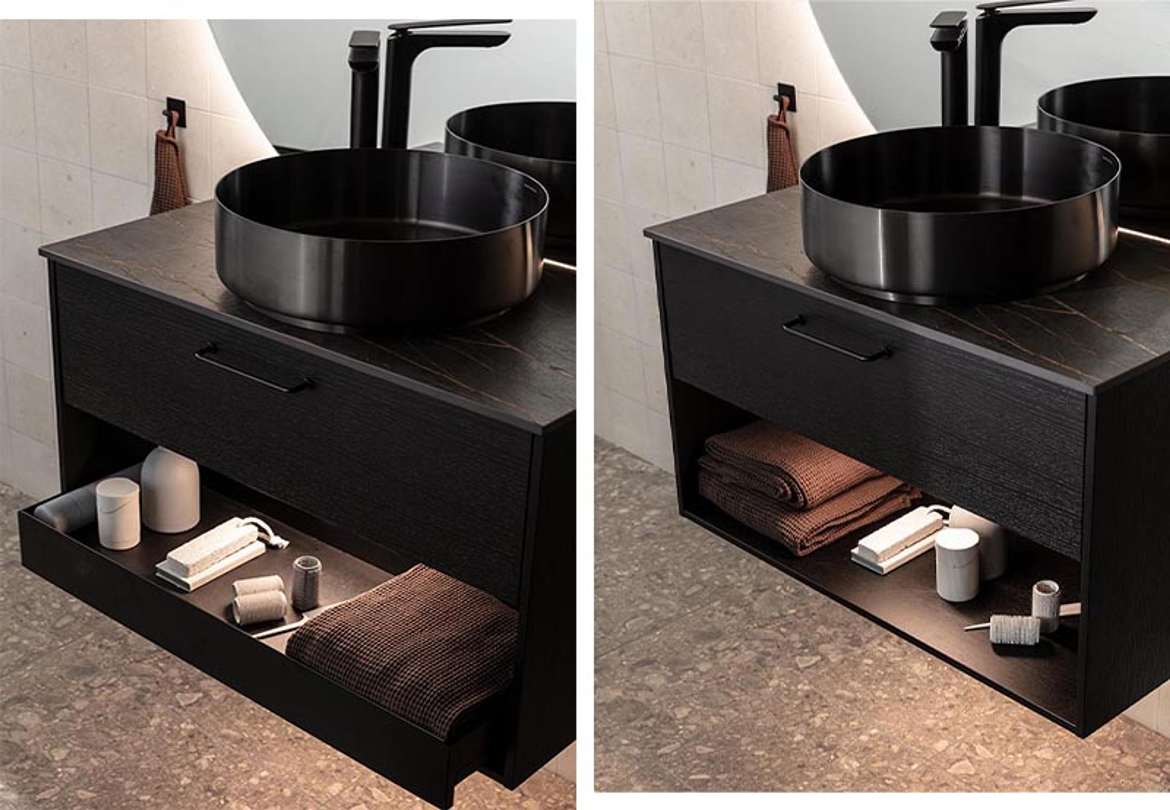VALGFRIHET MED EPOS: La deg inspirere og prøv deg frem for å finne den perfekte og mest personlige løsningen for nettopp din smak, ditt baderom og dine behov. Du velger selv om du vil ha skuffer eller åpen oppbevaring. Eller kanskje begge deler? | Svedbergs Epos by Halvor Bakke baderomsmøbel i brun ask