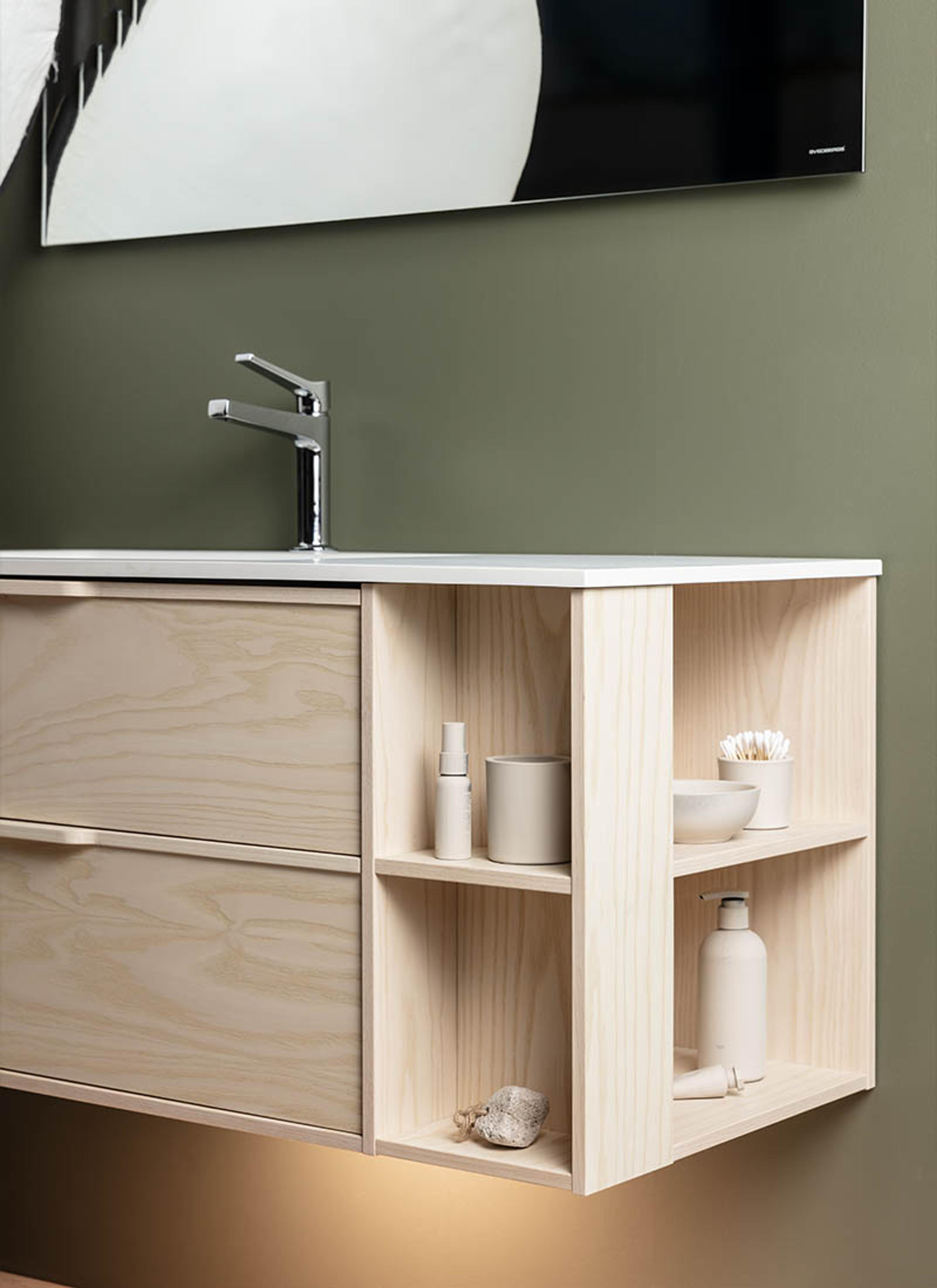 – Dette har vært et kjempespennende prosjekt der valgfrihet har vært et nøkkelord gjennom hele prosessen. Jeg er veldig fornøyd med resultatet. Man kan velge ulike fronter og farger, og den åpne oppbevaringen gir plass for kremer, levende lys eller noe fra naturen. Det viktigste for meg har likevel vært at møblene får baderommet til å føles koselig og varmt. Det er et sted som skal gi energi og lyst.