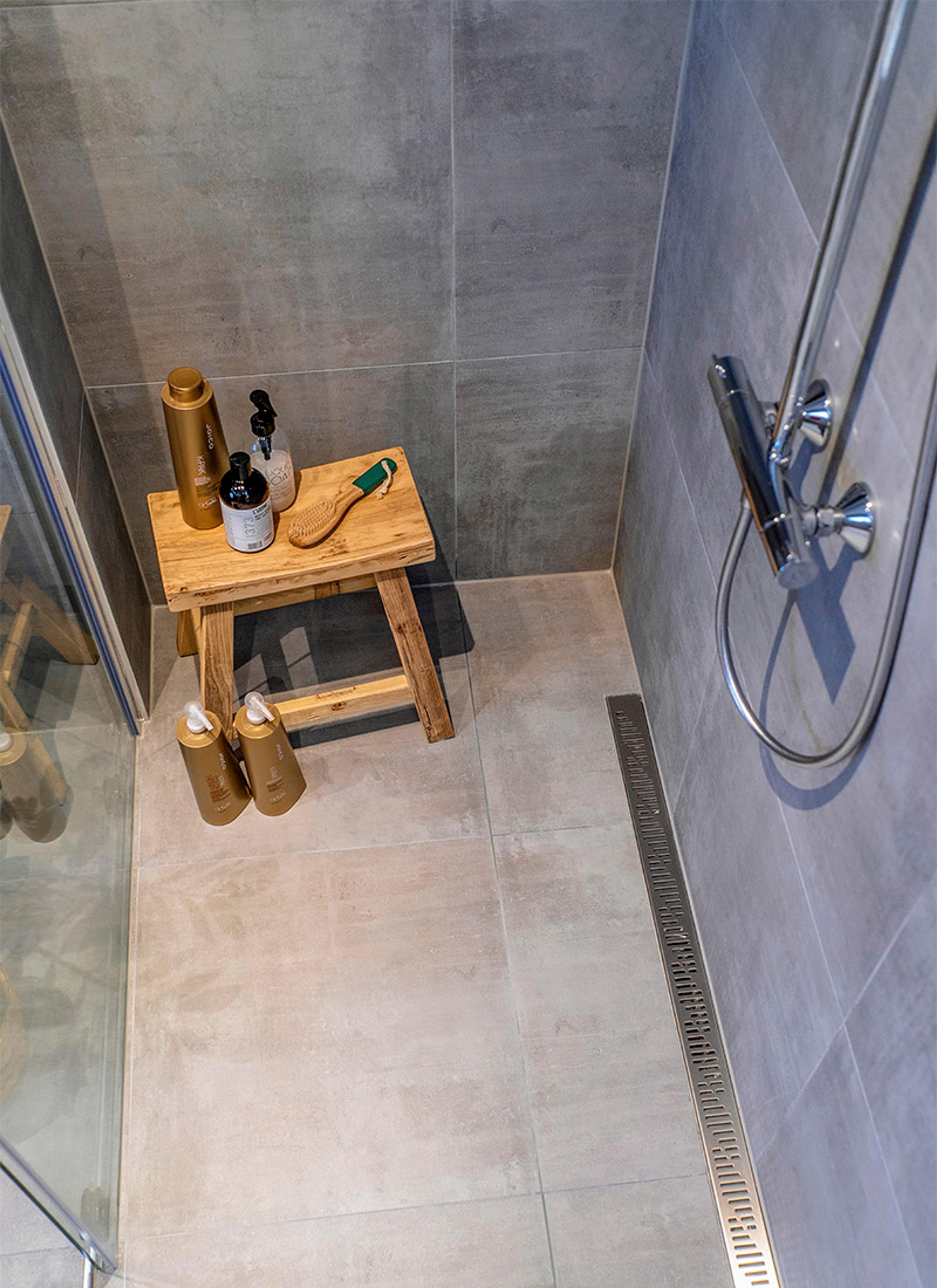 Badet er blitt akkurat det det skulle bli. Et drømmebad. Og et sted Marianne og Lasse stortrives. Badstuen fikk en minimal oppgradering med nytt sluk og nye fliser, mens på badet er alt nytt.