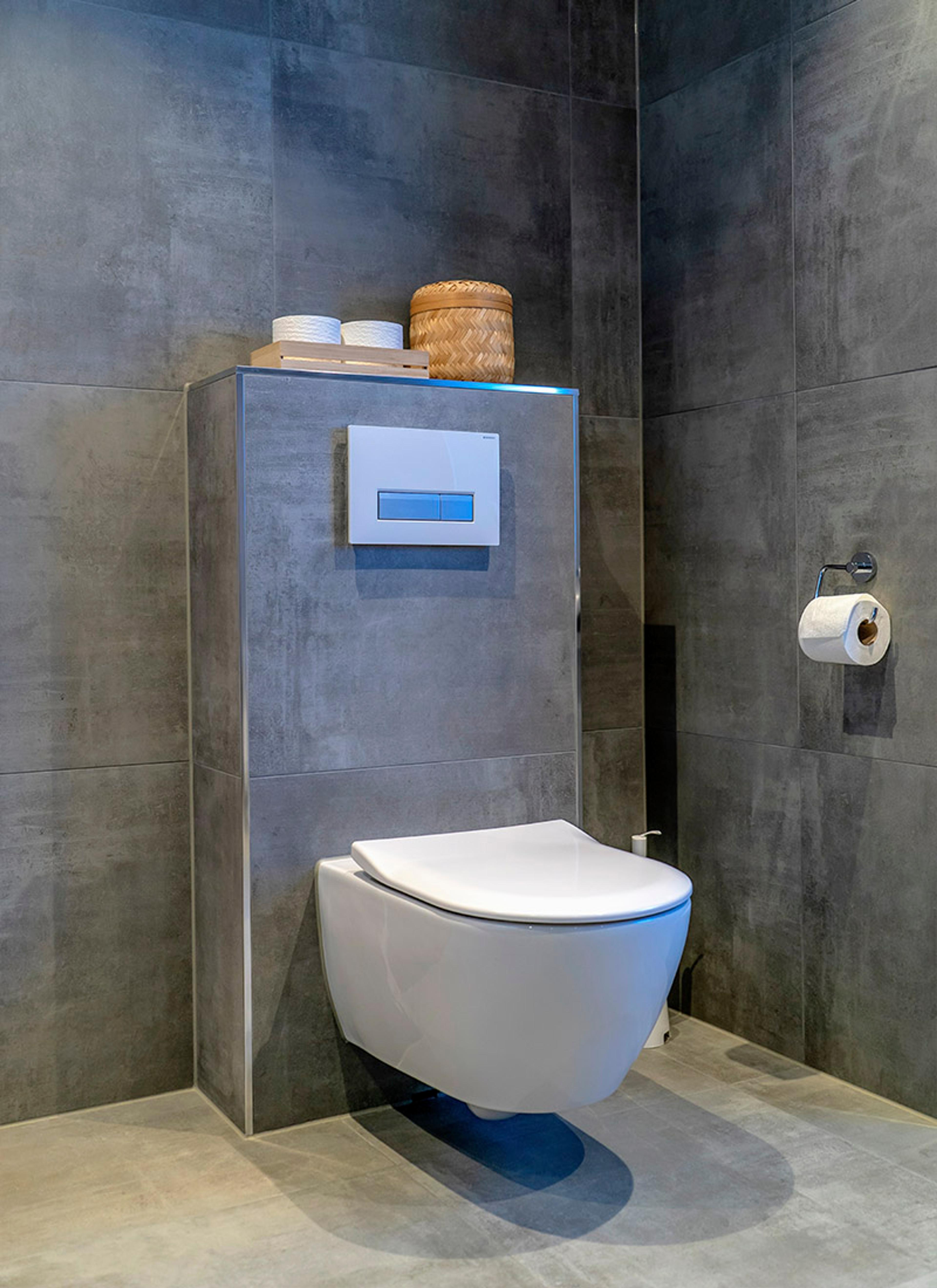 Bak fasaden skjuler det seg smart teknologi - nemlig en innbyggingssisterne som fjerner vond lukt! | Villeroy & Boch Subway 2.0 vegghengt toalett | Geberit betjeningsplate