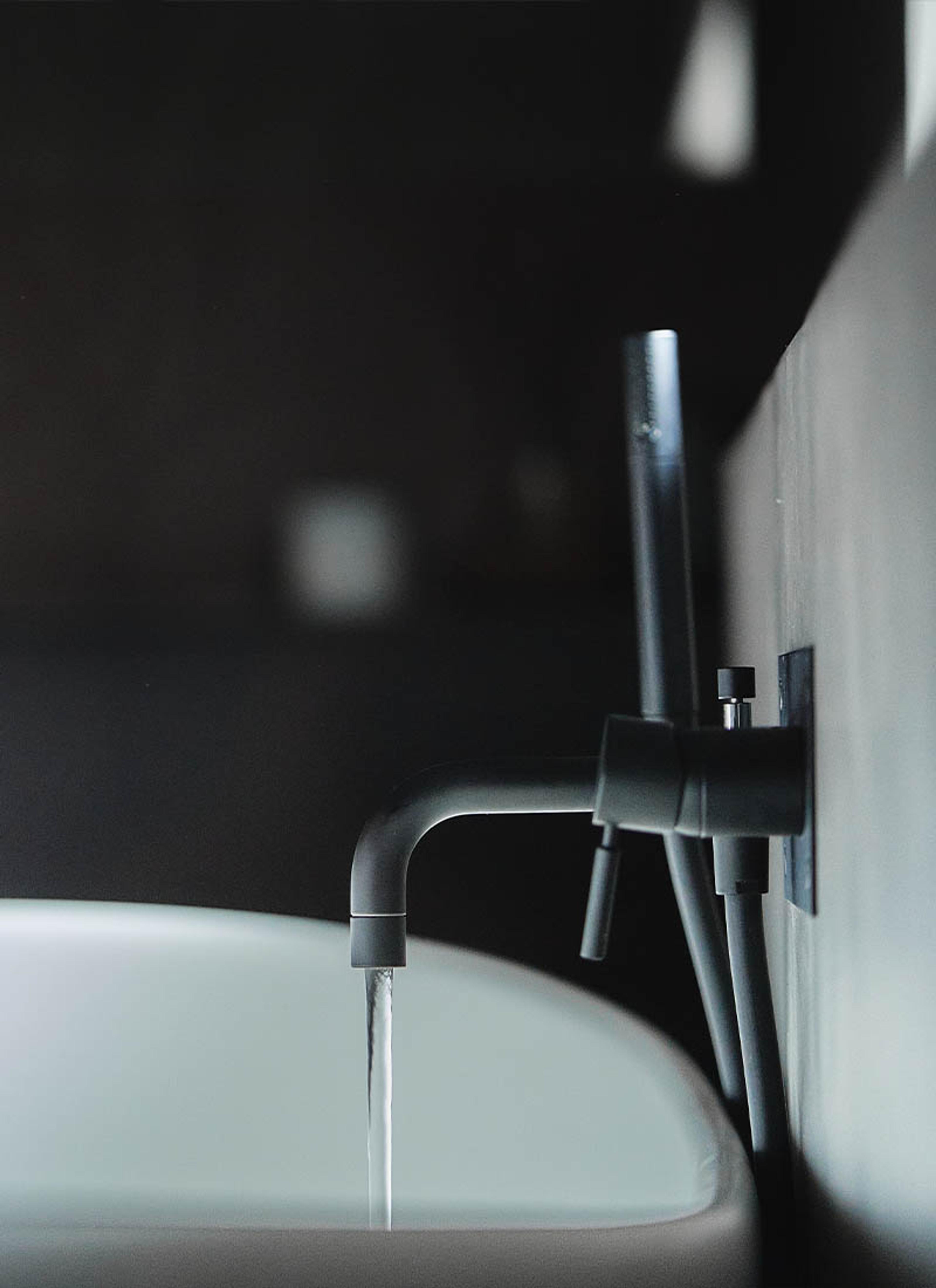 Alle blandebatteriene på badet er innebygd og i overflaten sort matt, noe som skaper et fint og eksklusivt helhetsinntrykk.