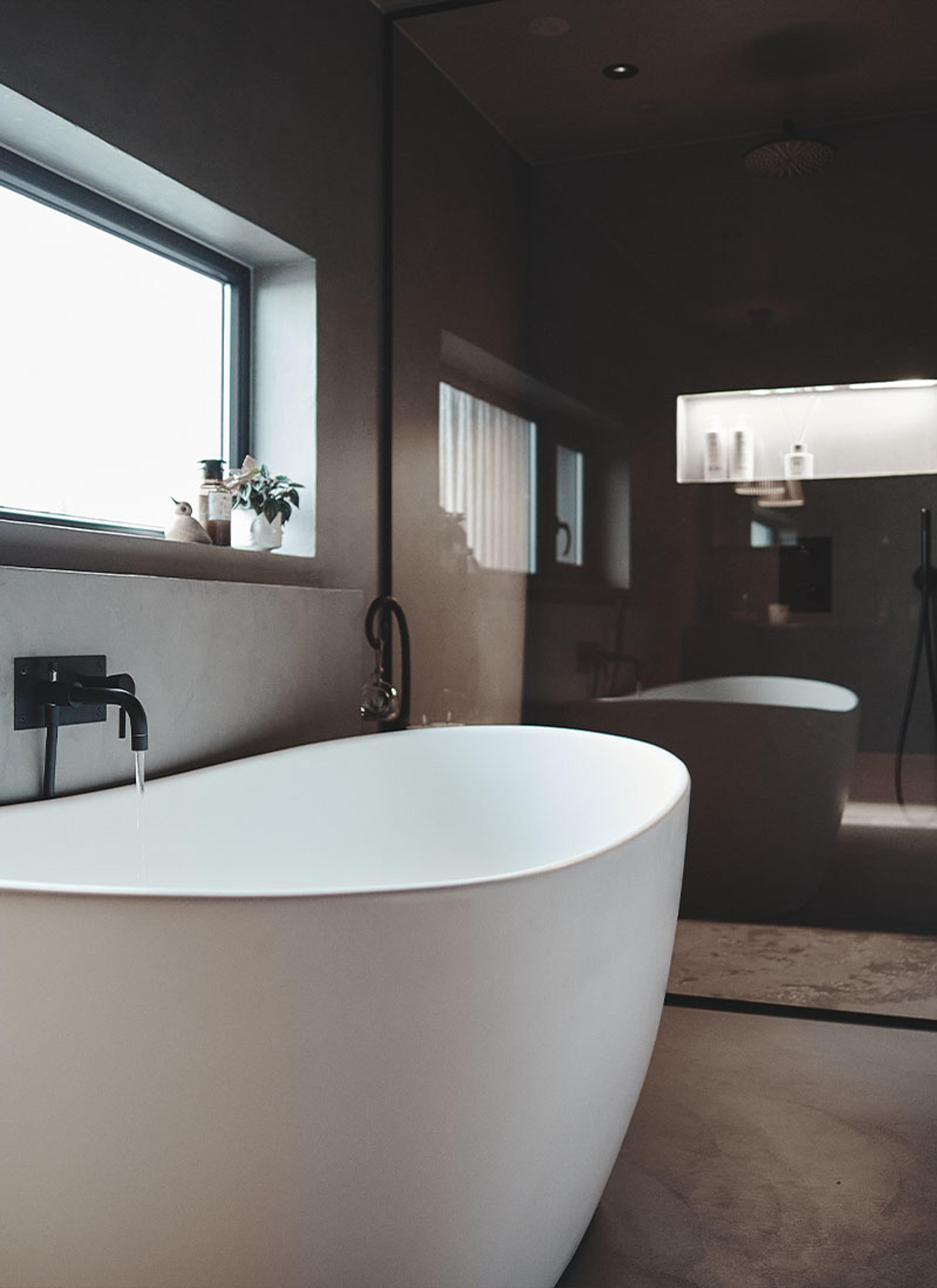 Det nye badet har et frittstående badekar med innebygd nisje i mikrosement og gjennomgående sorte detaljer | Tapwell BOX026 badekarbatteri i sort matt.