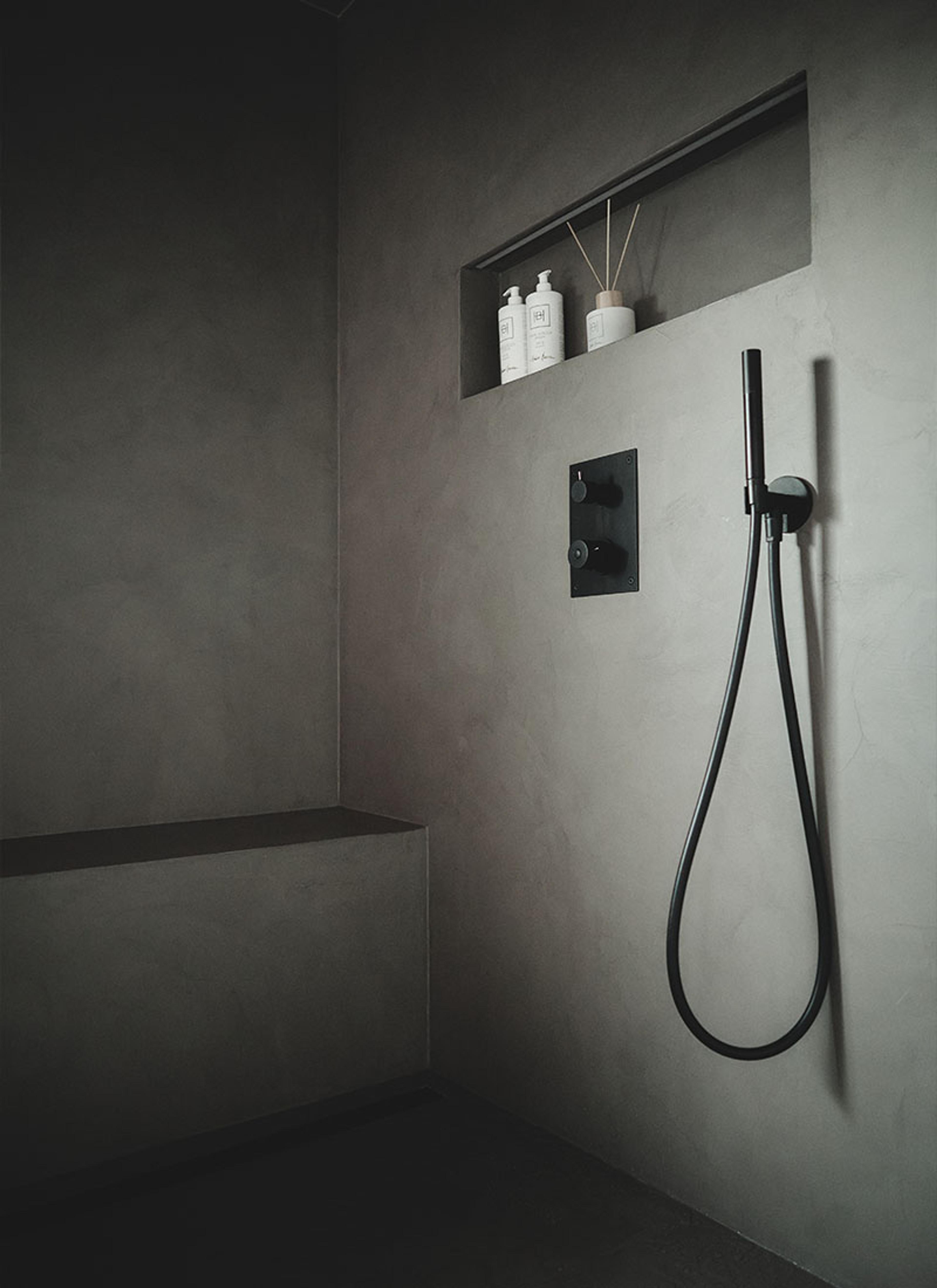 Fra dusjkabinett til dusjnisje med sittebenk i mikrosement, innebygd dusjhylle og dusjsystem | Tapwell BOX7268 innebygd dusjbatteri med hånddusj og takdusj i sort matt | Purus Line Chess designsluk i sort