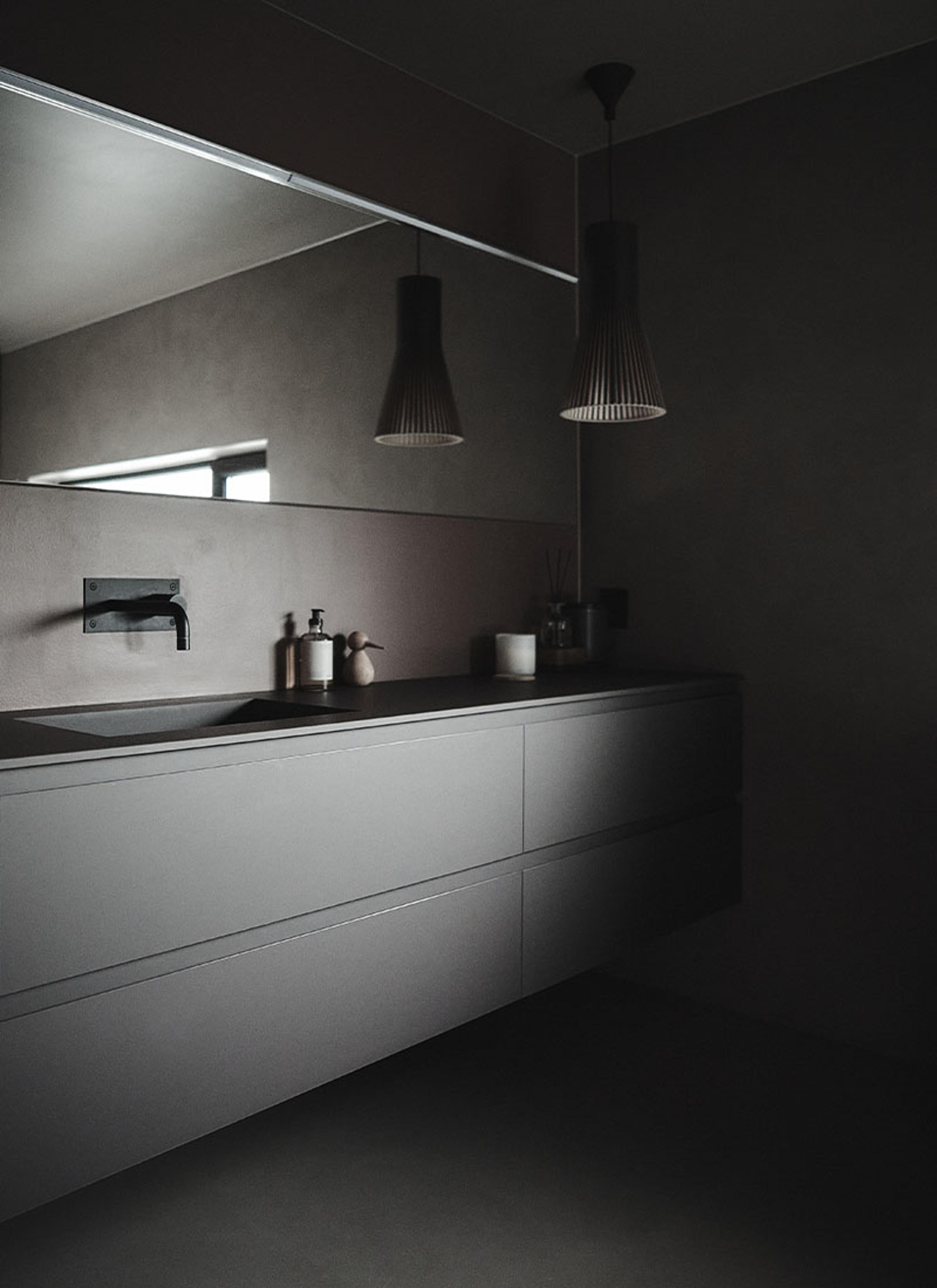 Da det var på tide å pusse opp badet, gikk June og Bern for en totalrenovering. Resultatet ble et moderne og stilig bad med mikrosement som gir følelse av velvære.