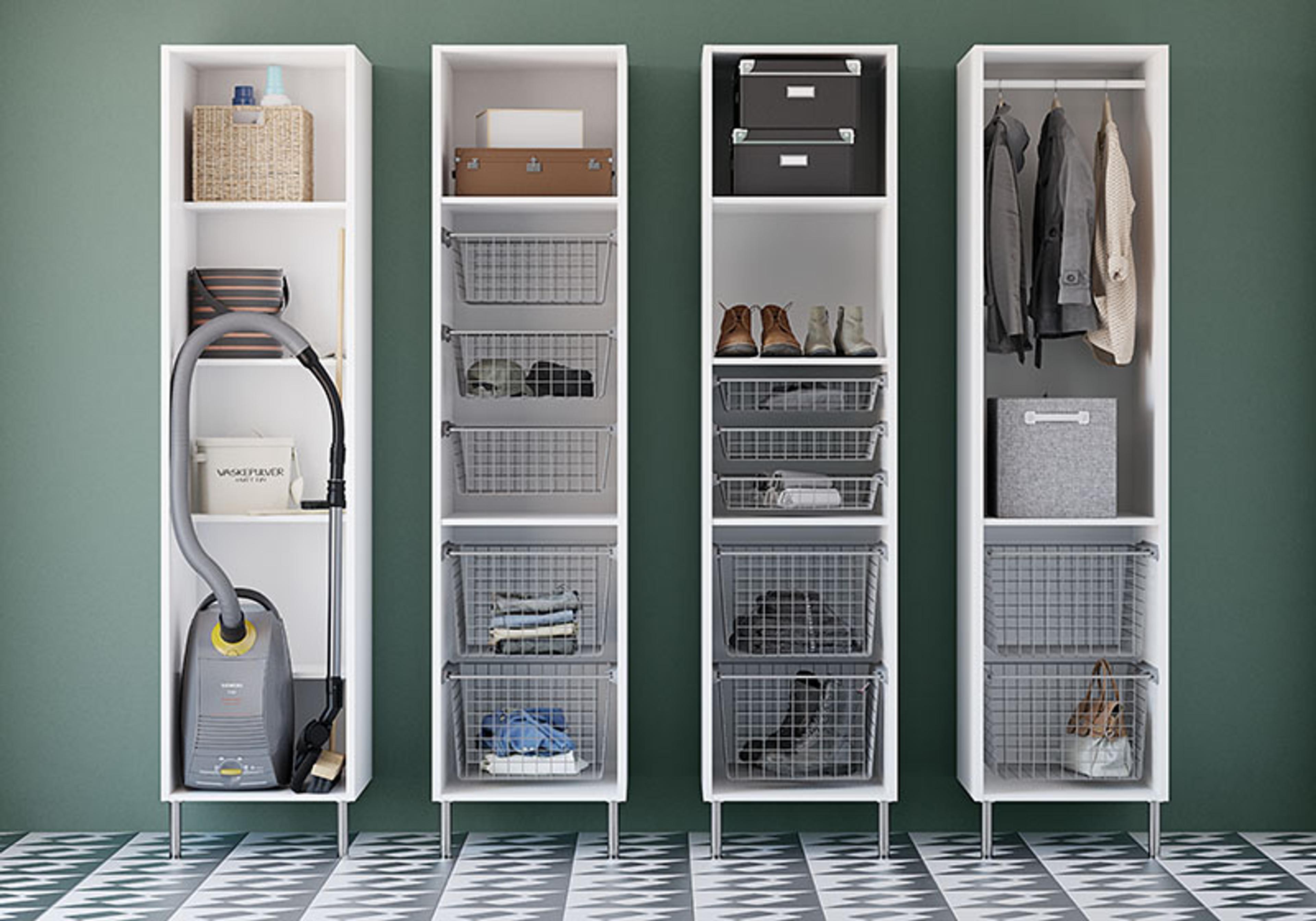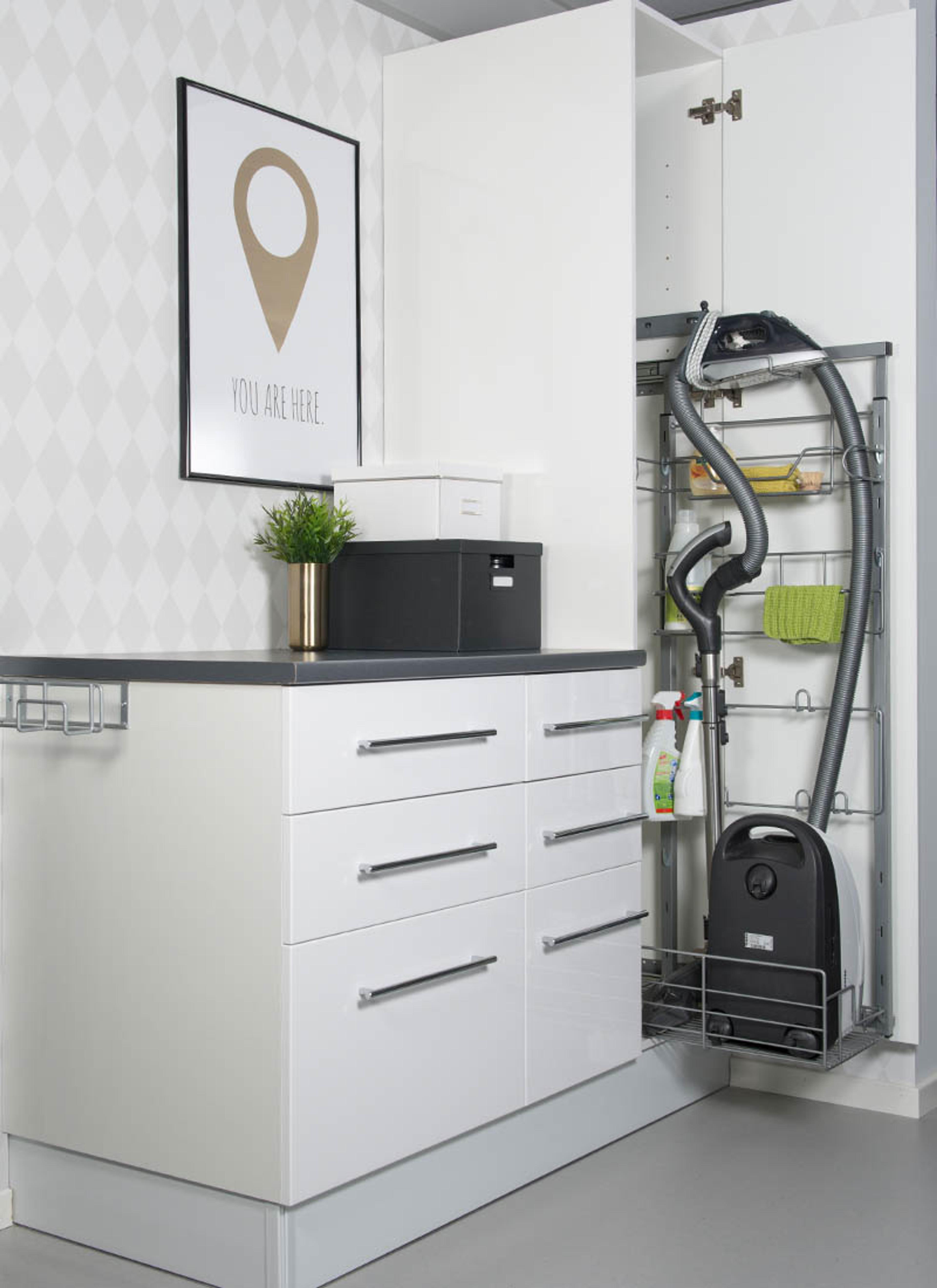 GJEM BORT støvsugeren og kosteskaftet i høyskapet med grunnere hyller, eller bytt ut hyller og skuffer med praktisk uttrekk. Bildet viser tilbehør til Alterna vaskeromsinnredning.