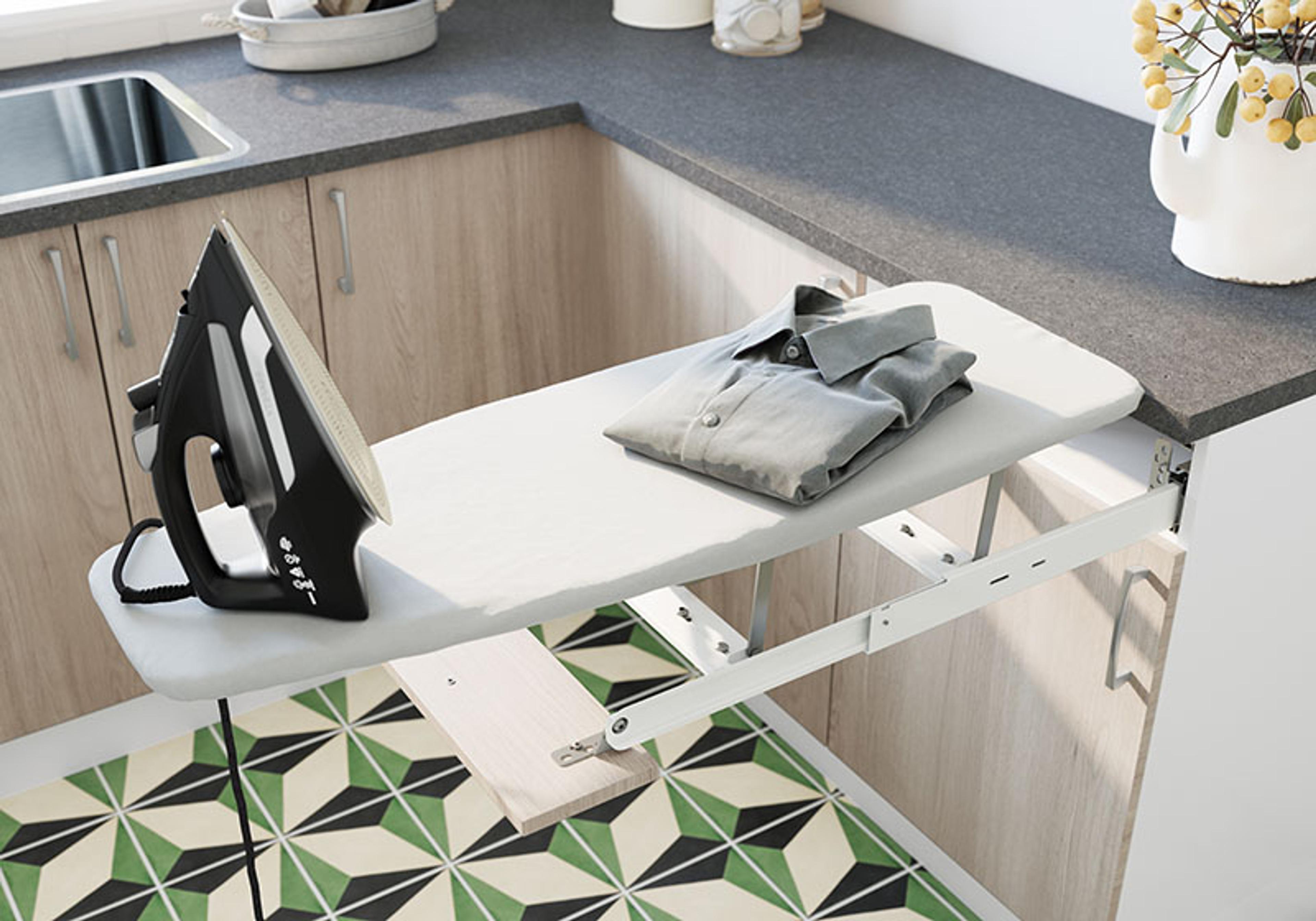 FUNKSJONELL VASKEROMSINNREDNING: Gjør strykingen til en lek med strykebrett i skuffen. Et uttrekkbart strykebrett er både praktisk og plassbesparende. Bildet viser tilbehør til Linn Bad vaskeromsinnredning.