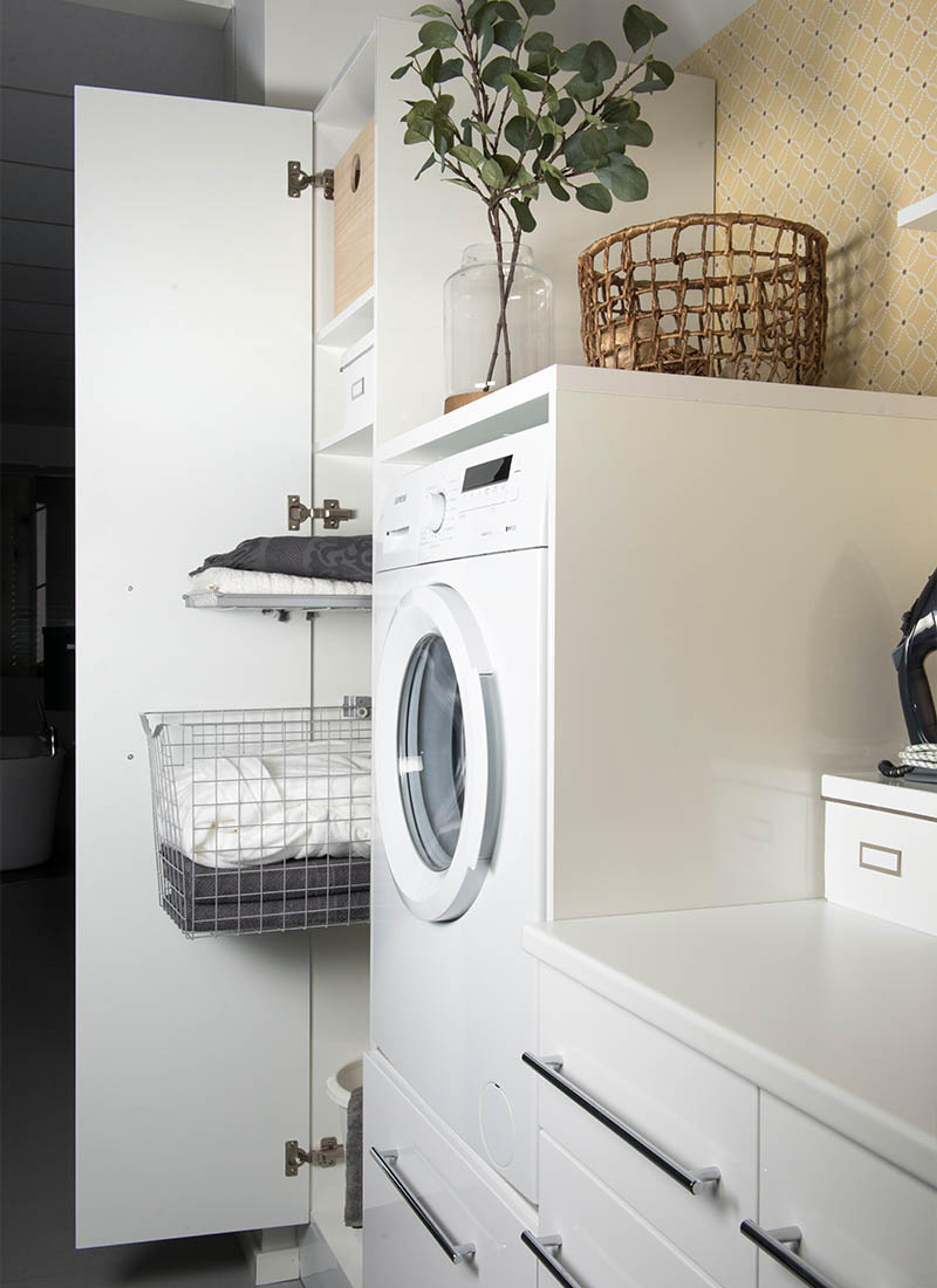 Idé! La hvert familiemedlem ha sin egen kurv til rent tøy og gi hver enkelt i oppgave å hente kurven sin på vaskerommet og bære den til garderoben sin. Bildet viser høyskap og innredning fra Alterna.