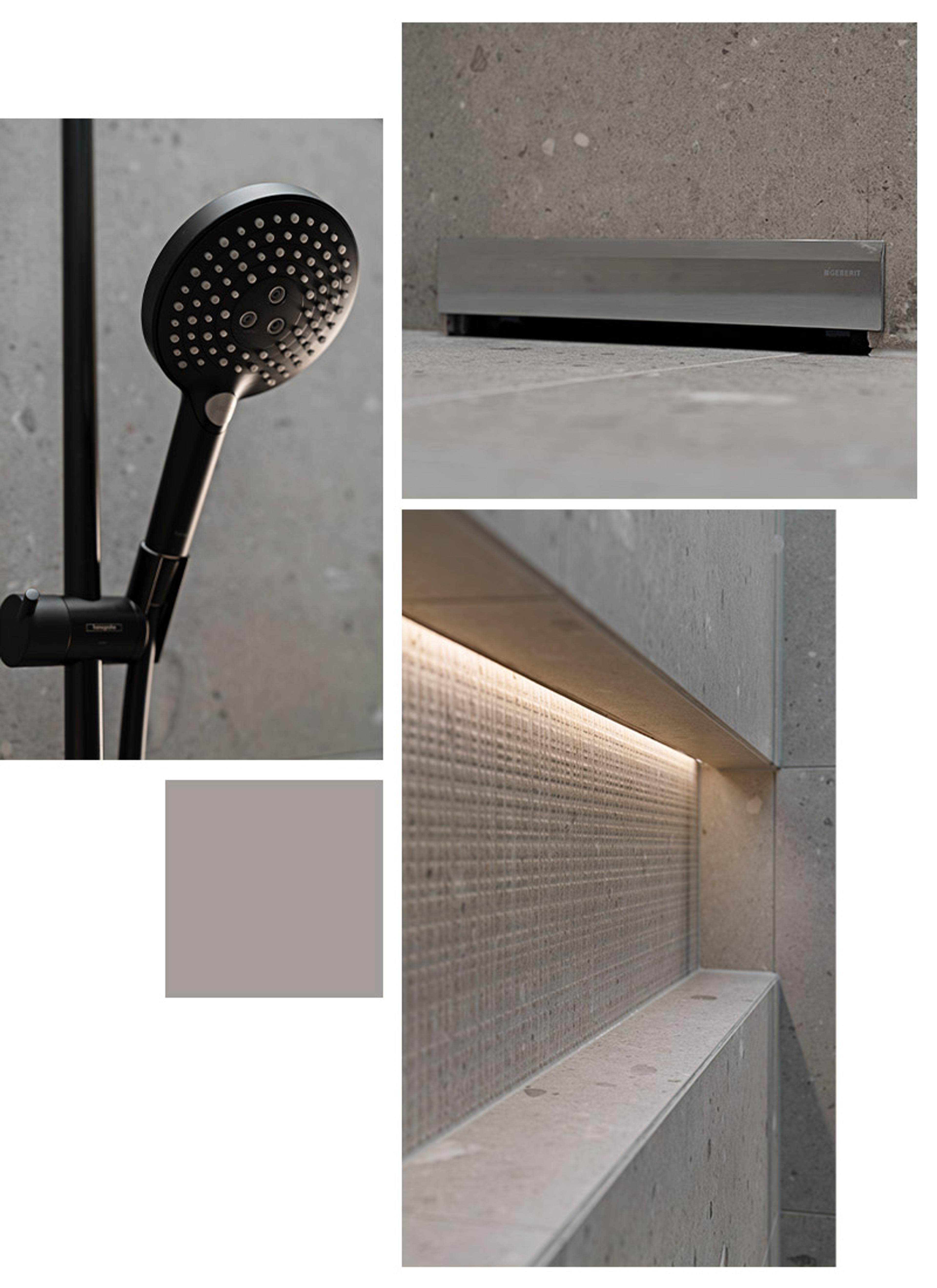 Det ligger i detaljene: Fra hånddusj med Select-knapp og PowderRain til innfelt belysning. På dette badet er ingenting overlatt til tilfeldighetene. Selv dusjsluket er verdt å nevne i denne sammenhengen. Monica og familien har valgt veggsluk fra Geberit, noe som forsterker de rene linjene og flatene på badet – virkelig lekkert!
