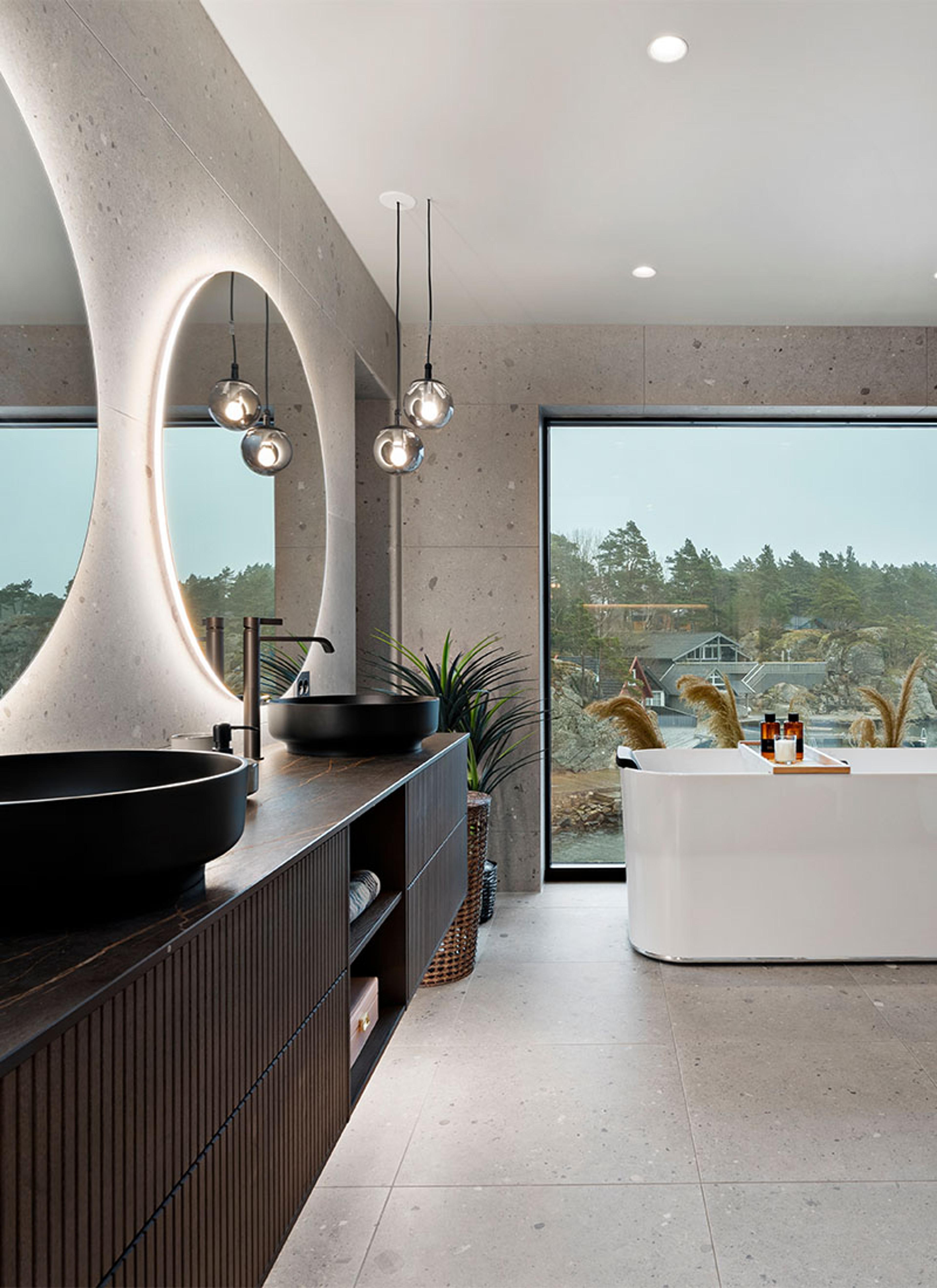 Drømmebadekar: Selve Finion badekaret fra Villeroy & Boch med nakkepute og underbelysning er et drømmekar i seg selv, men den flytende overgangen mellom inne og ute skaper ro.