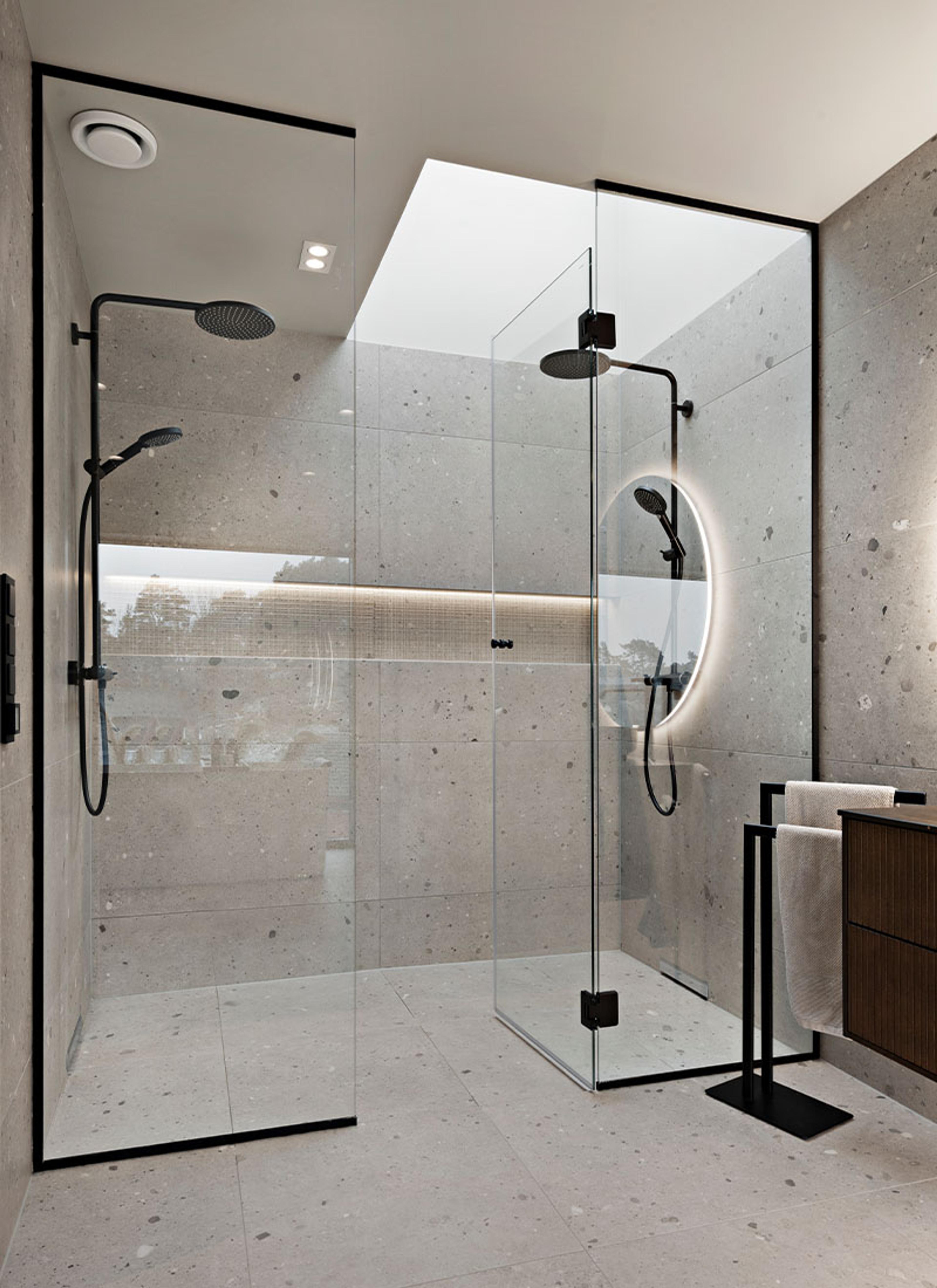 En dusj i det fri ...: Få en solfylt start på dagen med en dusj under det store takvinduet | INR ARC Frame tilpasset dusjløsning med sorte profiler.