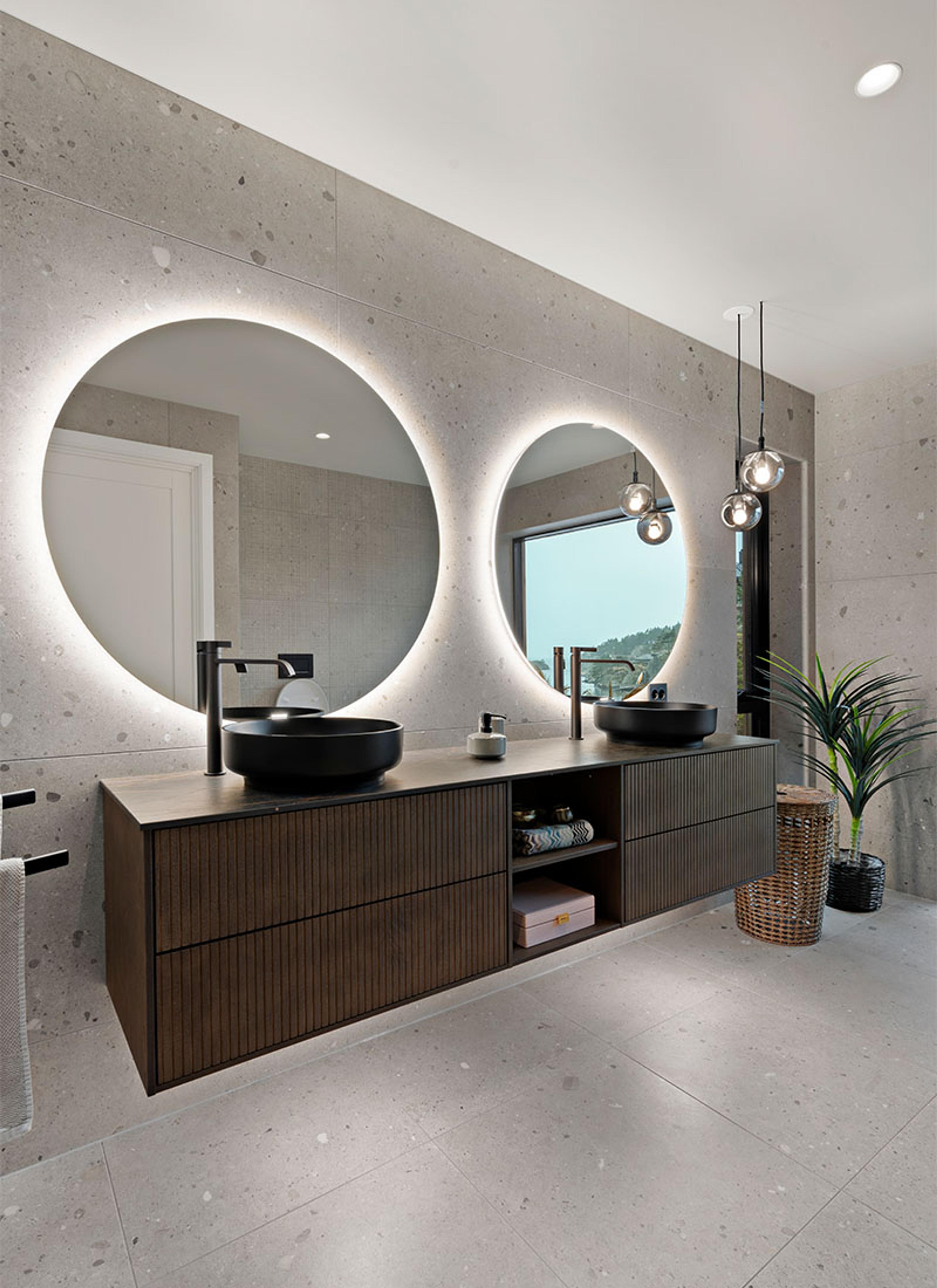 Svevende følelse: Fokuset på elegante og praktiske løsninger skaper en fin helhet på badet. Monica har blant annet valgt flere typer belysning – fin effektbelysning rundt speil, pendellamper og underbelysning under møbelet.