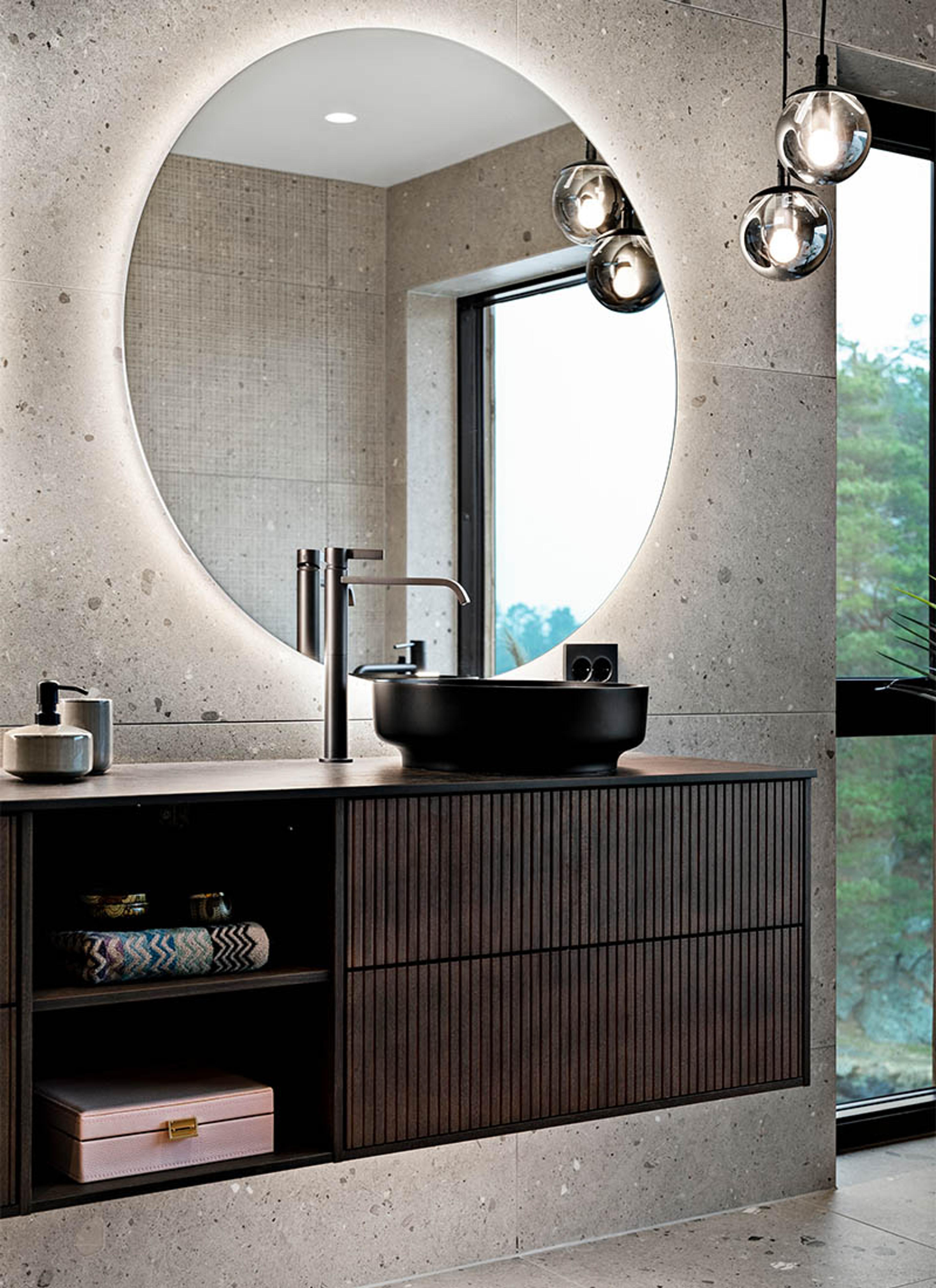 Hun visste hvilken følelse hun ville at badet skulle gi, men forteller at det var Bademiljø som var med på å gi liv til følelsene. I butikken falt hun pladask for Svedbergs EPOS-serie med signaturkolleksjonen av Halvor Bakke. Serien syr elegant sammen unike former, flater og behagelige lys som gjør at rommet føles varmt og koselig. Prikken over i-en ble satt gjennom et tegneprogram som ga et klart bilde av hvordan samspillet mellom fliser, rom og innredning ville bli.
