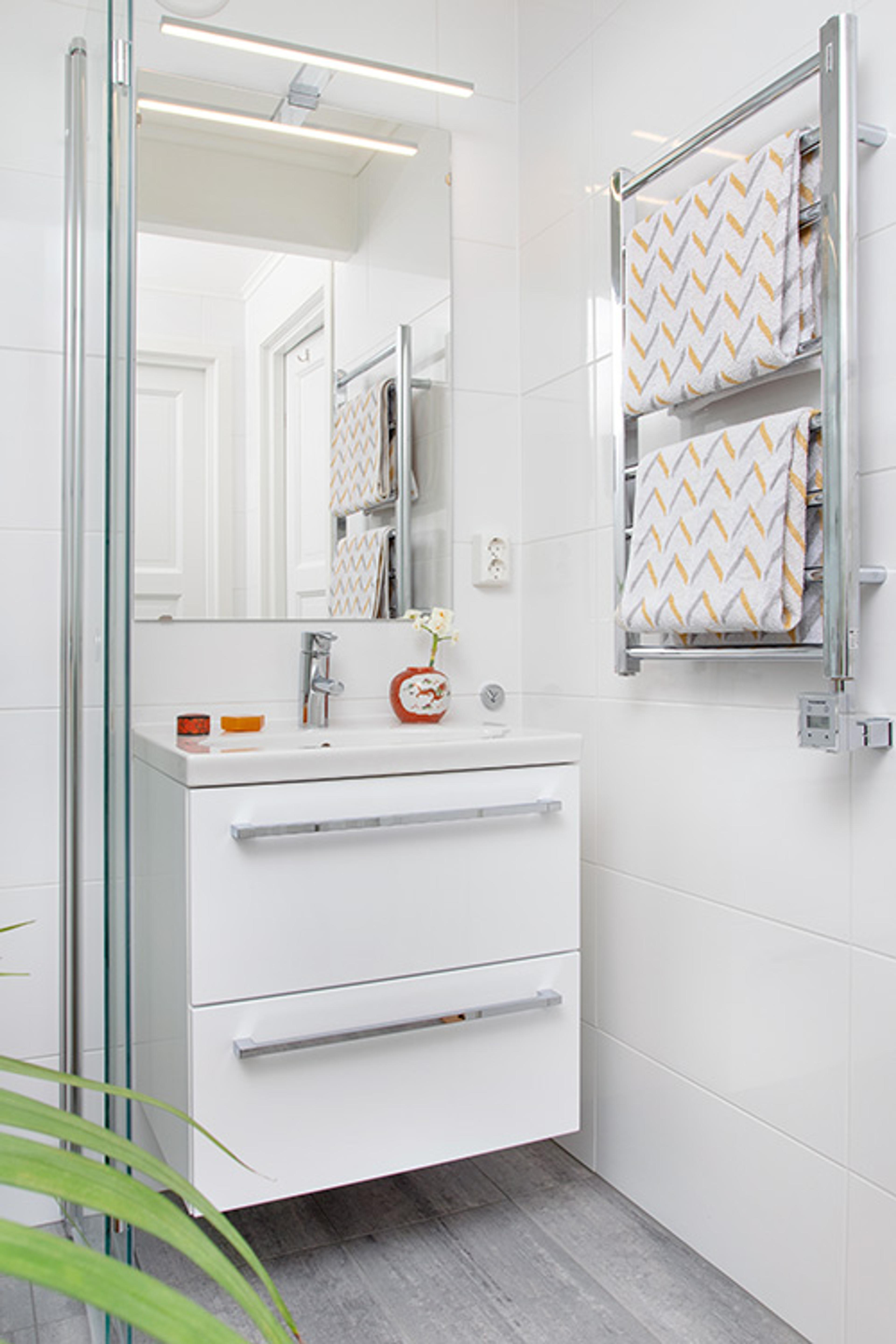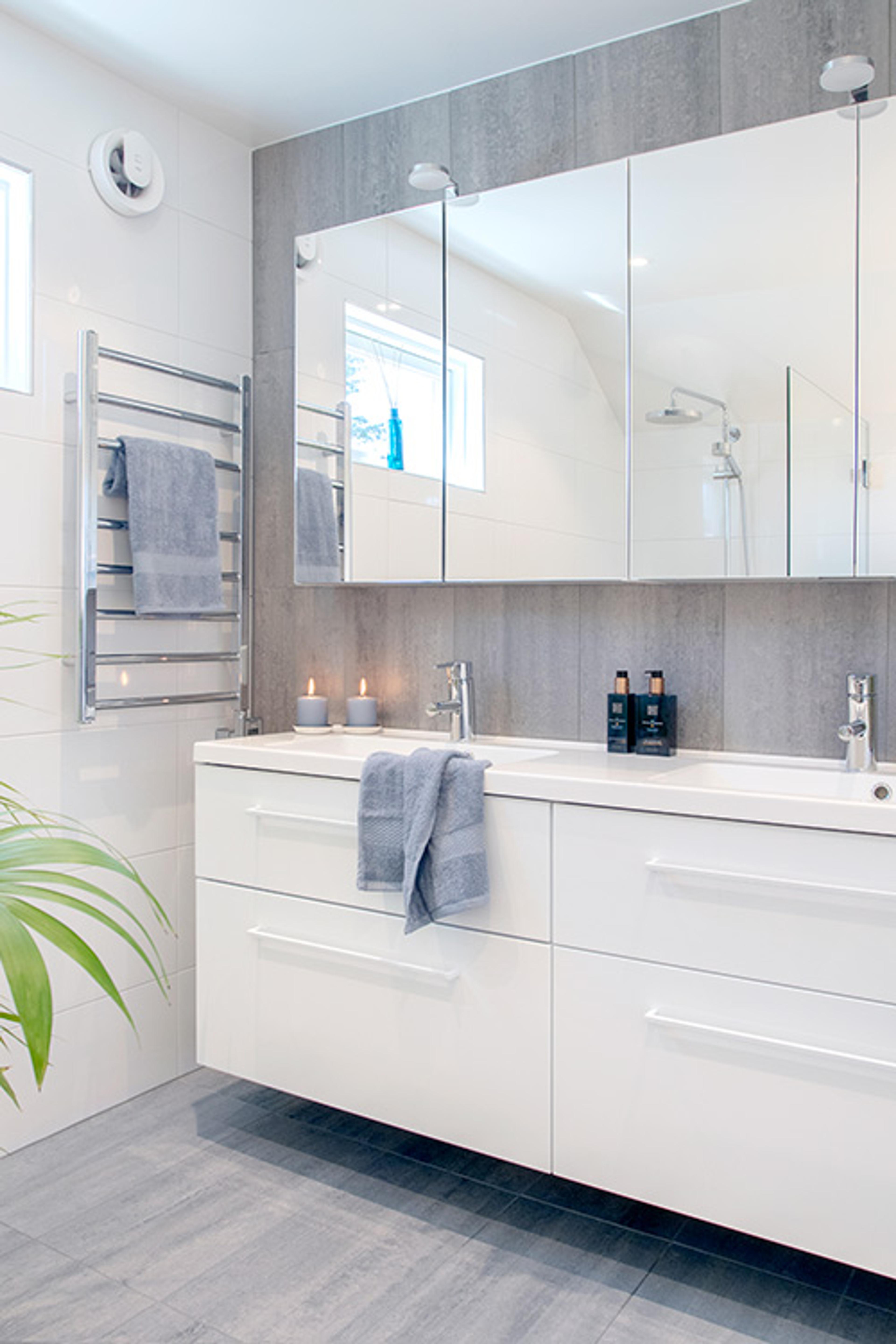 Badet i 2. etasje: Dansani Inzo baderomsmøbel | Svedbergs håndkletørker | PAX baderomsvifte