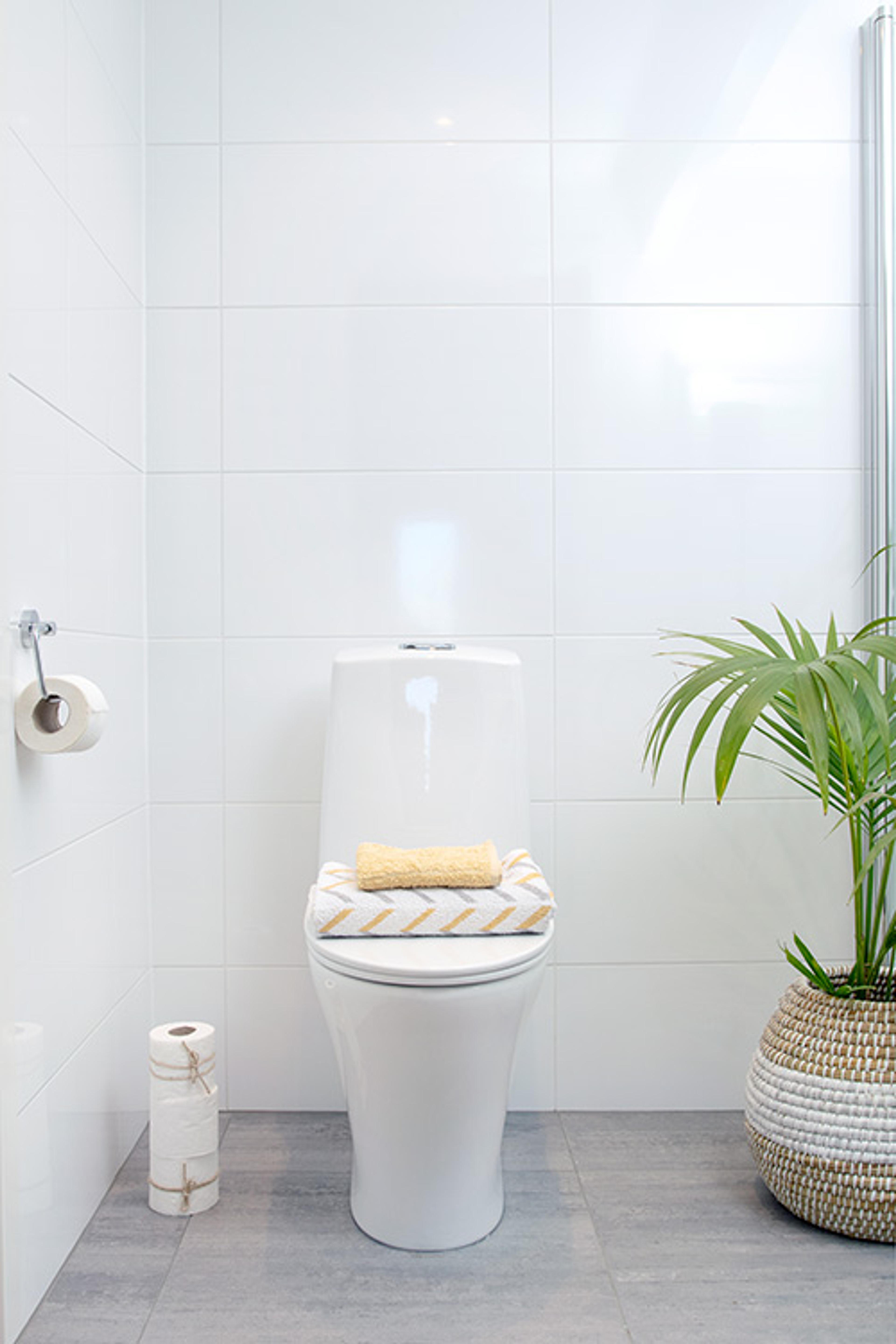 Det ble benyttet en prefabrikert innbyggingsmodul for å skjule innbyggingssisternen, og i stedet for å dekke rørene med fliser bak toalettet, fikk Bademiljø satt opp en sisternekasse. Dette gjør rengjøringen enklere samtidig som det ser elegant ut.