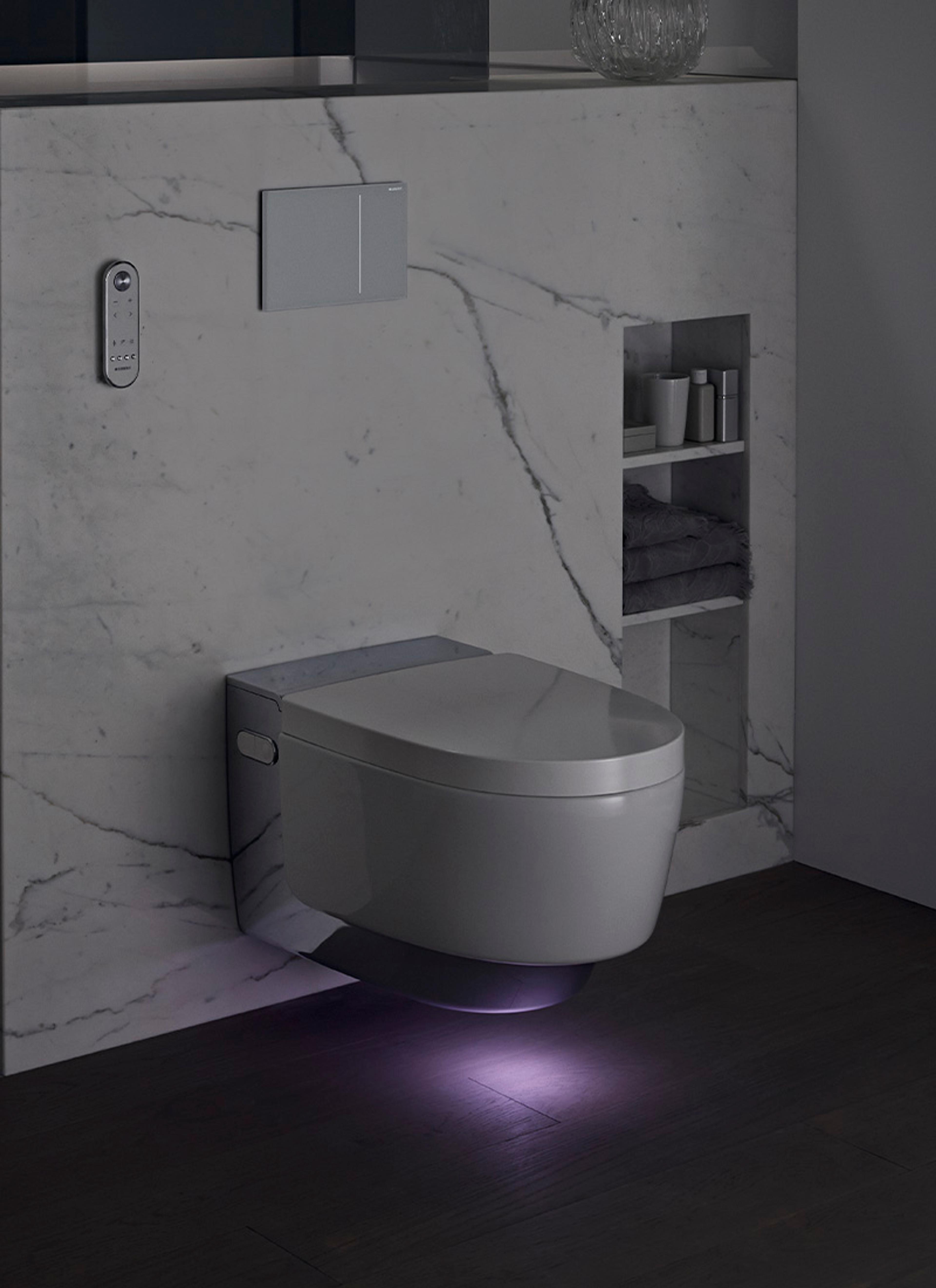Geberit AquaClean Mera med LED-orienteringslys. Utrolig praktisk ved nattlige toalettbesøk. Finnes i hele syv valgfrie farger. Smart!