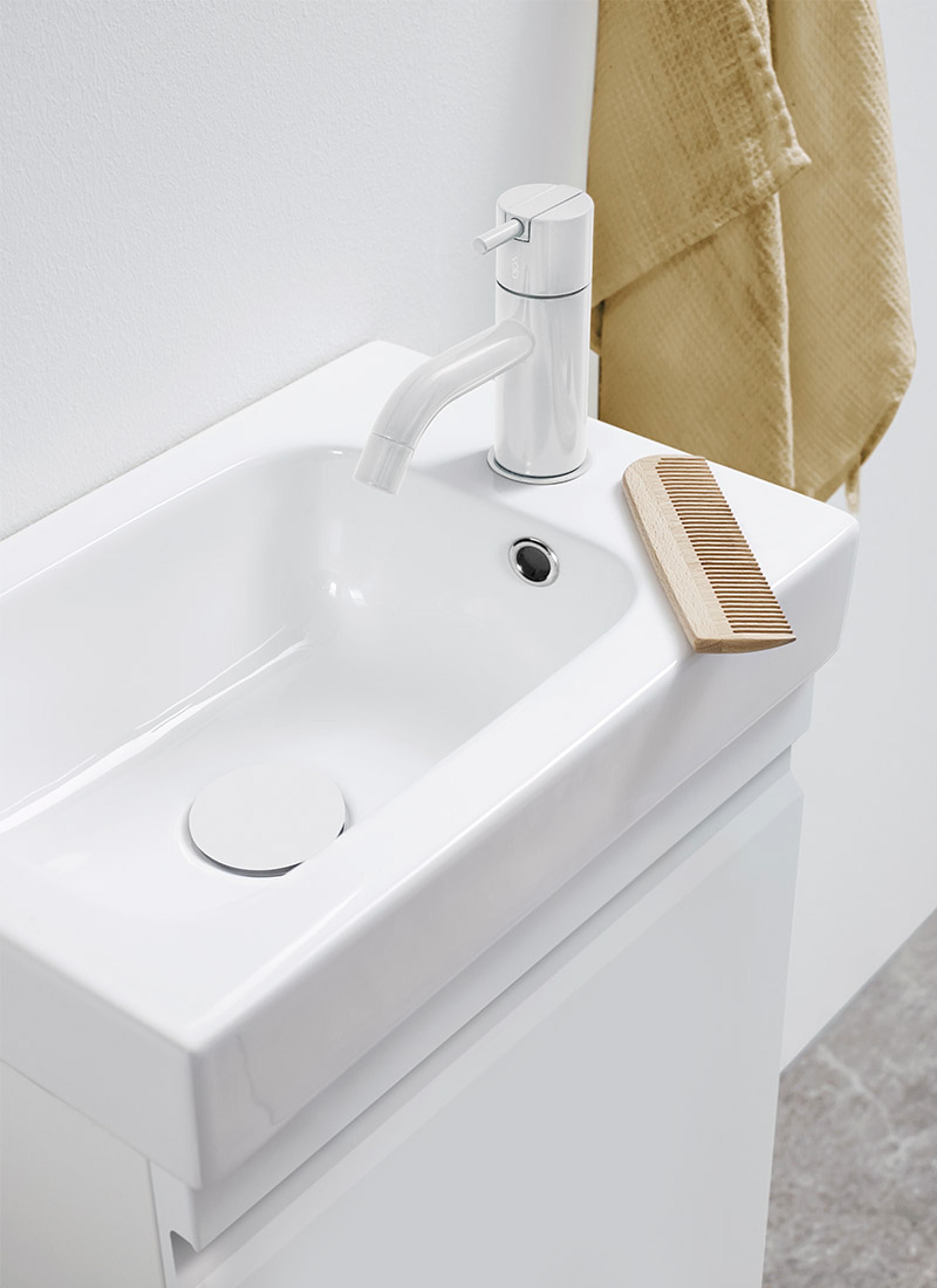 Smått og godt | Med den lille Micro Menuet-servanten fra Dansani med dybde på kun 27 cm, skaper du plass til oppbevaring på selv det minste baderommet eller gjestetoalettet