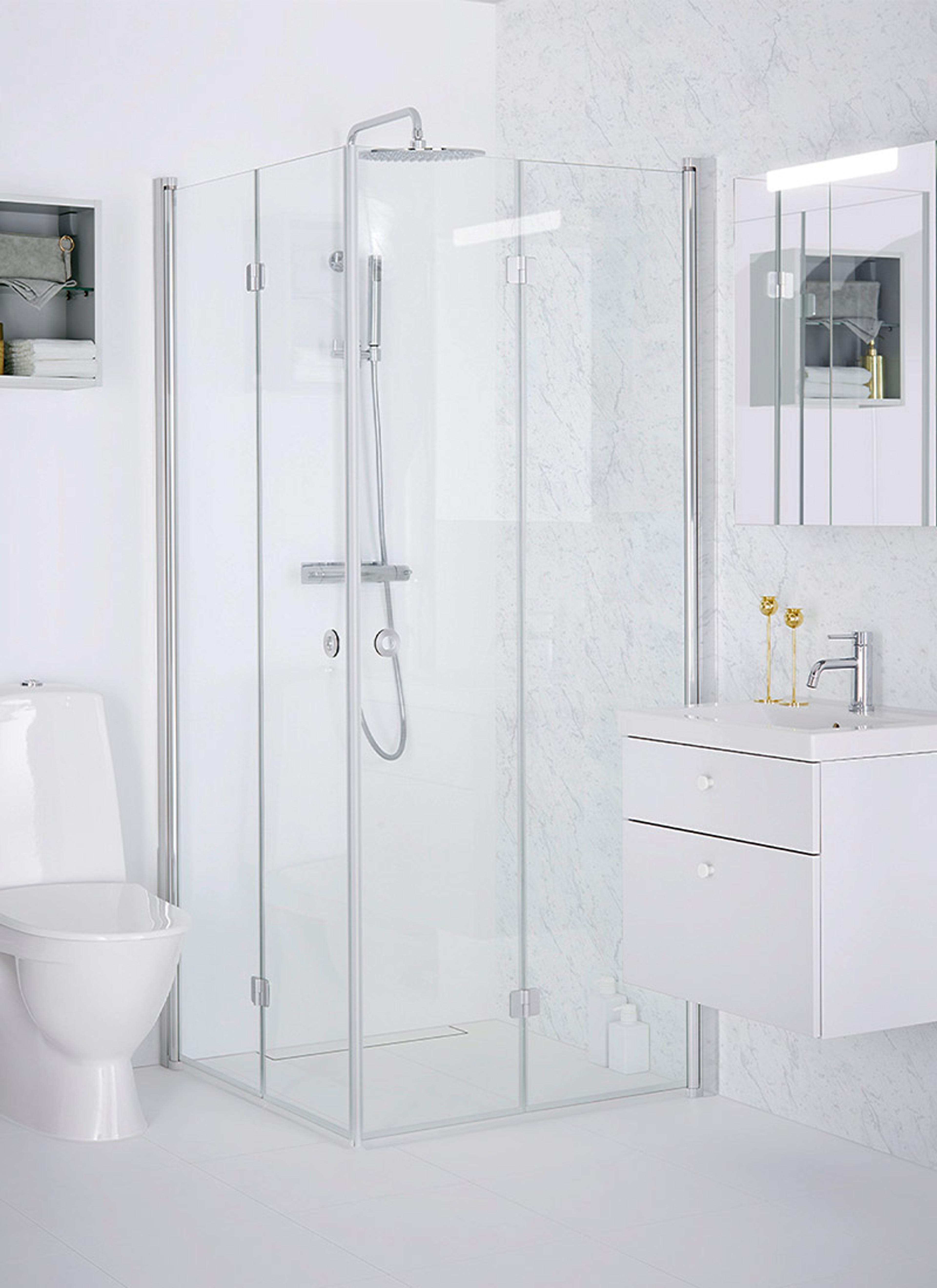 Dusj tar mindre plass enn badekar, og det finnes smarte dusjløsninger for små bad. Et smart valg på et lite bad er å velge en dusj med foldedører som vender innover – dette gir en ekstra stor åpning også på det minste baderommet. Hvis du ikke vil gi avkall på badekaret, finnes det badekar i små størrelser eller sittebadekar.