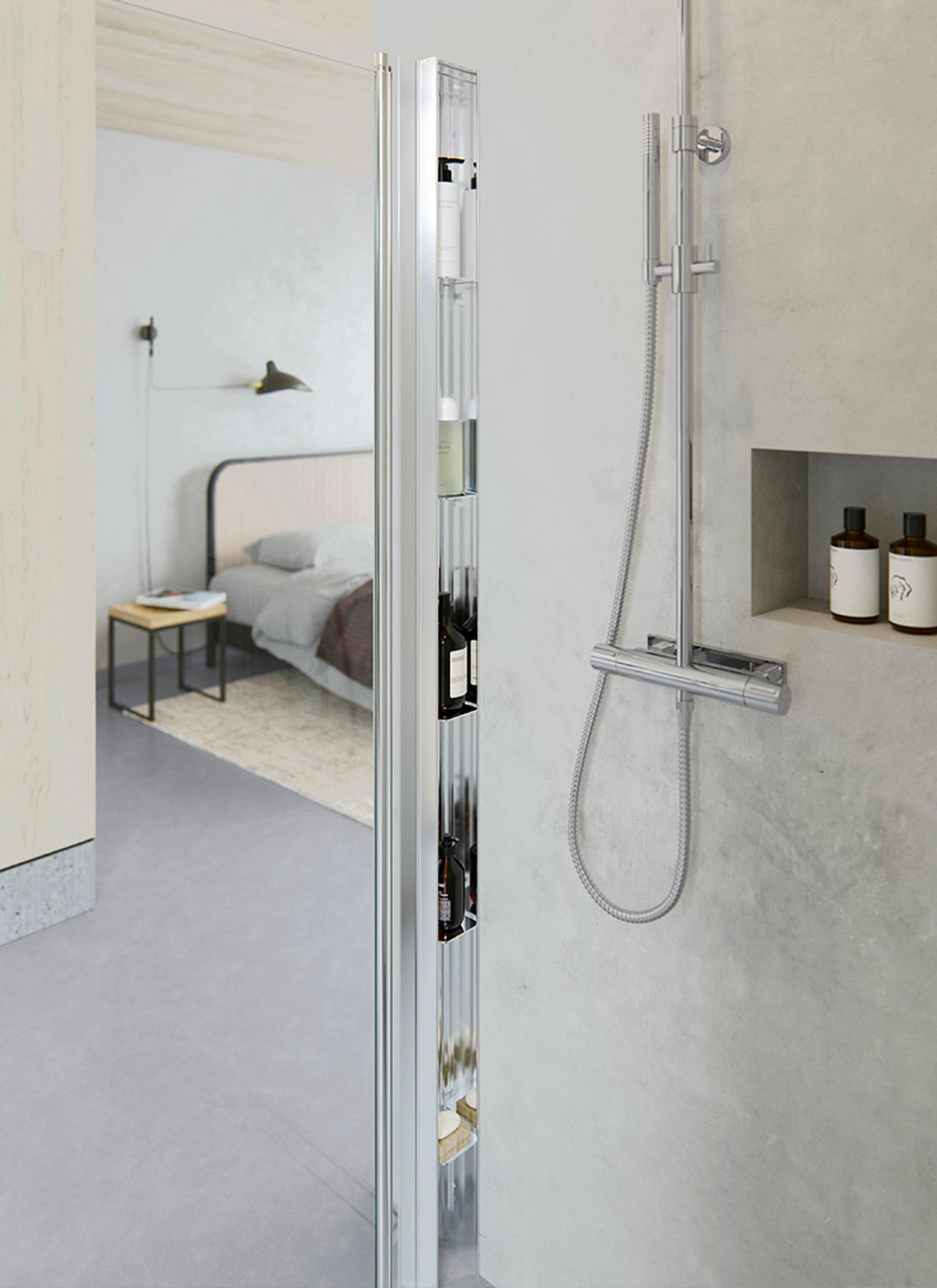 OPPBEVARINGSTIPS: Få en smart dusjløsning med den smarte PILE dusjoppbevaringen med flyttbare hyller på innsiden. PILE monteres i selve dusjprofilen, og kommer selvsagt i de samme finishene som nevnt over.