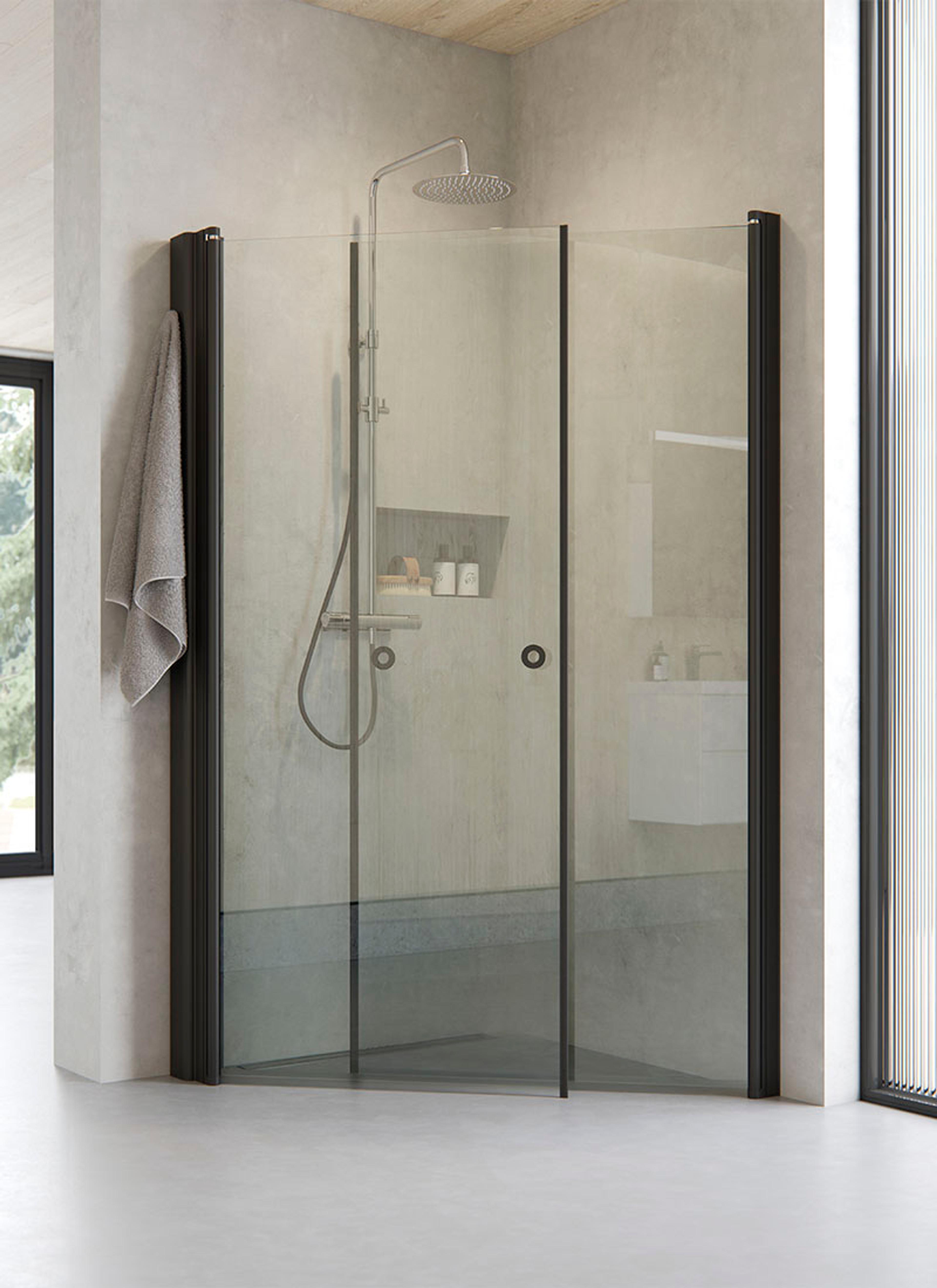 FRIGJØR PLASS: LINC-dørene kan svinges inn mot veggen og frigjøre gulvplass. Her ser du LINC Angel med sorte profiler og klart glass.