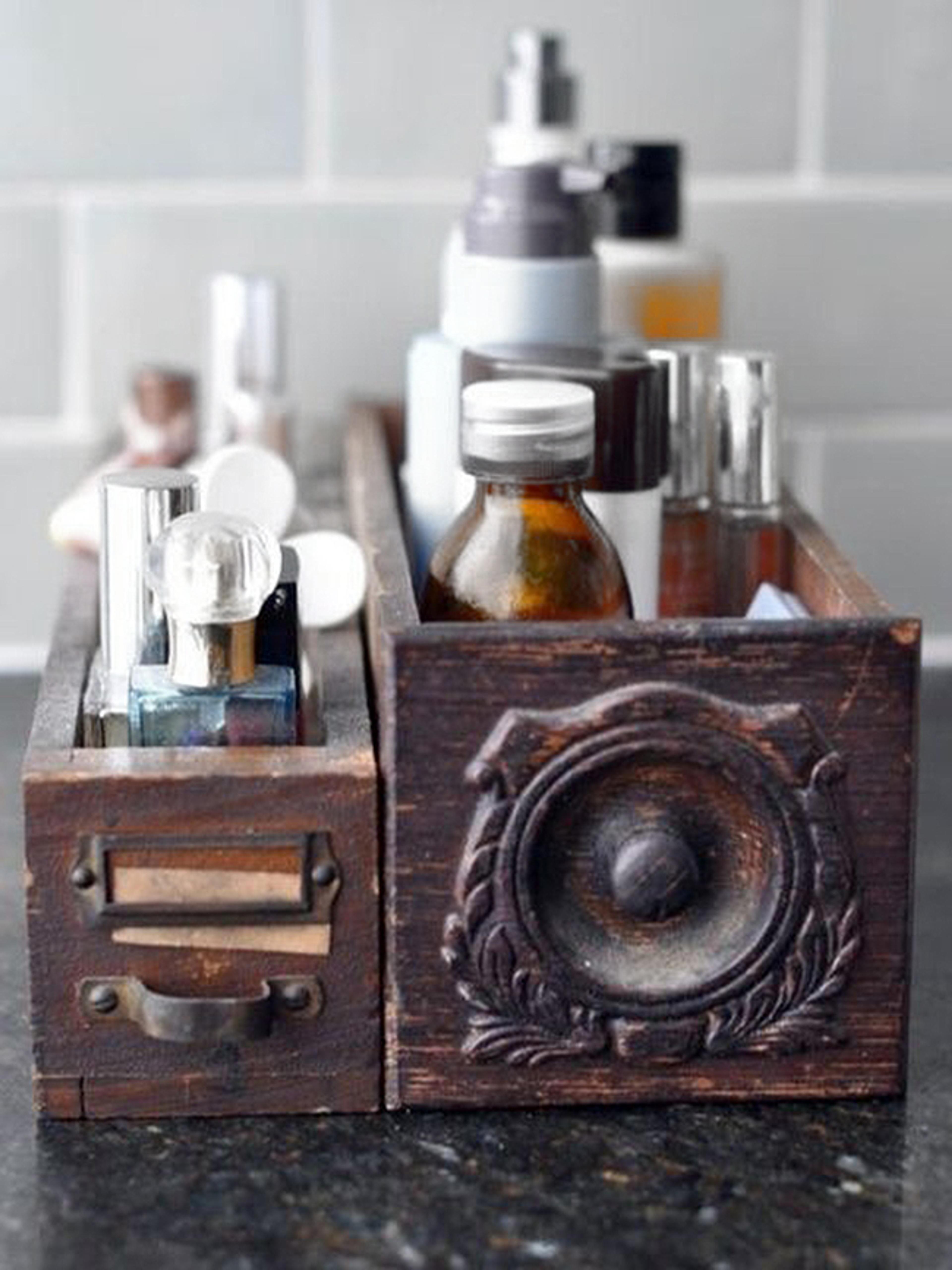 Gamle skuffer kan brukes som fine oppbevaringsbokser til parfyme, såpe og kremer. Innslag av gamle og rustikke elementer gir varme og personlighet til interiøret på badet som ellers kan bli litt kaldt. Hold øynene oppe for fine skuffer neste gang du er på loppemarked!