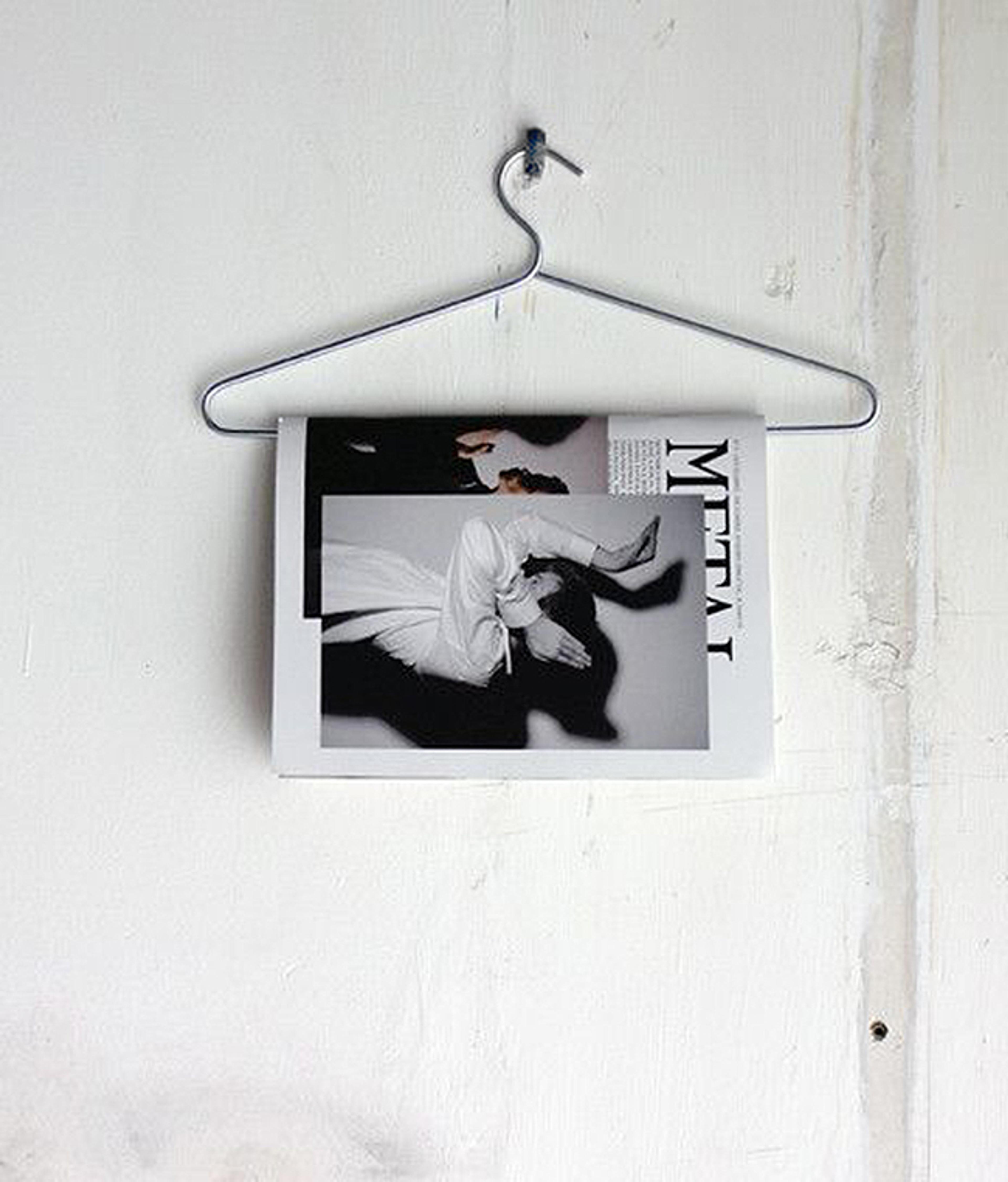 Henger du en enkel kleshenger i metall på en liten krok, får du plutselig en stilig magasinholder.
