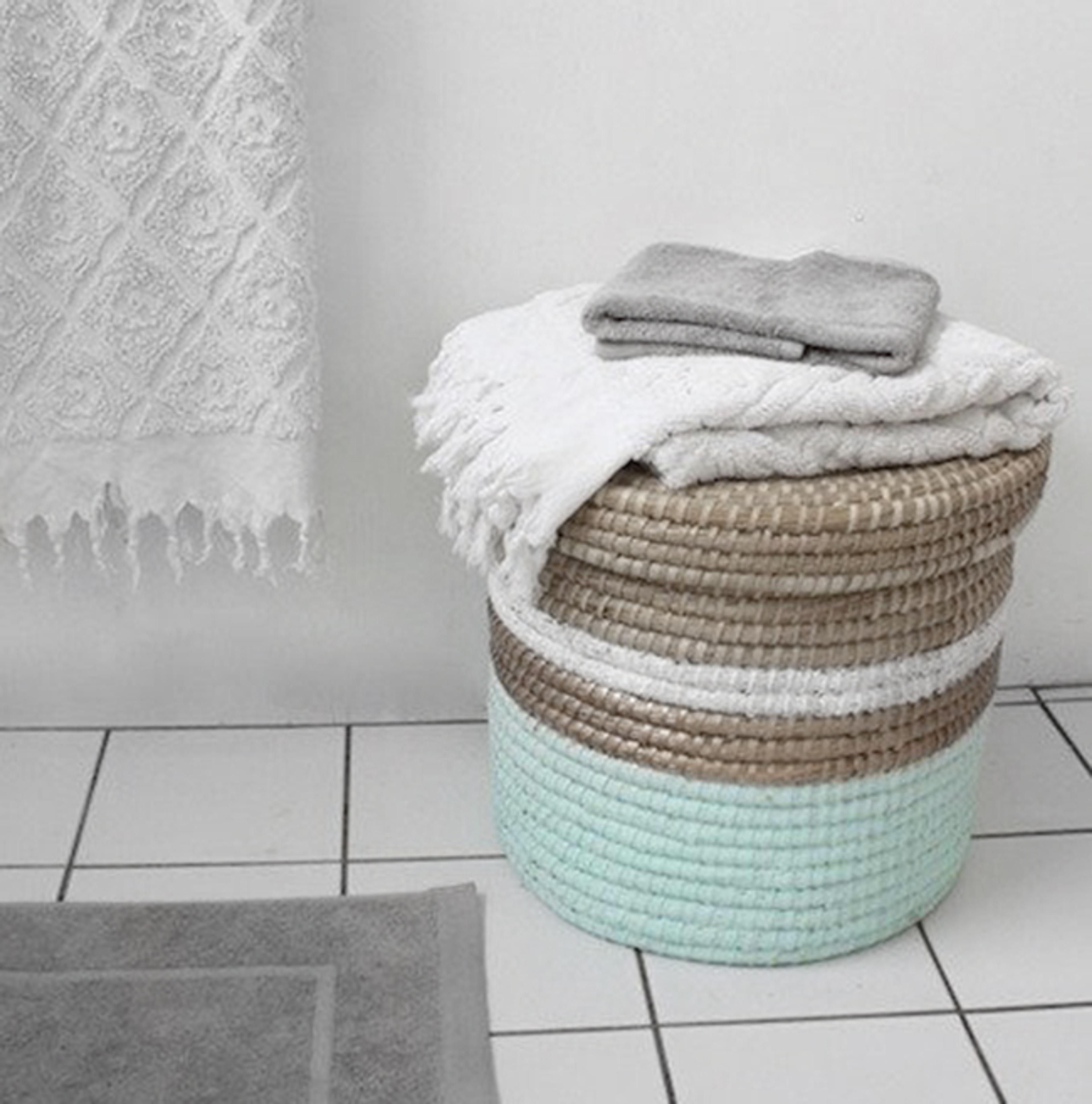 Maling i en knallfarge på nederste del av en skittentøyskurv i bast, gir badet et moderne og morsomt blikkfang.