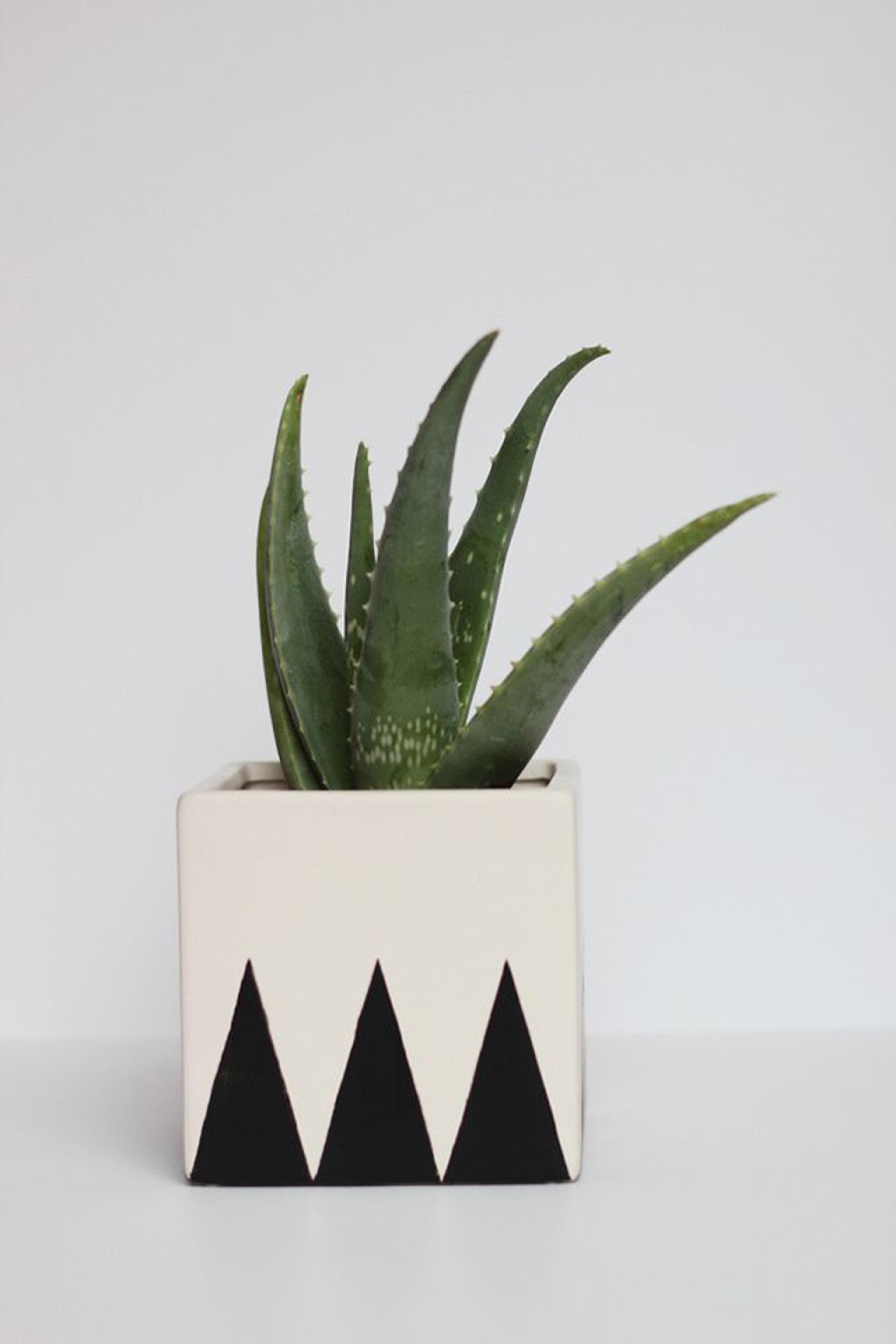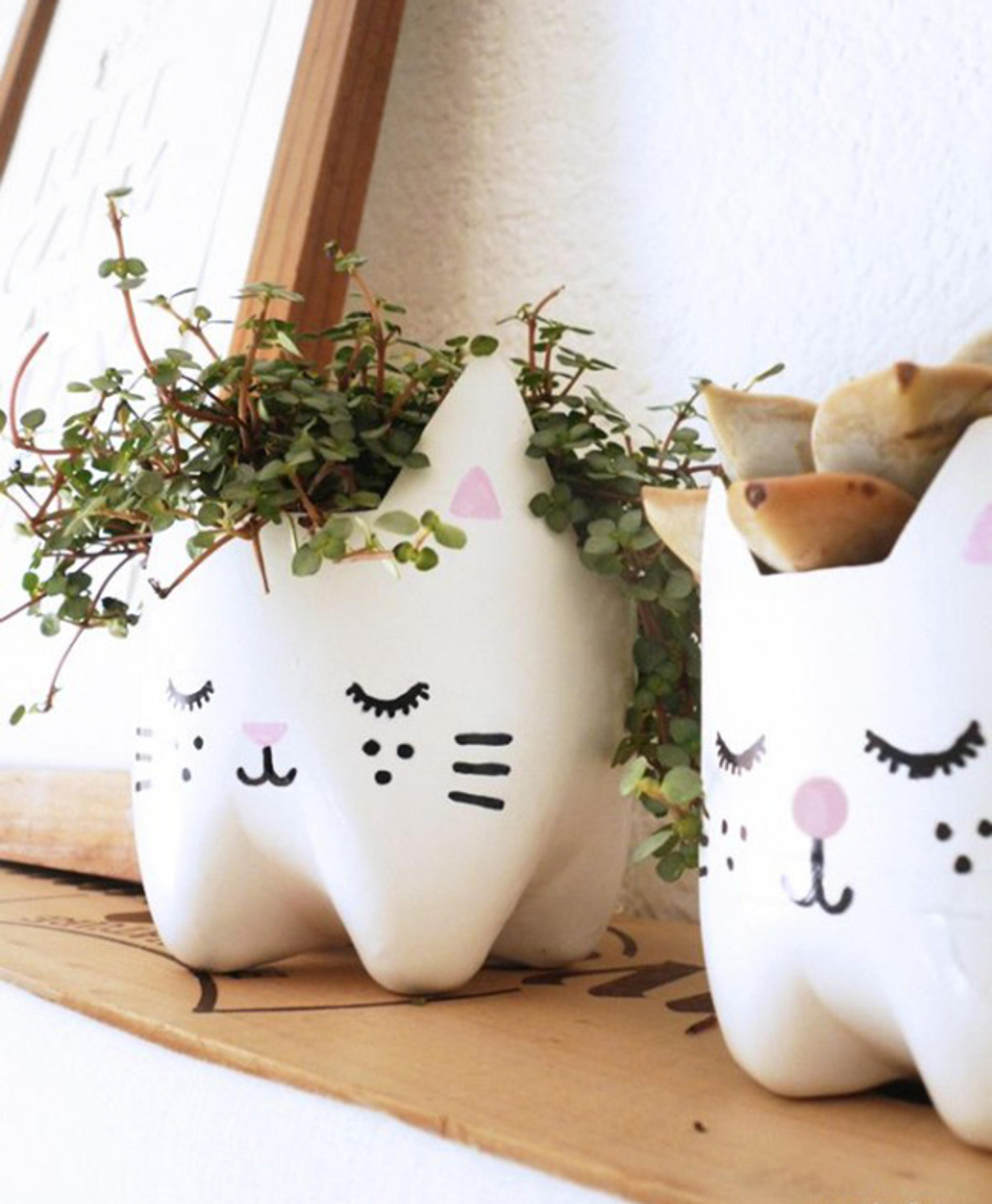 Planter på badet er fint og sukkulenter trives spesielt godt her. Disse potteskjulerne er laget av gamle brusflasker, du bare klipper til riktig form og maler dem med hobbymaling. Superfine, synes jeg! Du kan også endre en kjedelig hvit potteskjuler til en trendy og tøff en ved å male et enkelt geometrisk mønster. Ikke gjør det på frihånd og husk å bruke maskeringstape.