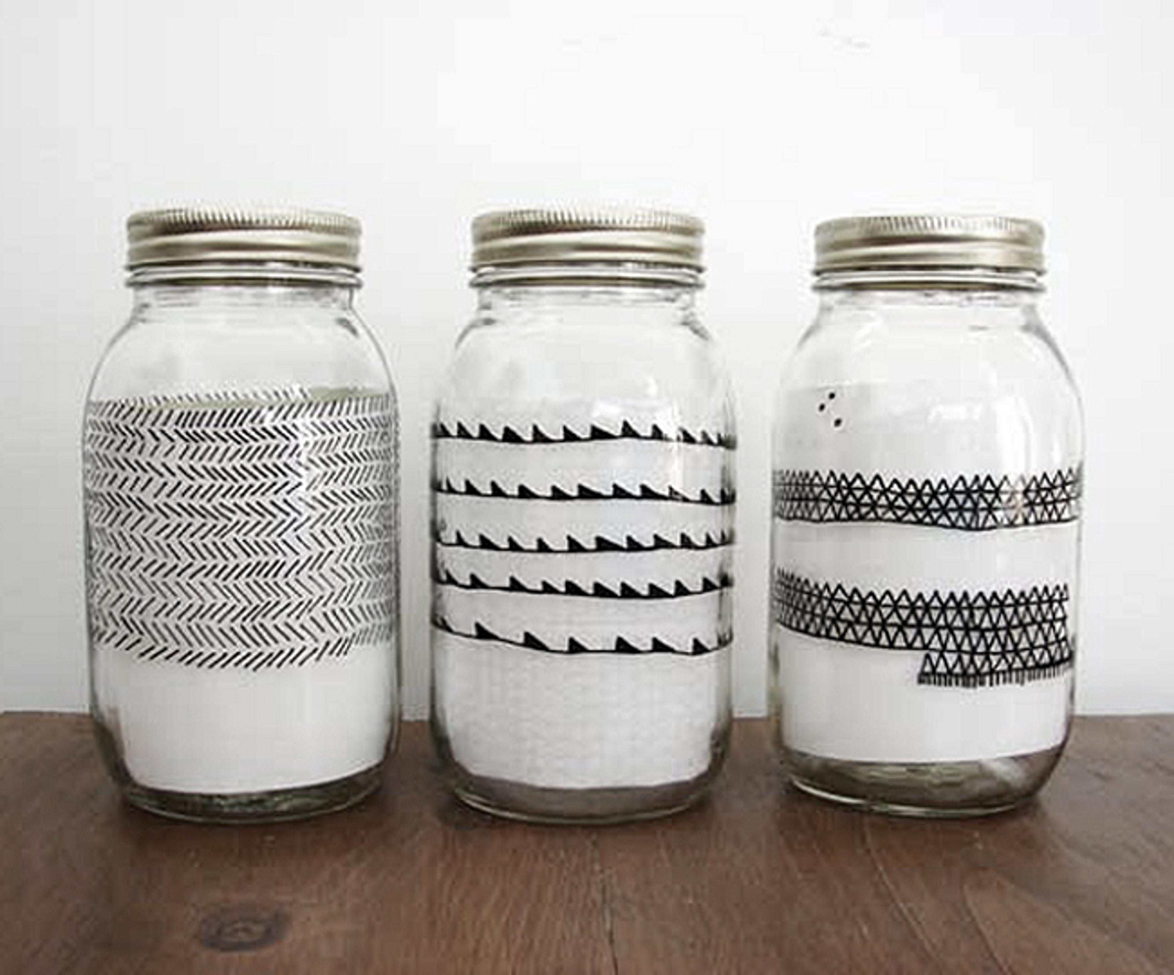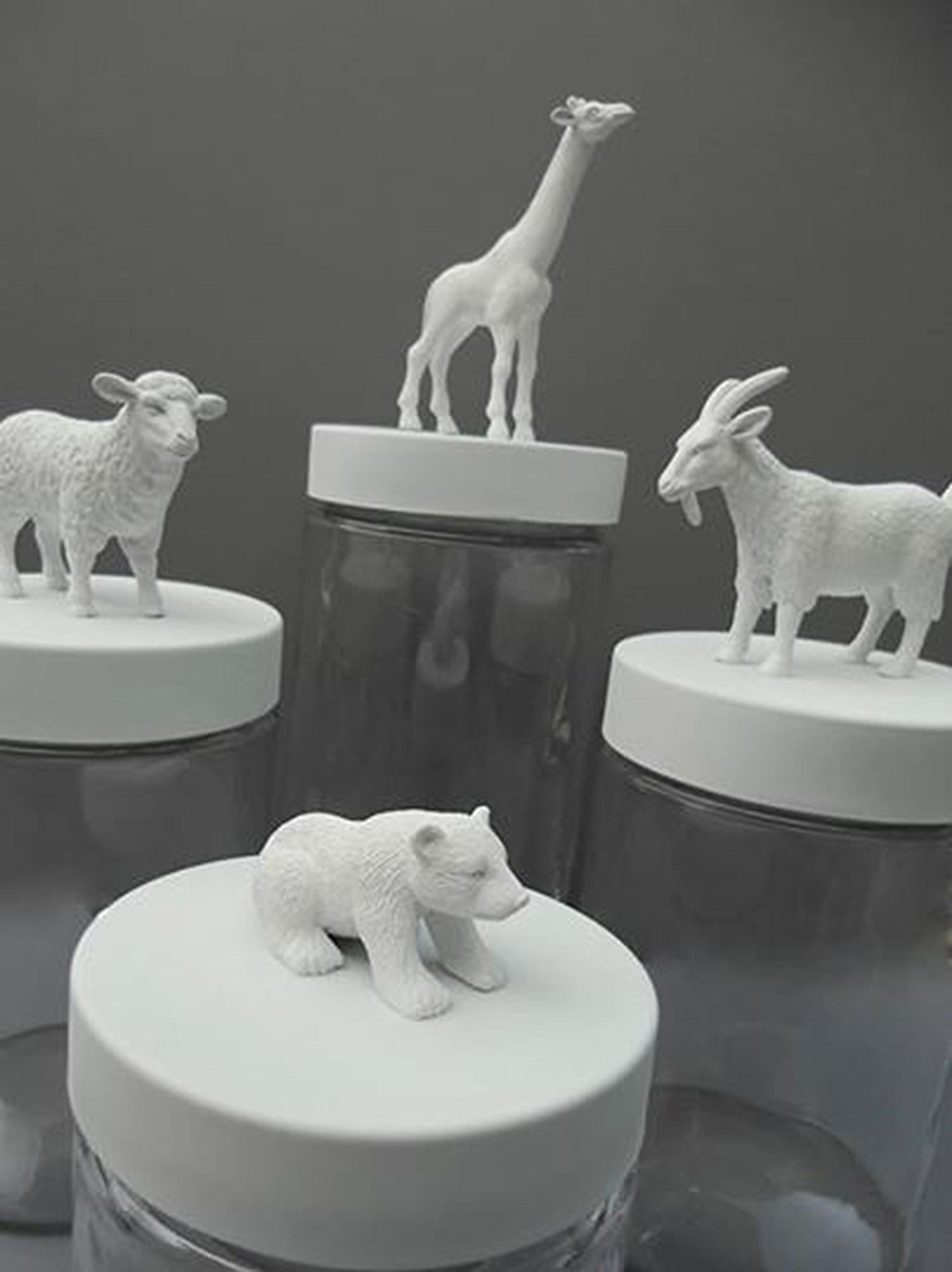 Du trenger noen gamle Norgesglass eller andre bokser med lokk, lekedyr i plast, litt sterkt lim og matt spraymaling. Eller du kan bare lage enkle, geometriske mønstre med en vannfast tusj. Superfine og praktiske til oppbevaring av q-tips, bomullsdotter og annet baderomsstash.