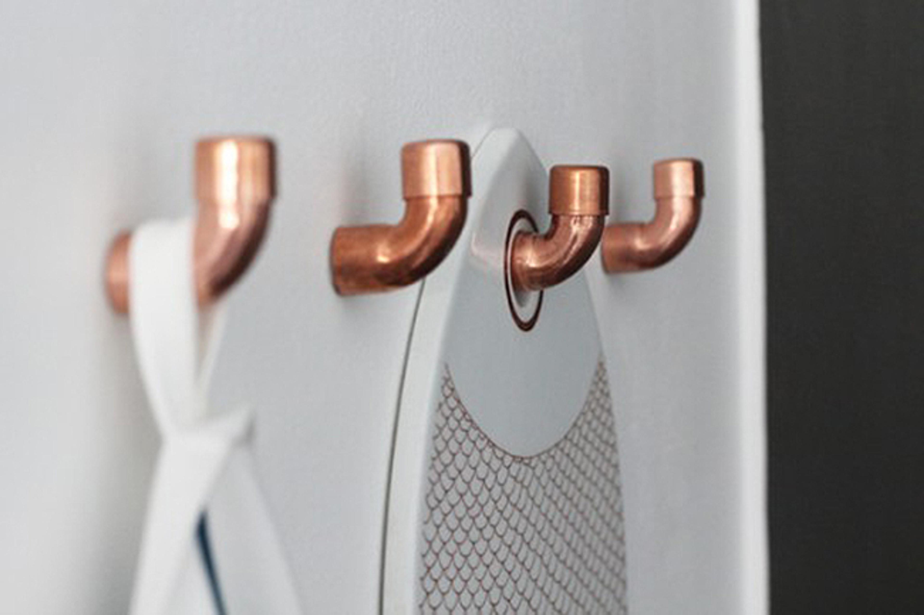 Kobber er trendy som bare det og den røffe industristilen er fortsatt med. Du kan lage håndkleknagger av rørkoblinger i kobber. Fest dem med superlim utenpå små, rette veggknagger fra Ikea eller lignende.