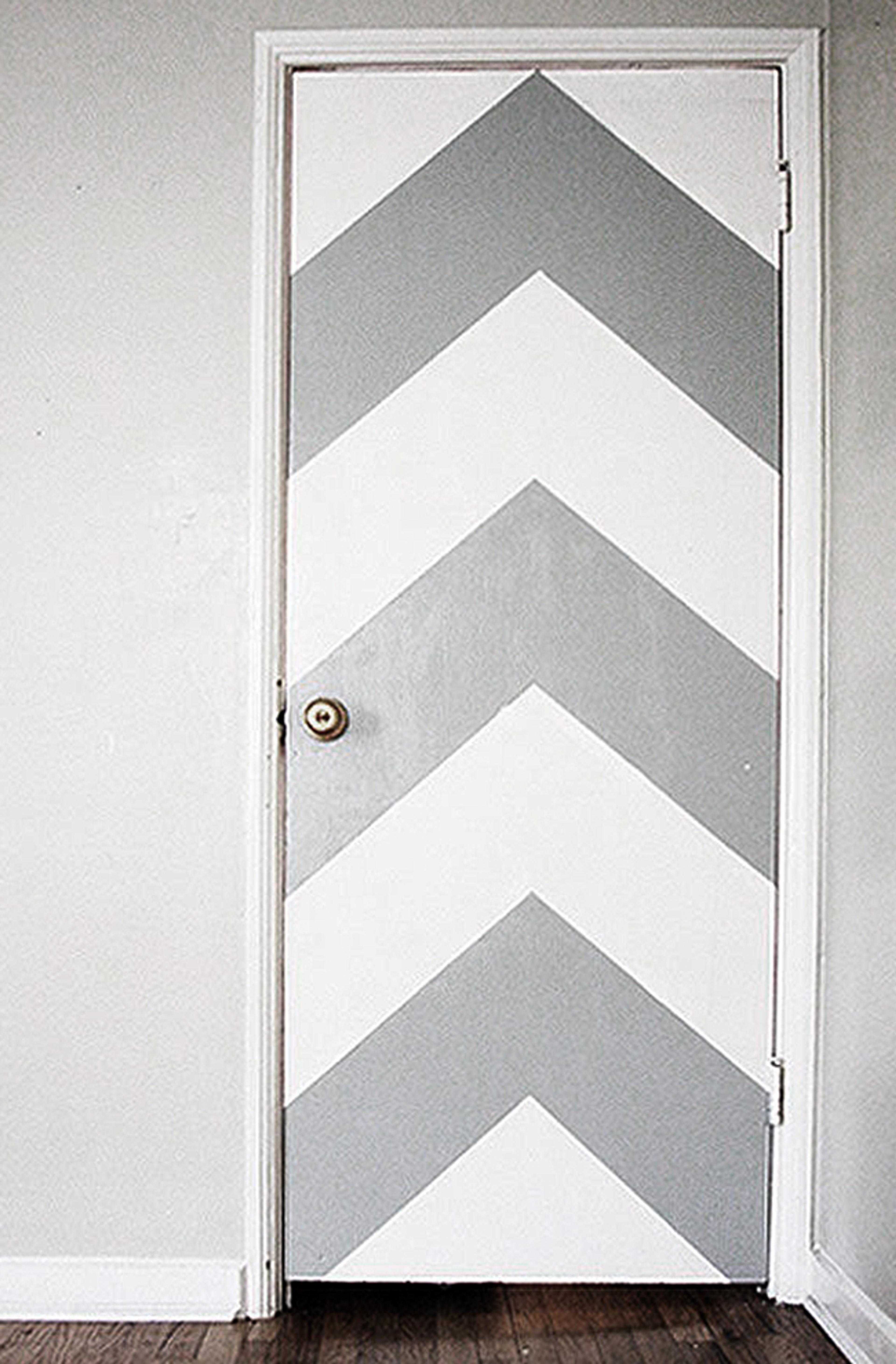Mange bad har flislagte, hvite vegger. Fint, men det kan fort bli litt kjedelig også. Døren til badet kan brukes som dekorelement og med maskeringstape, linjal, vater og litt maling får du en kjempekul effekt i et ellers rolig interiør.