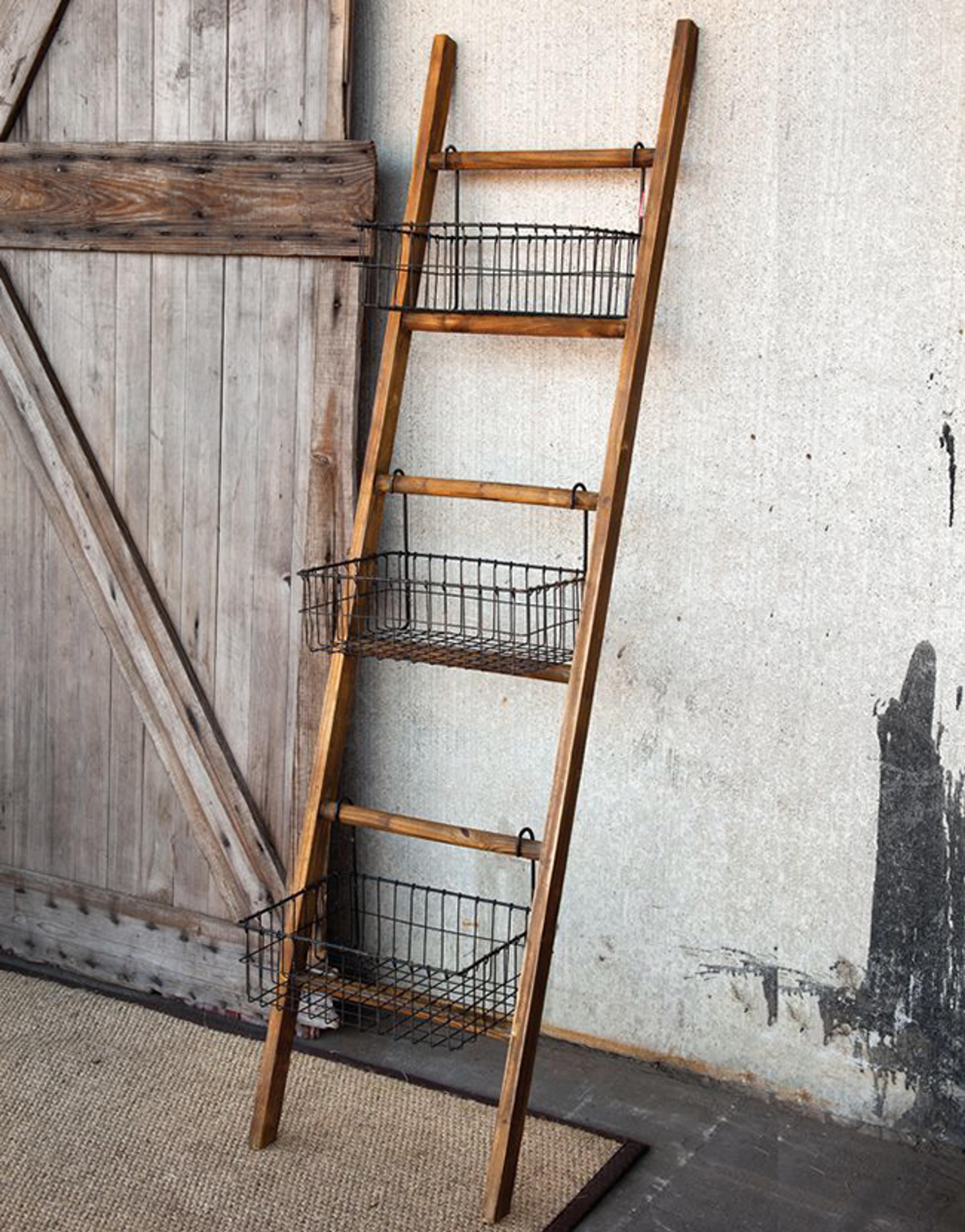 Stige brukt som håndkleholder/tørker har vi sett en stund. Men en gammel stige kan også bli en fin hylle hvis du henger noen trådkurver på stegene. Du kan kombinere ved å la de to øverste stegene være til kurver og resten til å henge håndklær på.