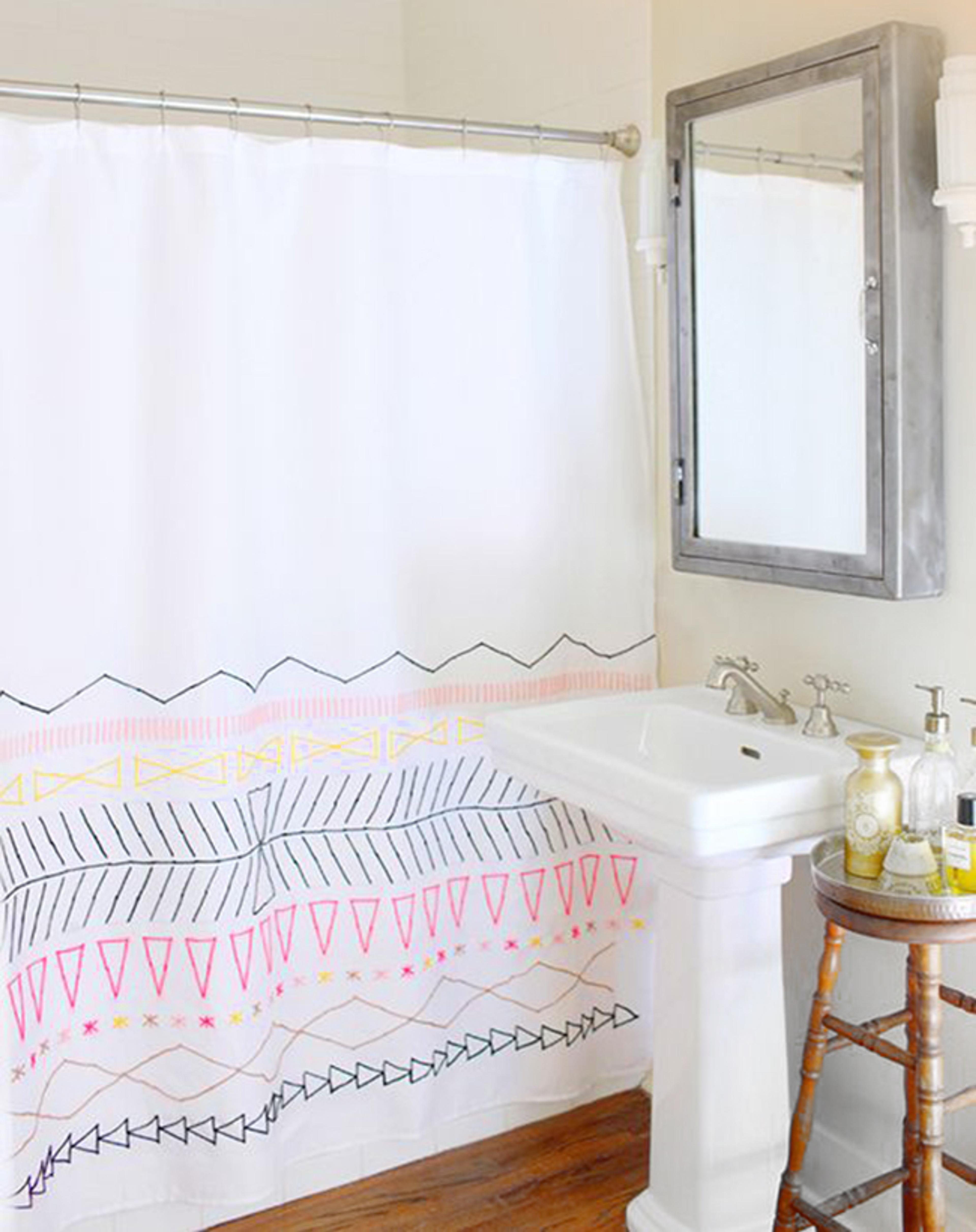 Et kjedelig hvitt dusjforheng blir kjempeaktuelt og dekorativt med et geometrisk mønster i glade farger. Den tålmodige kan sy på mønsteret med tråd/garn som tåler vann. Den utålmodige kan bruke vannfast dekortusj. Det er lurt å skisse opp med en linjal og en bløt blyant først.