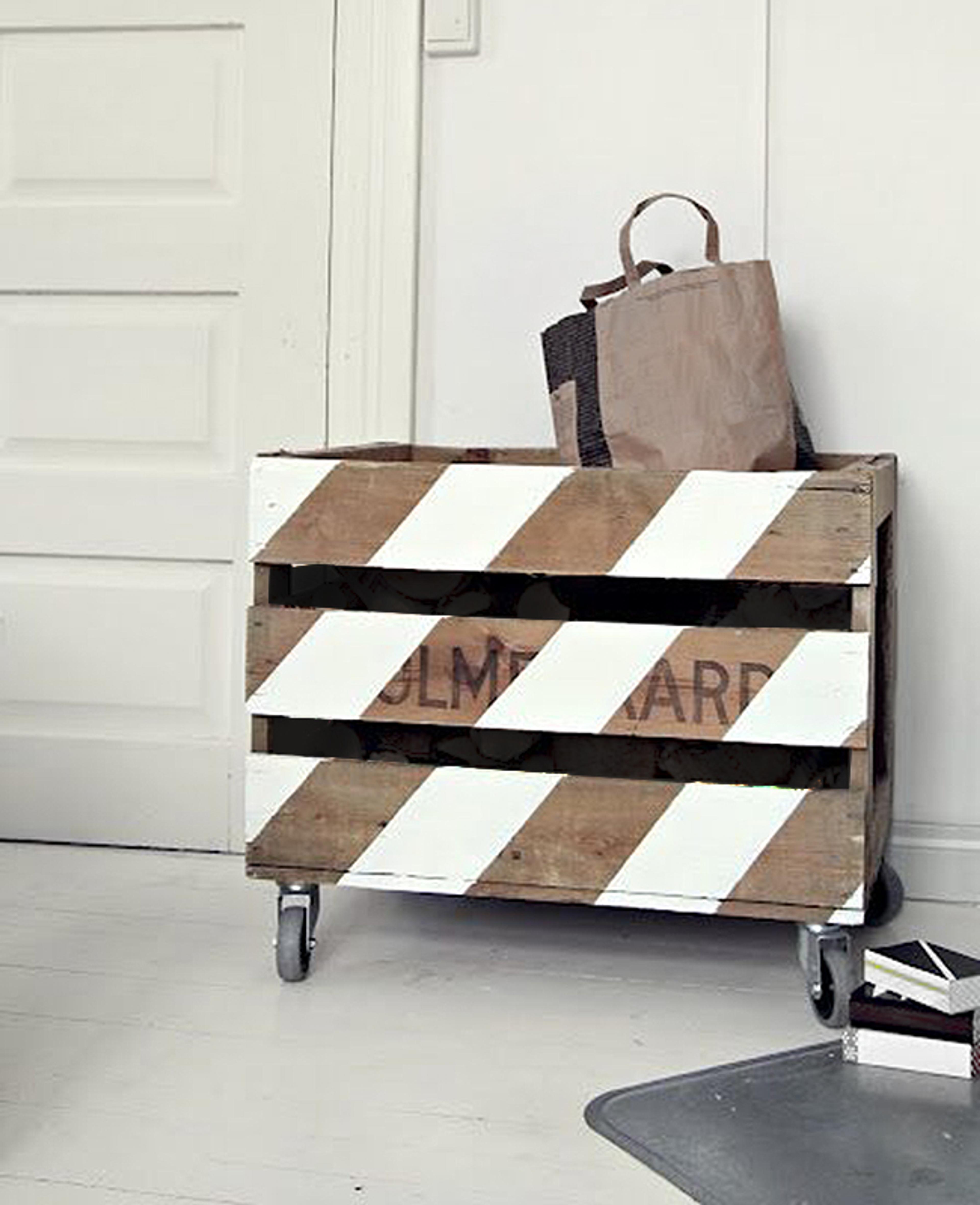 En gammel eplekasse kan brukes til oppbevaring av håndklær. Mal et fint mønster på og sett på noen hjul. Spesielt lurt hvis du har et trangt bad, da kan du flytte kassen rundt etter behov.