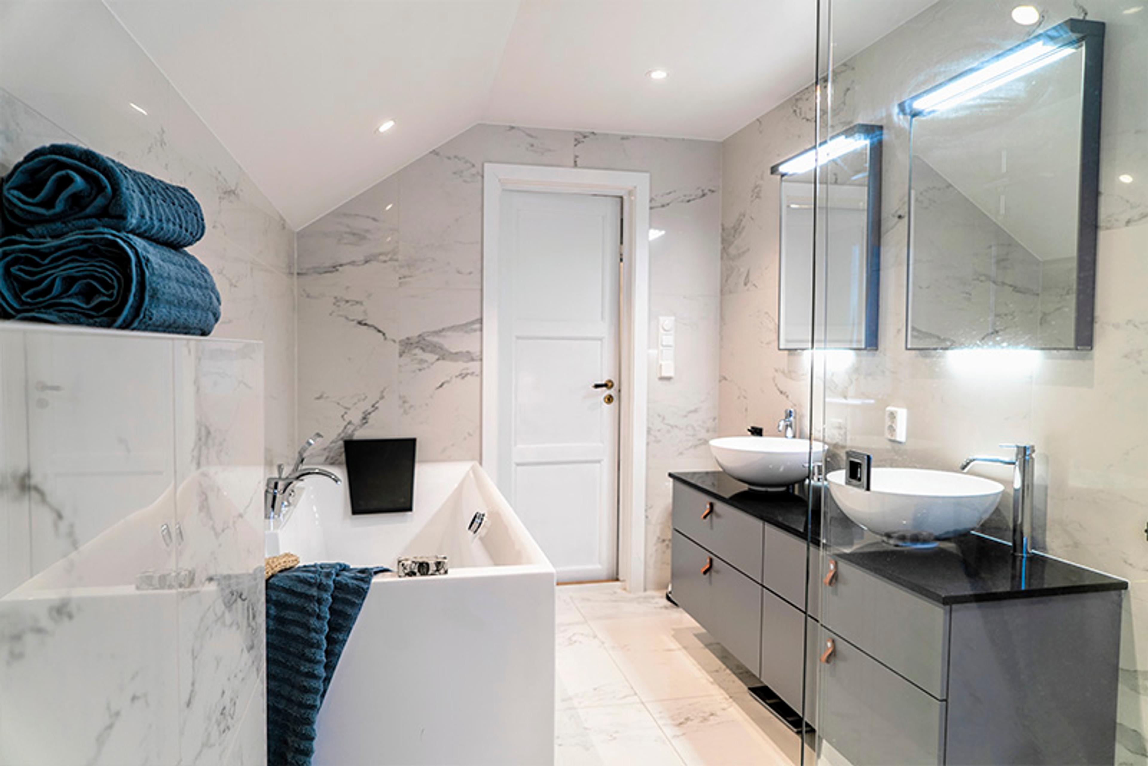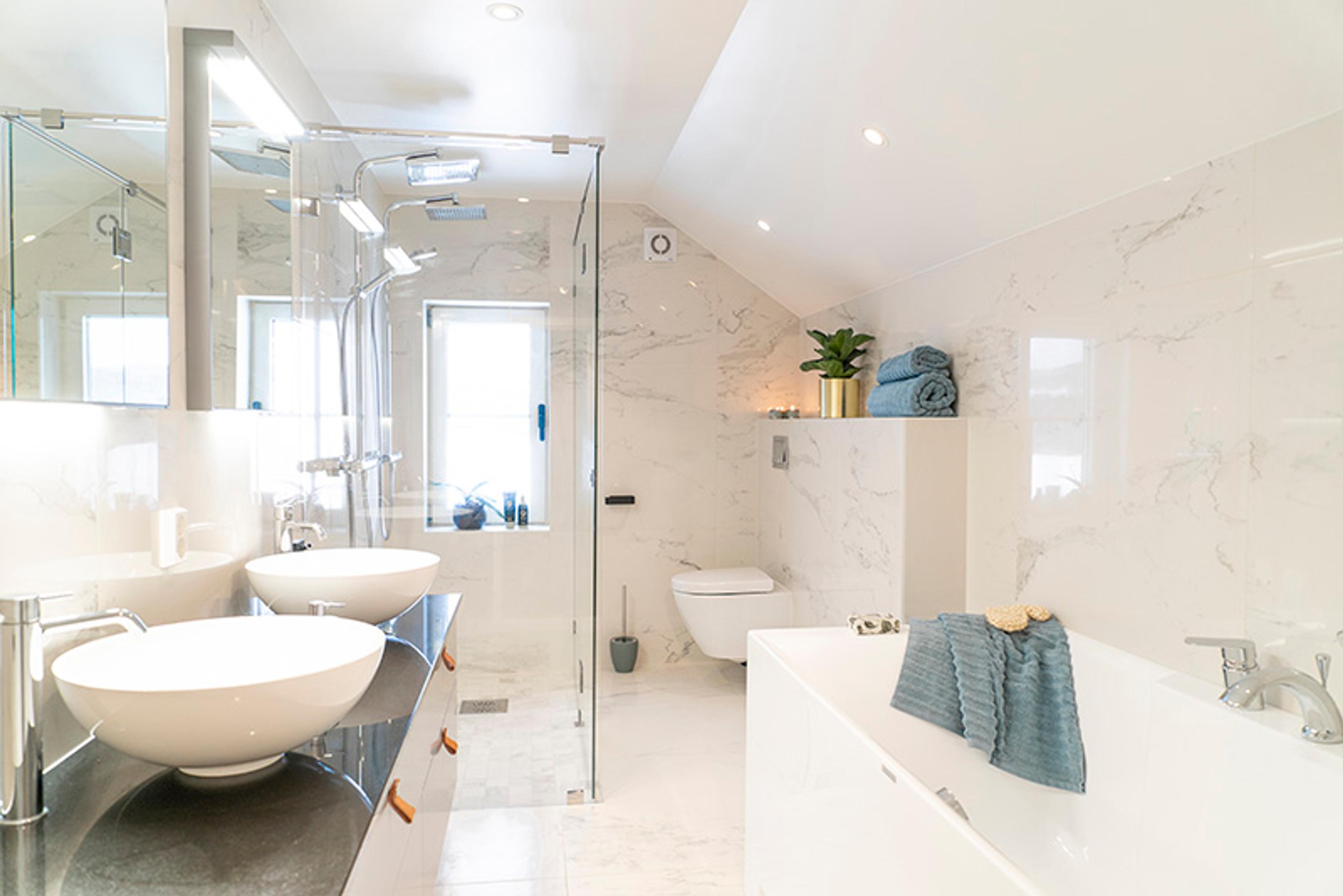 Det var hun som tok hovedansvaret for å finne fram til riktig stilretning på prosjektet. – Jeg har jo vært innom alt fra Pinterest til bloggere og interiørmagasiner for å hente inspirasjon fra ulike stiler, former og farger. Men det var noe vi bare skulle ha. Badekar, dobbel dusj og to vasker sto på kravlisten fra starten av. Så jeg hadde en ferdig tegnet skisse da jeg kom til Bademiljø. Og det var godt å bli møtt med en så stor forståelse for alle våre ønsker. De var rett og slett veldig løsningsorienterte og virket veldig entusiastiske over våre innspill, forteller Kirsti. – Vi hadde en bestilling og et ønske, og de har fulgt opp med alt det praktiske, skyter Petter inn.