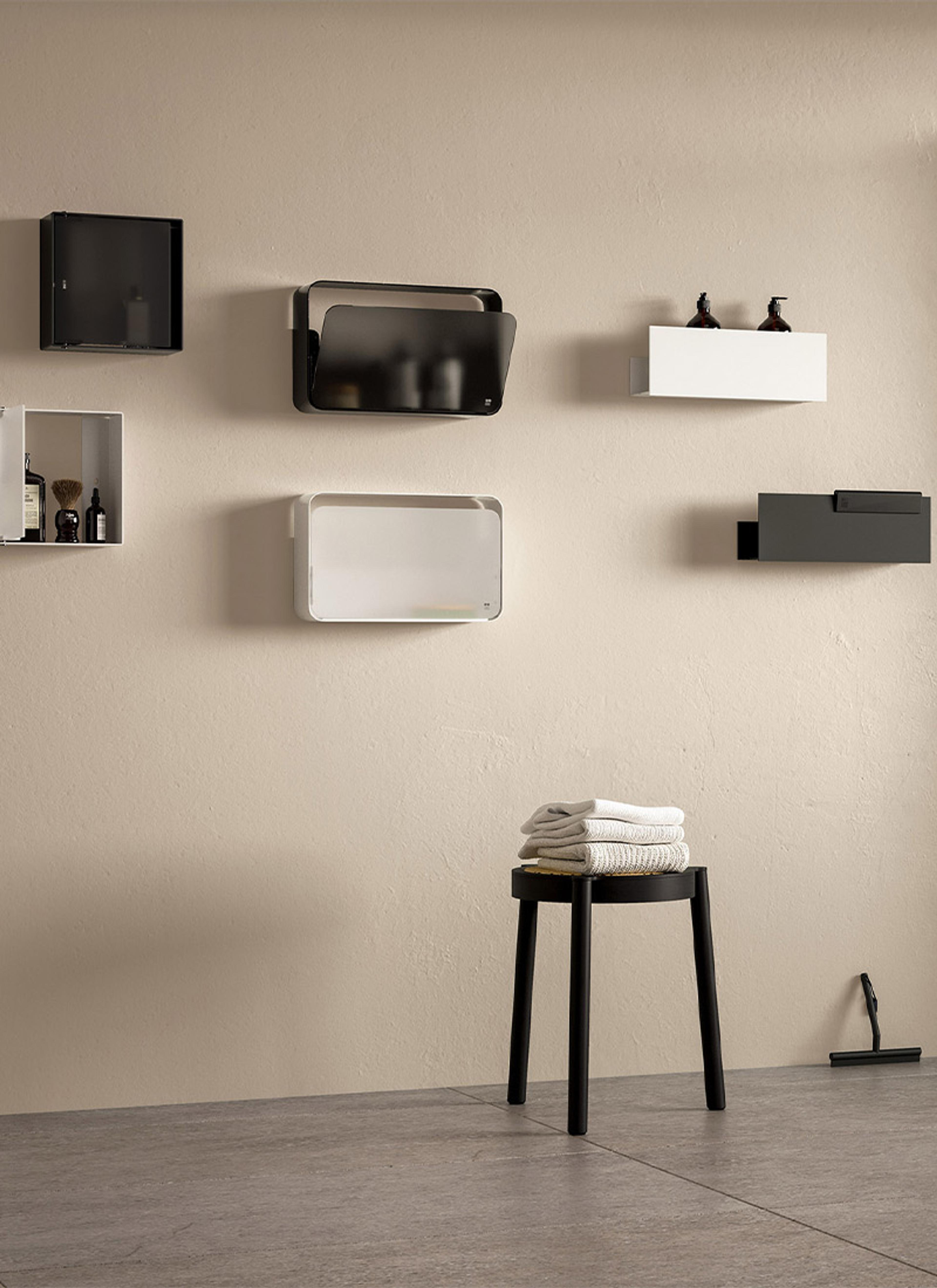 DUSJRO: Med skapene NEST og CASE fra INR holder du flaskene godt skjult, på veggen i eller utenfor dusjen. Vipp ut den frostede døren, og hent ut produktene du trenger – når du trenger dem. Dessuten er de lette å montere, da skapene leveres med systemet INR "Safe-Fix". På den måten slipper du å bore hull i flisene. Sjekk også ut PILE!