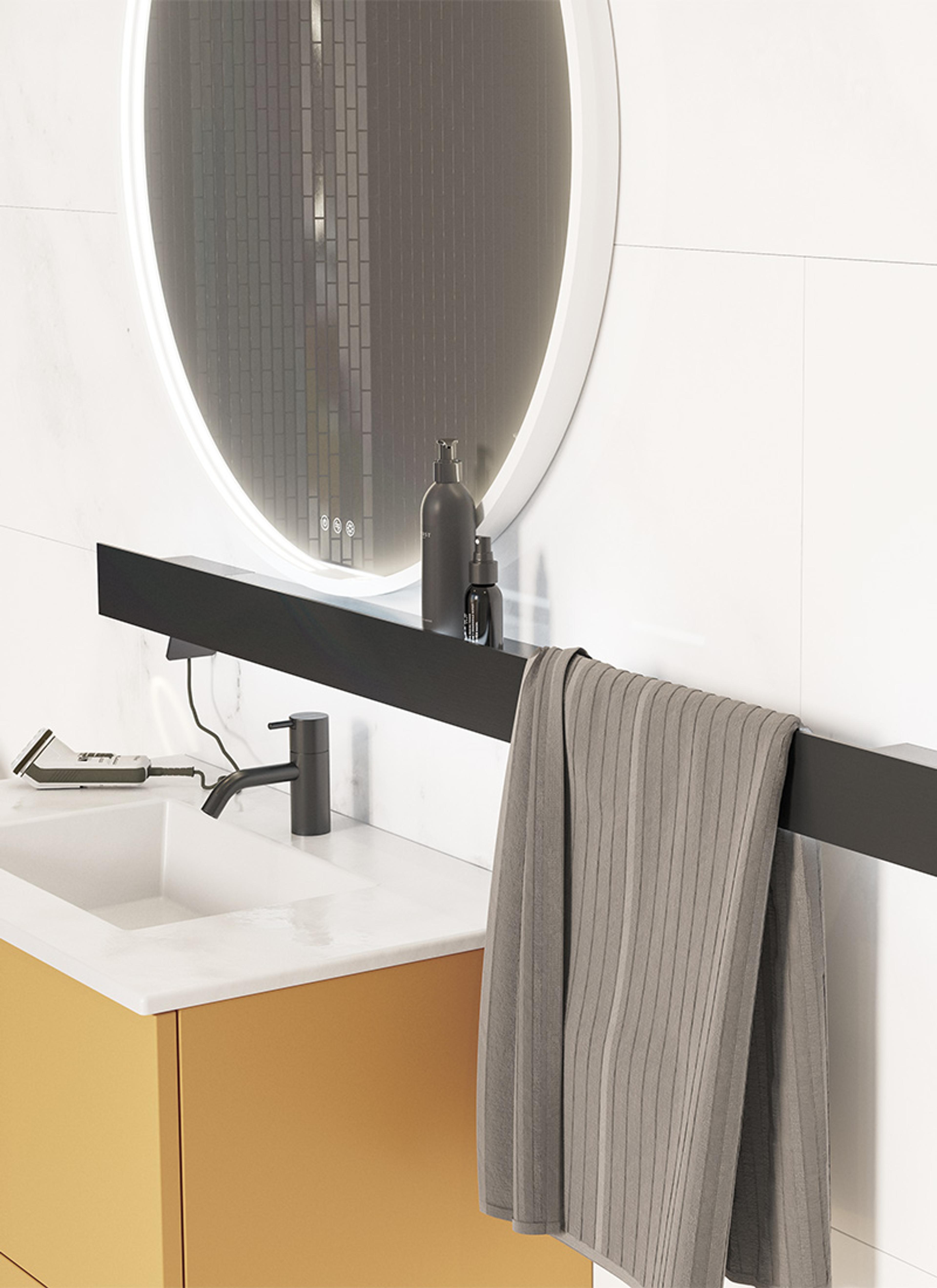 Veloverveid tilbehør som gjør hverdagen på badet litt enklere, og vakrere. Bak enhver fasade kan det skjule seg høy funksjonalitet. Med integrert stikkontakt i baderomsmøblene kan du flytte hårføneren, barbermaskinen og den elektriske tannbørsten ned i en skuff eller inn i et skap.