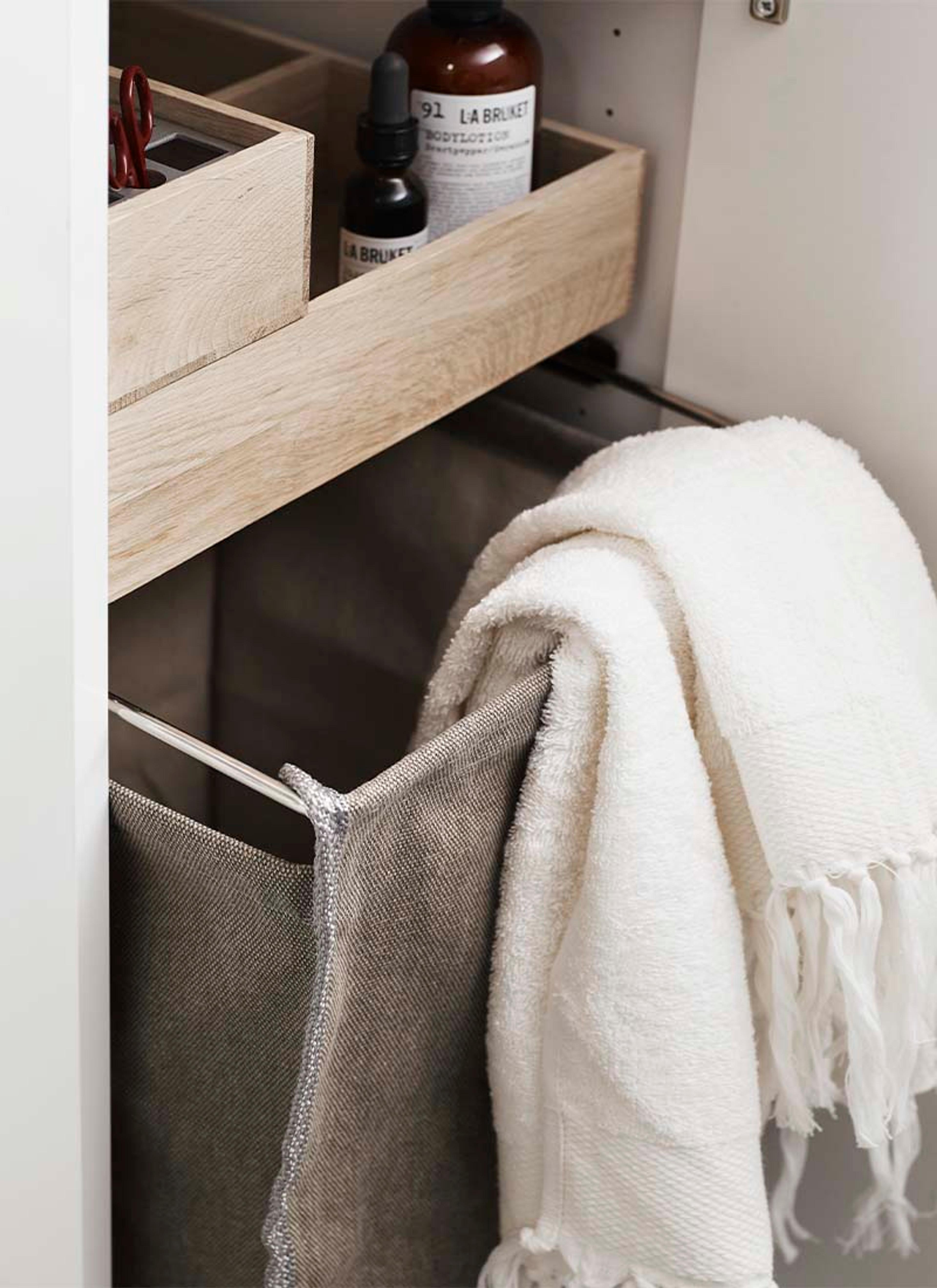 GJEM BORT SKITTENTØYET: Praktisk skittentøykurv med uttrekk skjult i høyskapene fra Dansani.