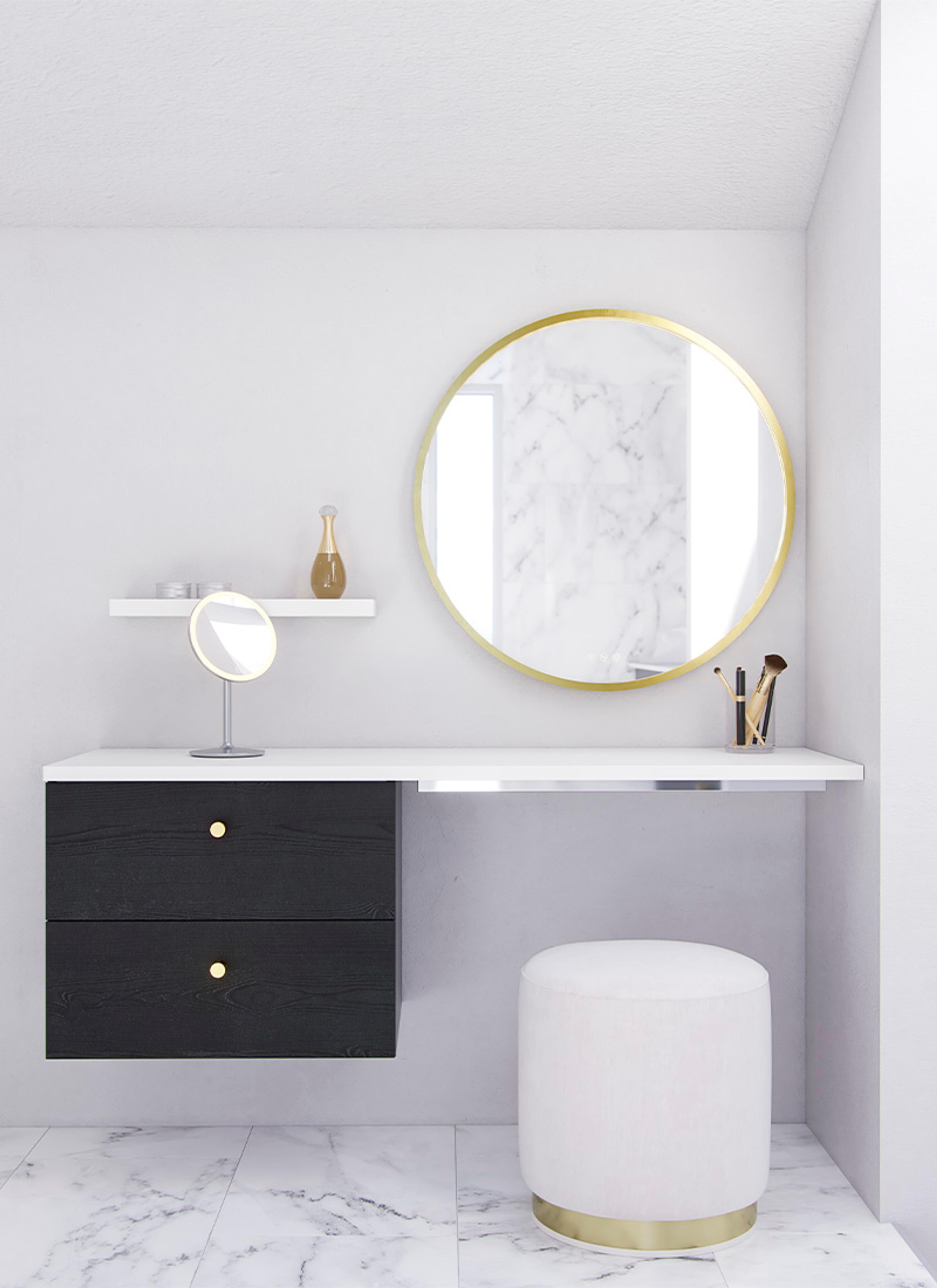 SMINKEKROK: Med en lang benkeplate kan du få en fin sminkeplass på badet. | Dansani Inzo baderomsmøbel.